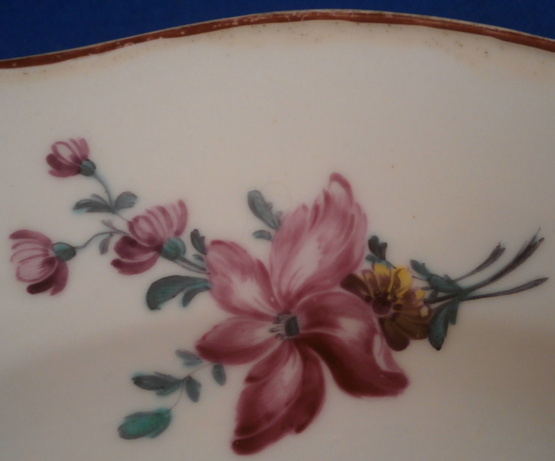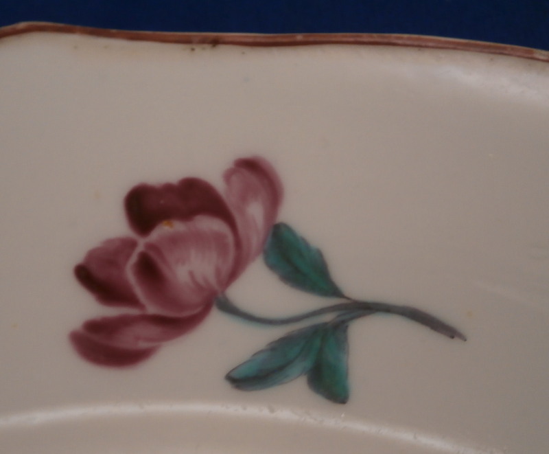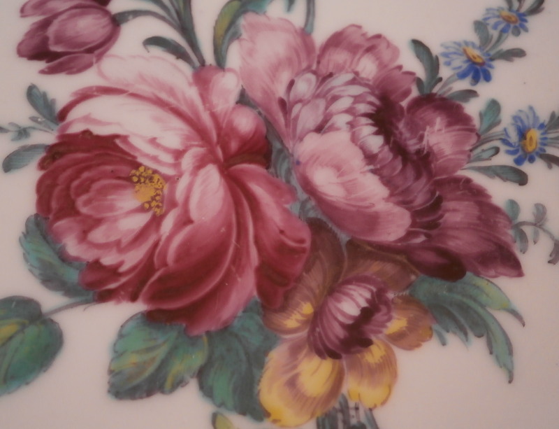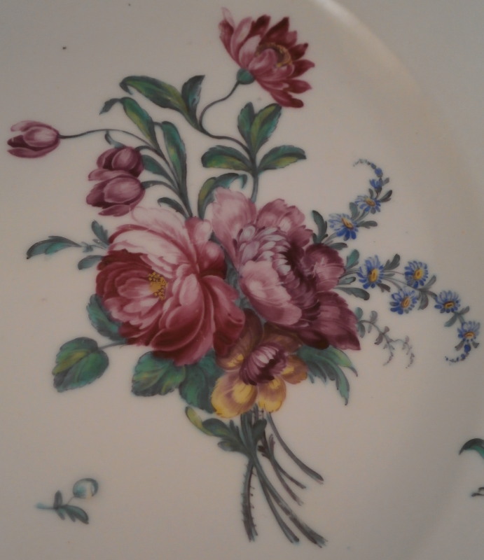 This is another superb plate made by Tournai in the 18th century. Made of soft paste porcelain and hand painted with a their best quality flowers in polychrome and a reddish brown trim to the nicely shaped edge. There is one large floral arrangement as well as a smaller one with threesmaller flowers and two leaves leaves scattered around. I think Tournay flowers are among the very best of the porcelain world. They are amazing and the soft paste porcelain and its enamels are just perfect. Very hard to find. The plate is in excellent condition with a little bit of wear to the glaze normal to softpaste porcelain but the flowers are not really affected by it. The plate has firing flaws that are mainly to the underside which has a lot of little black flying ash black dots from the firing process. Tiny bit to the edge as well as shown. The top is fine as you can see from the pictures. The piece is not marked underneath except for an incised b or q type mark which is fairly normal on Tournay pieces of this period but has the typical green translucency, etc. The plate is just over 1 inch tall and 9.25 inches in diameter. Please email me for more information or other pictures.