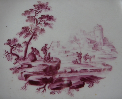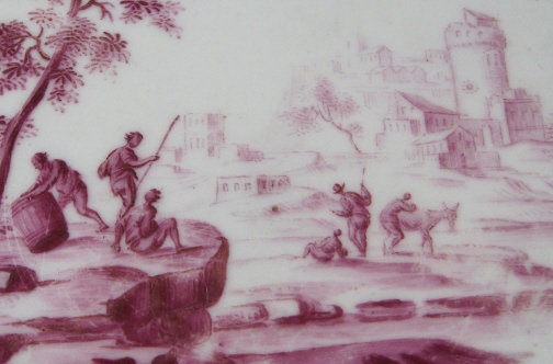 This is a bowl or very large saucer made made by Tournai ( Tournay ) around 1770. It is hand painted with a superb puce scene including people, a donkey, a castle, a tree and so on. This piece was possibly painted by the famous Henri-Joseph Duvivier (during 1763-71) who is very well known for his puce scenic pieces. The plate is softpaste and a beautiful creamy white color. It is in great condition with a bit of wear and I assume there used to be a gold trim to the rim edge which is completely gone now but it might have never been there - just a guess. The plate is marked underneath with the gold crossed swords mark with the little crosses all around and has a partial old collection sticker underneath as well. It is 1.25 inches tall and 6.5 inches in diameter. Please email me for more information or other pictures.