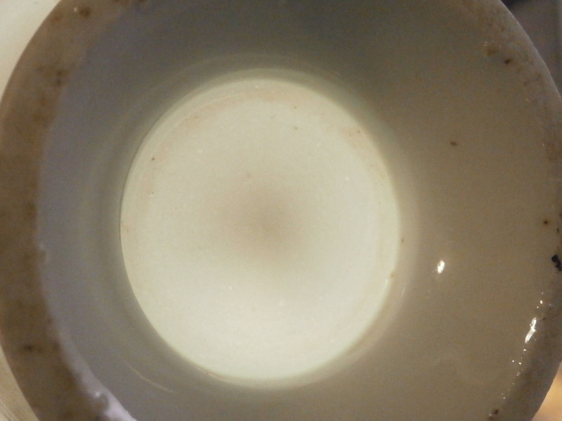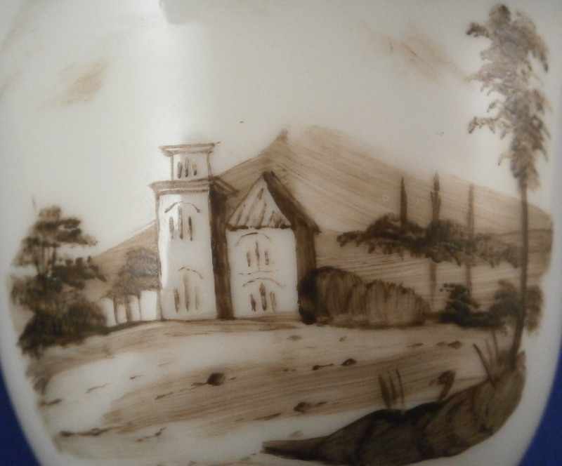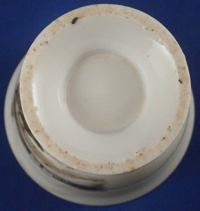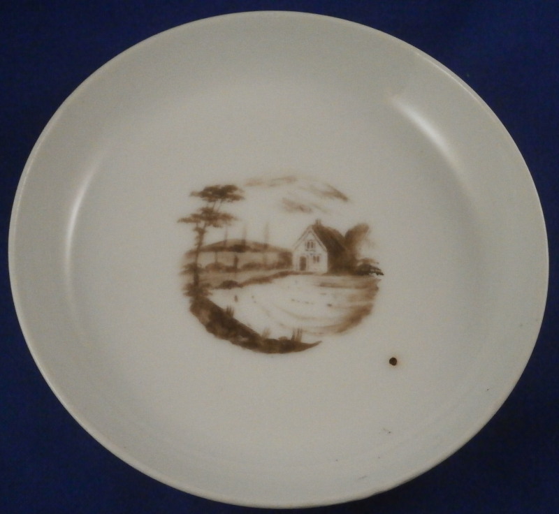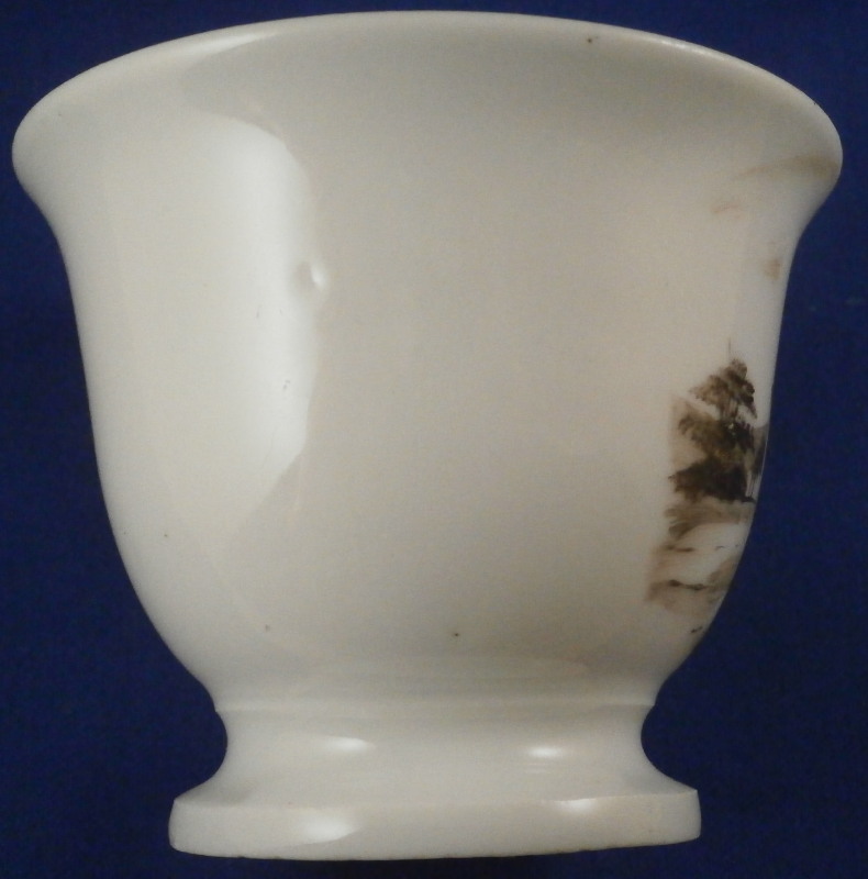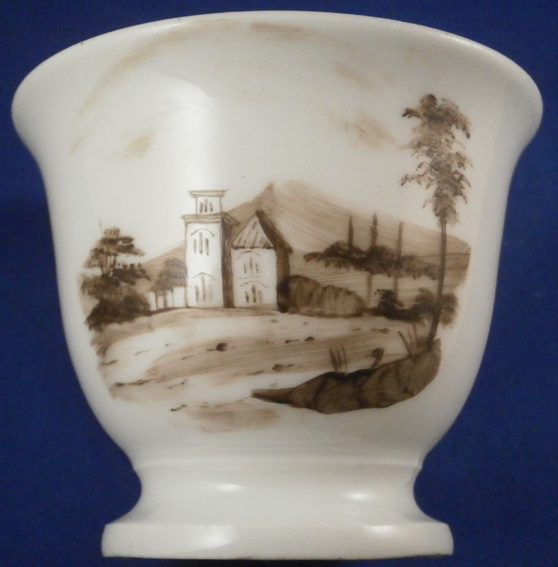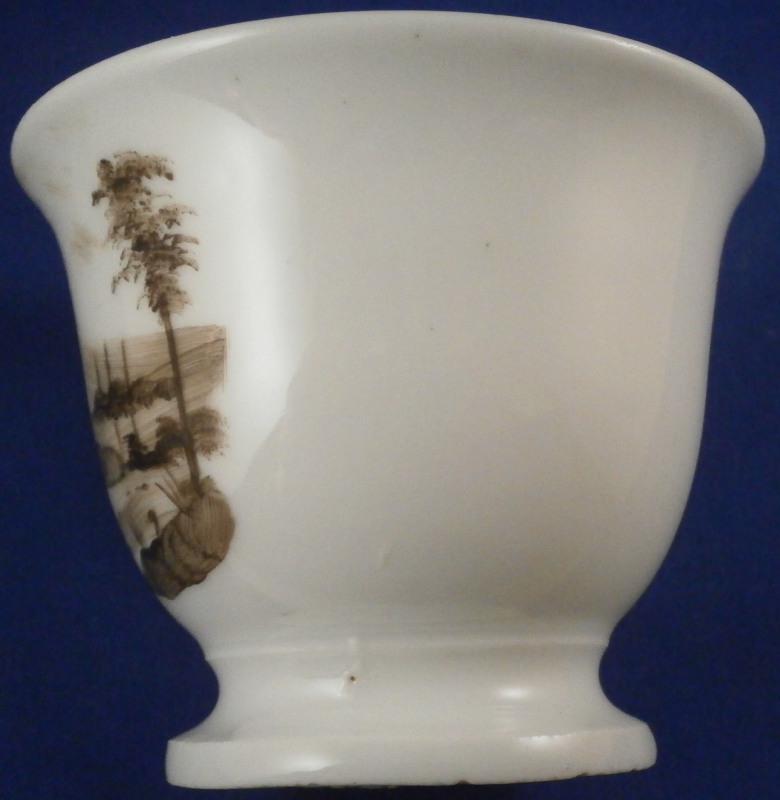 This is a rare treat I have always wanted to own. A cup and saucer made by the Tucker factory which was located in Philadelphia in about 1830. The Tucker factory, one of the first successful porcelain factories in the US, was established by William Ellis Tucker in 1826 at Center Square, the site of Philadelphia’s current City Hall. William Tucker died in 1830 after which his brother Thomas Tucker oversaw the day-to-day operations and design while investors like Judge Joseph Hemphill and the Commonwealth of Pennsylvania were able to provides the funds. They produced porcelain that rivaled popular European porcelain of the same date. The factory closed in 1838. The set is quite typical in terms of shape and decoration with a little twist - the cup being handleless which was done at the factory but was not originally meant to be this way. More on that later. The saucer is decorated with a nice sepia colored scene in the center of a building in a landscape surrounding. The cup has a similar scene to it that is a bit darker in shade likely due to the scene of the saucer being worn over the years from the bottom of the cup moving over it. The saucer is in great condition with a large firing fault to the bottom right of the scene where there was an impurity to the paste that burnt away during the firing process and left a brown hole. There is a a small chip to the edge of the rim that doesn't take away from the piece. The cup is in great condition though it was originally meant to have a handle but something must have happened and it was decoded to get rid of it. That is before the glaze was applied and it is all original this way! The only way to tell is when you shine a light through the cup you can still see where the handle was once attached. Probably collapsed during the first firing. The glaze of the piece have the typical light hint of blue to them and the shape of the cup is typical of this maker as well. You can see similar pieces in the Philadelphia museum of Art which has the largest colelction of Tucker porcelain. The cup is about 2.875 inches tall with a diameter of 3.5 inches. The saucer is just over 1 inch tall and has a diameter of 5.625 inches. Neither piece is marked which is the norm. Please email me for more information or other pictures.