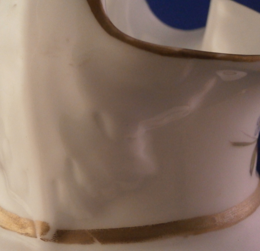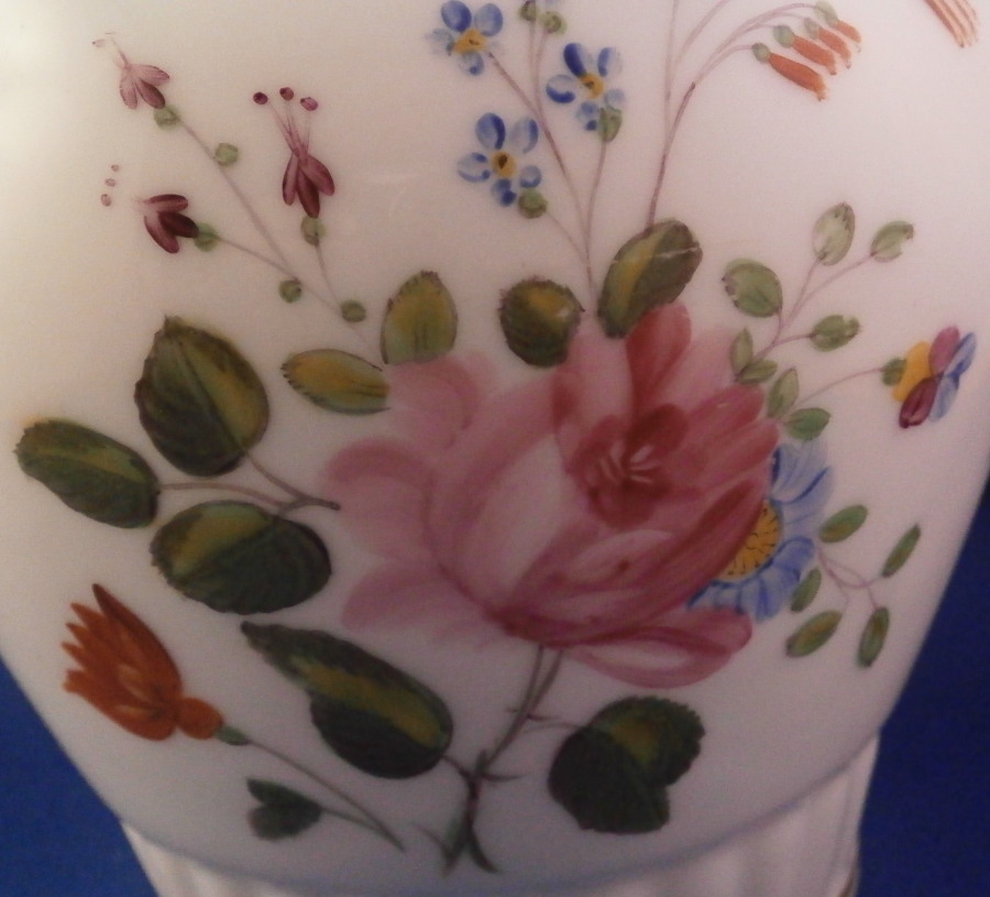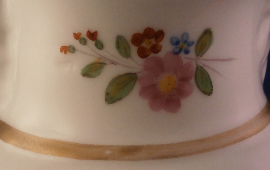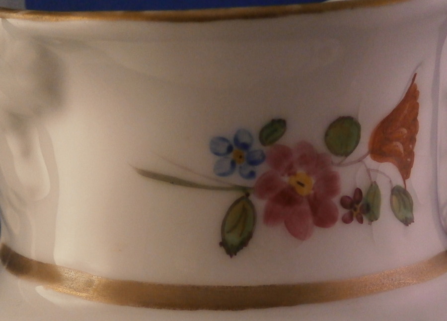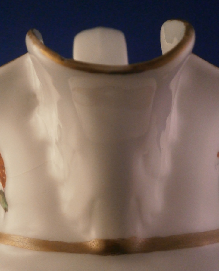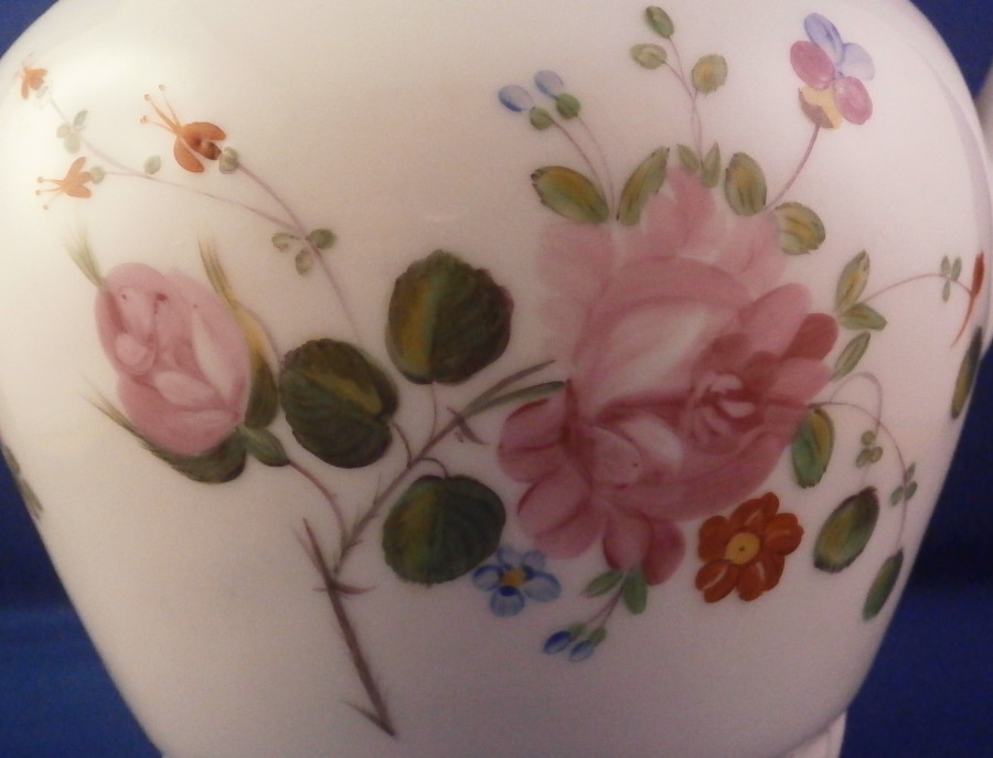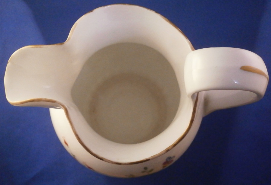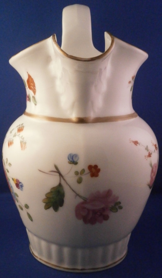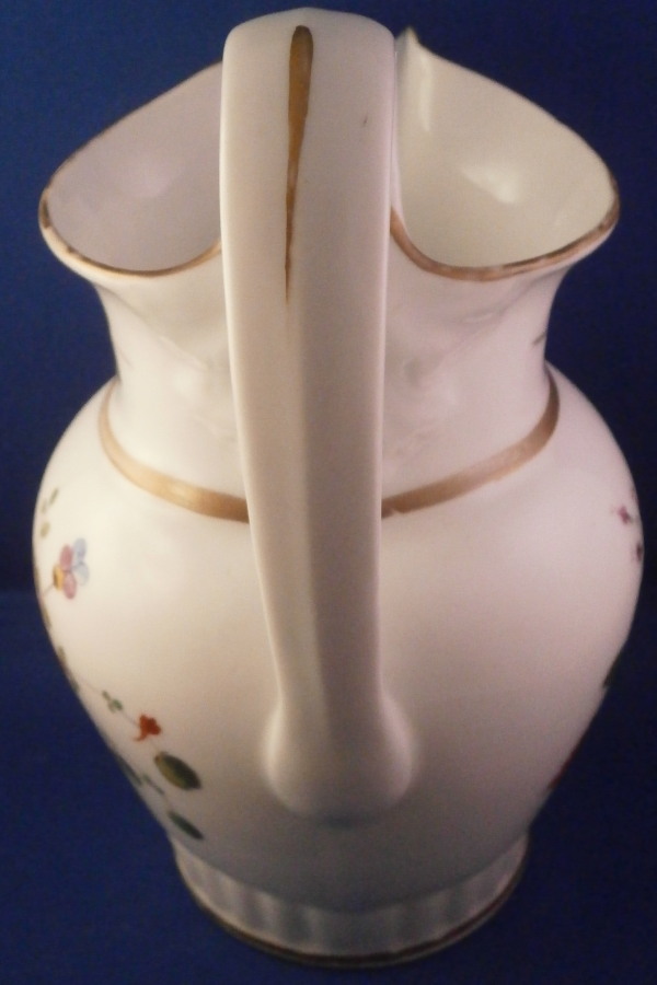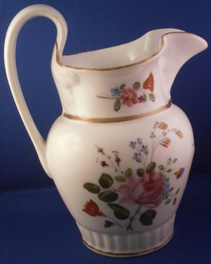 This is something special - a nice pitcher made by the Tucker factory which was located in Philadelphia in about 1835. The Tucker factory, one of the first and most successful of the porcelain factories in the US, was established by William Ellis Tucker in 1826 at Center Square, the site of Philadelphia’s current City Hall. William Tucker died in 1830 after which his brother Thomas Tucker oversaw the day-to-day operations and design while investors like Judge Joseph Hemphill and the Commonwealth of Pennsylvania were able to provides the funds. They produced porcelain that rivaled popular European porcelain of the same date. The factory closed in 1838. The jug is very typical in terms of shape which helps give it away in terms of identifying the maker. The gilding is another thing that is different for Tucker from say Paris pieces as it wore more easily and the color is different as well. Translucency helps as well with the identity of the maker. The pitcher is hand painted in ploychrome with a large floral arrangement on either side with a smaller one to the front and two small one to the top sides. The top handle terminal and spout underside have a relief design to them as does the bottom. A nice example for this maker and not something you see every day either though the pticher is one of the more "common" item by this maker! A superb piece and I even have its matching companion piece if anyon e would like a pair which is extremely rare! The piece is in great condition with a small nibble to the spout edge which might be from when it was made as the gilding goes over it and some glaze lines (not in the porcelain!) on the ones side by the top flower arrangement as shown from when it was made. Typical wear to the gilding and one scratch in a leaf but all in all as nice as one can find! A couple more glaze lines to the inside only. You can see similar pieces in the Philadelphia museum of Art which has the largest collection of Tucker & Hemphill porcelain. The pitcher is about 9.375 inches tall, 7.5 inches from handle to spout tip and 5.5 inches in diameter. Unmarked which is the norm. Please email me for more information or other pictures.