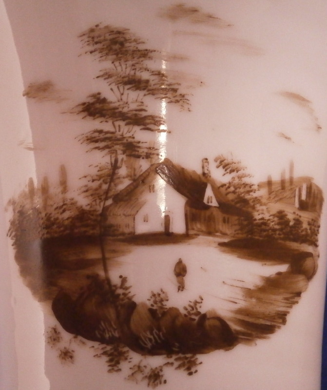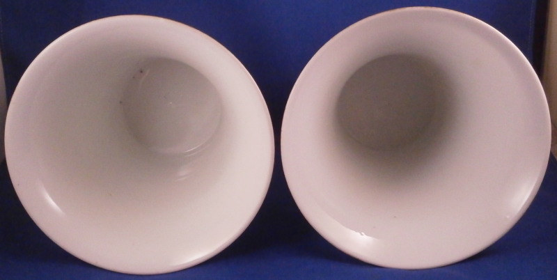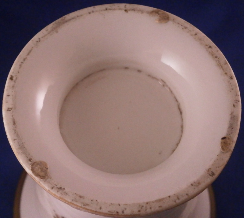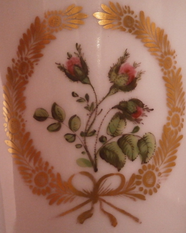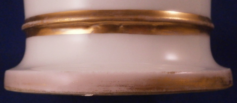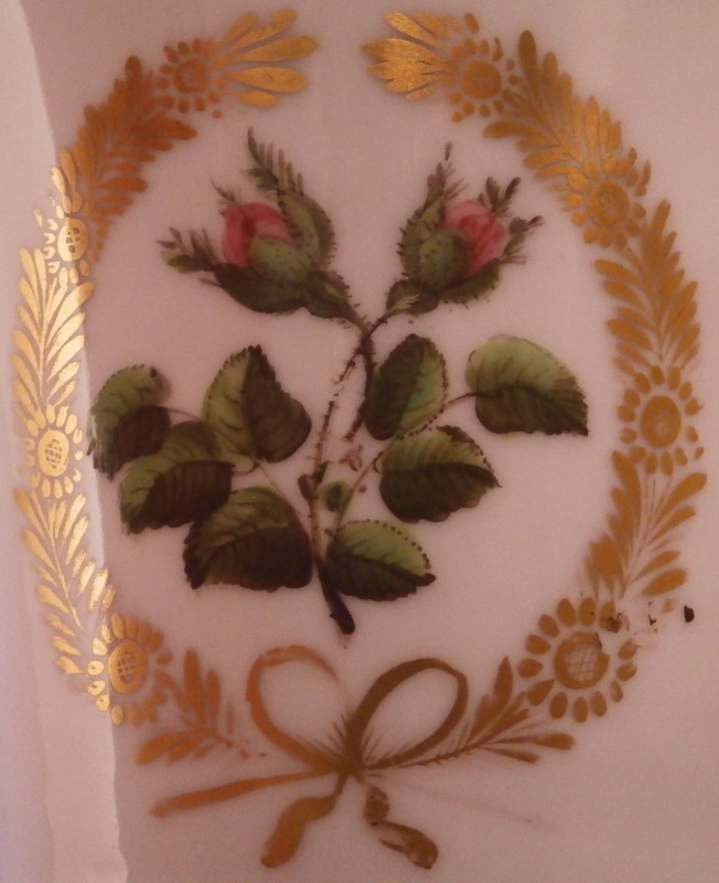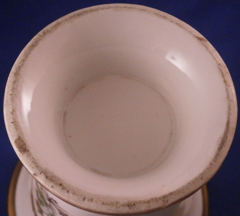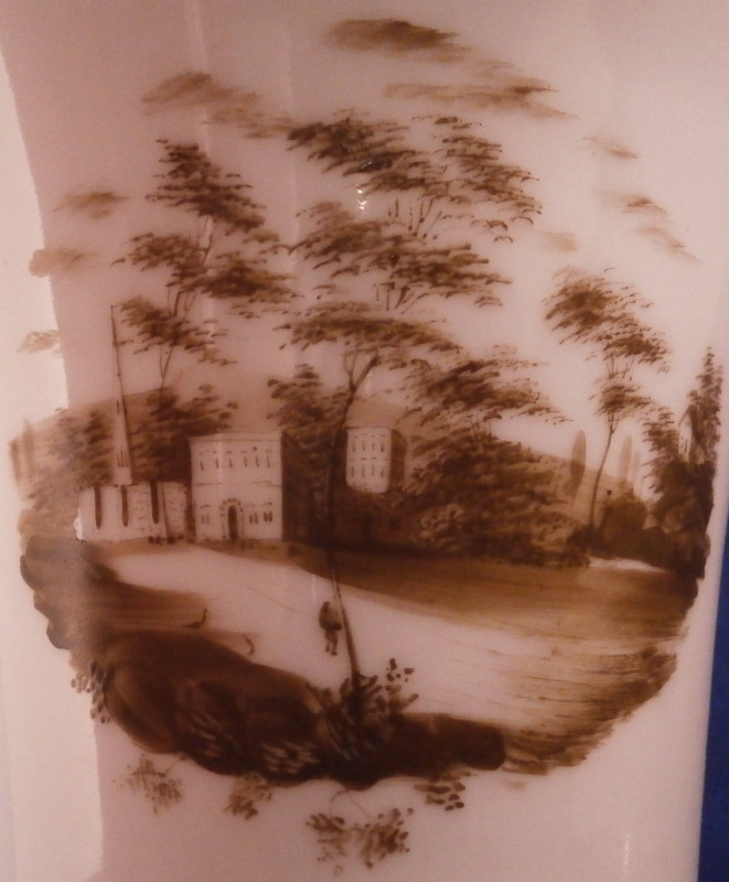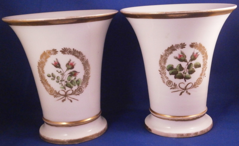 This is something special - a pair of vases made by the Tucker factory which was located in Philadelphia in about 1830. The Tucker factory, one of the first successful porcelain factories in the US, was established by William Ellis Tucker in 1826 at Center Square, the site of Philadelphia’s current City Hall. William Tucker died in 1830 after which his brother Thomas Tucker oversaw the day-to-day operations and design while investors like Judge Joseph Hemphill and the Commonwealth of Pennsylvania were able to provides the funds. They produced porcelain that rivaled popular European porcelain of the same date. The factory closed in 1838. The pair is quite typical in terms of shape and each vase has a hand painted sepia colored landscape scene to the front including buildings and a person, gold trim to the edges but my favorite part is the hand painted rose buds to the back with its leaves surrounded by their typical gilding. Just superb pieces and to have a pair is extremely rare! The vases are in great condition with some minor firing flaws to the paste aand the typical wear to the gilding but no chips, cracks, restorations, etc. The glaze of the piece have the typical light hint of blue to them which gives it a slightly blue translucency when you shine a light through them. You can see similar pieces in the Philadelphia museum of Art which has the largest collection of Tucker & Hemphill porcelain. Each vase is about 6.25 inches tall with a diameter of 5.75 inches. Neither piece is marked which is the norm. Please email me for more information or other pictures.