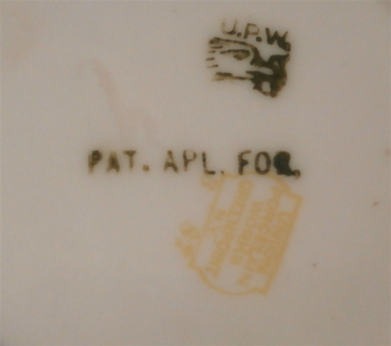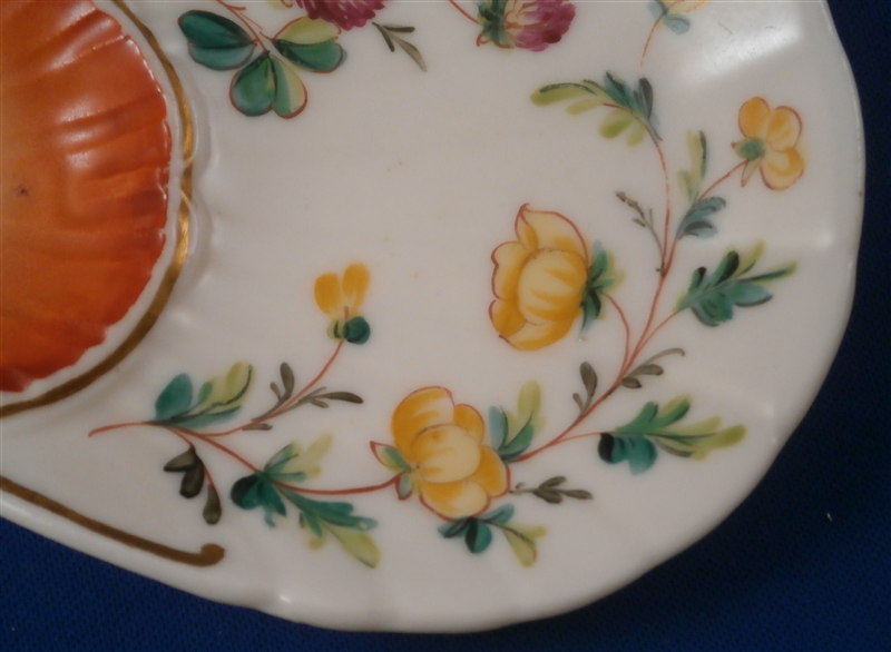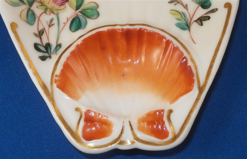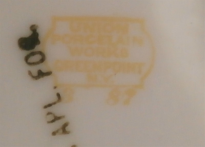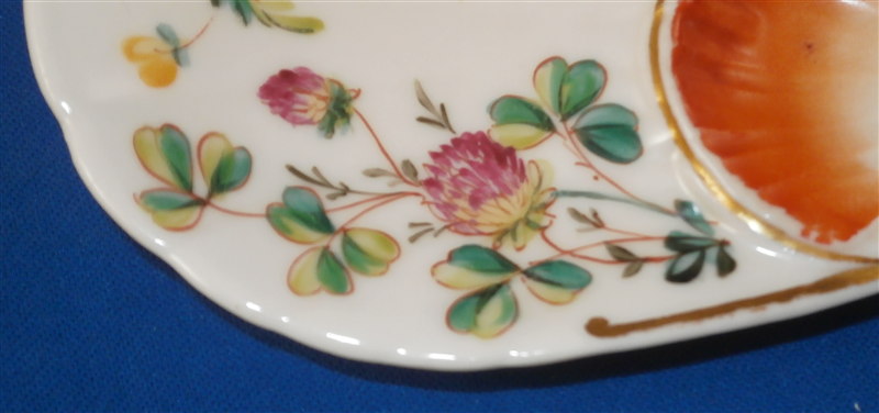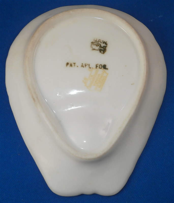 This is a very rare and fun oyster shooter made by the Union Porcelain Works in the later 19th century around 1887. Some of their oyster plates are quite rare but these single oyster shooters are even raresr and I have never seen one as nice as this! It is nicely shaped and molded as a shell with a smaller shell in orange for the saucer. Superbly handpainted with two flowers and some gold trim. These are highly collectible! American porcelain after all is much less common than its European counterparts. The dish is in perfect condition with some very minor wear. It is about 0.75 inches tall, 3.5 inches wide and 4.375 inches long. It is marked as shown on the underside with the U.P.W. over the eagle's head in green as well as a PAT. APL. FOR under it and their yellow Union Porcelain Works Greenpoint NY mark as shown. Please email me for more information or other pictures.