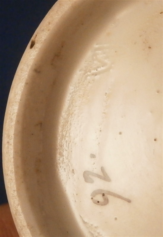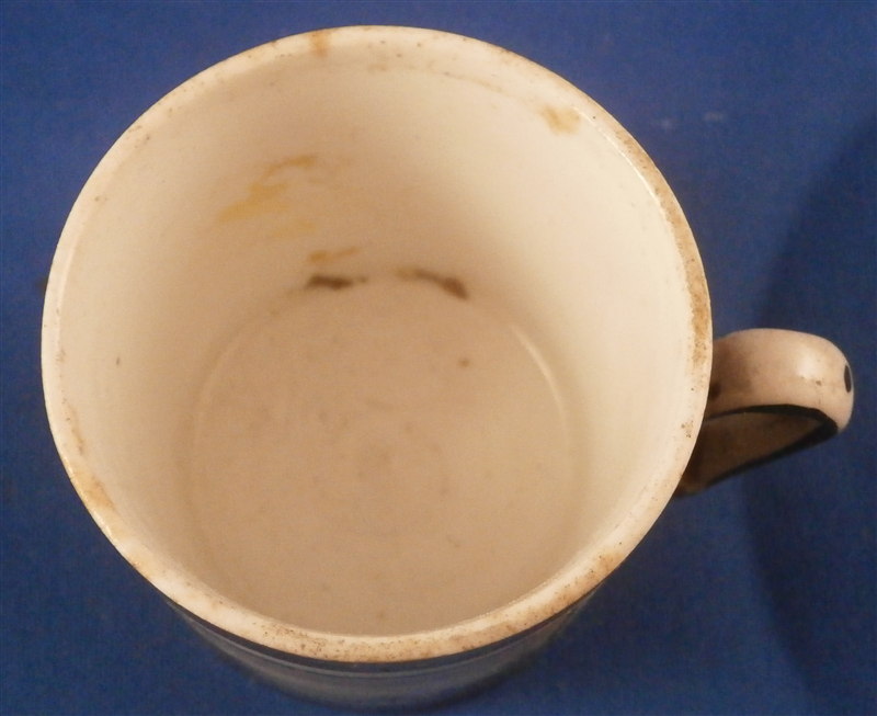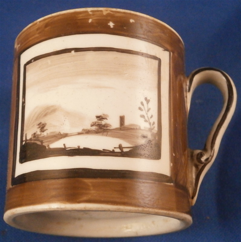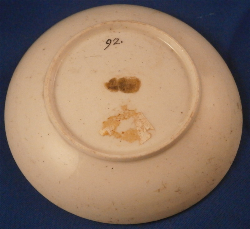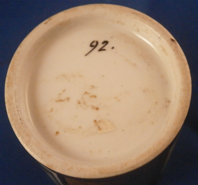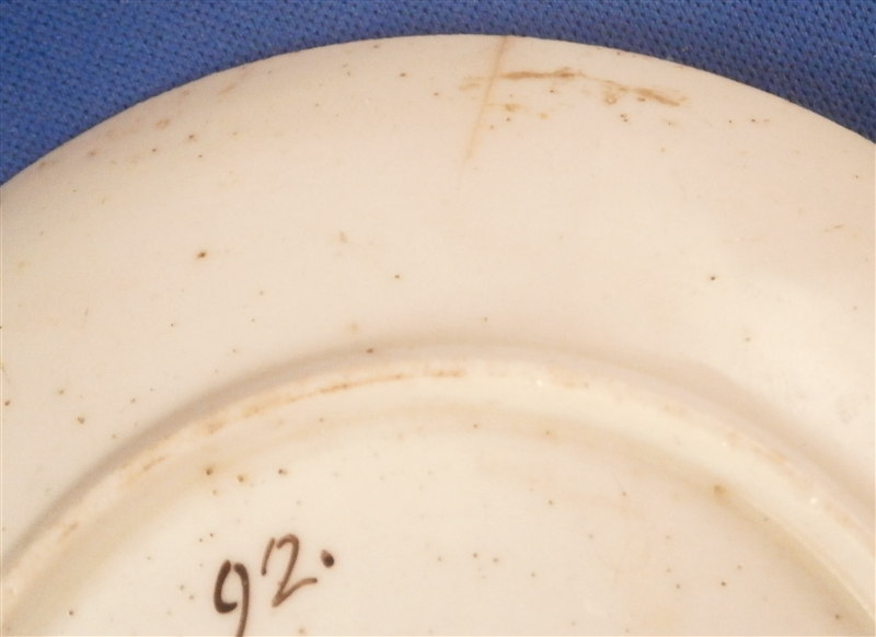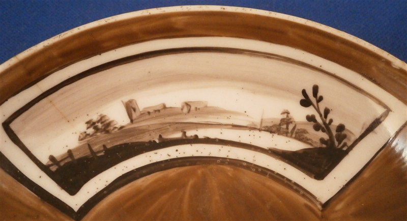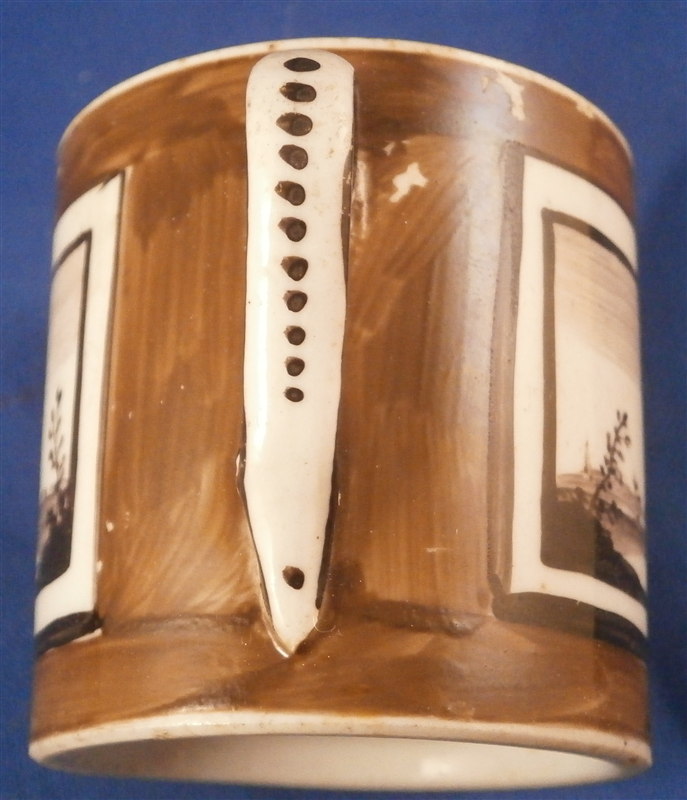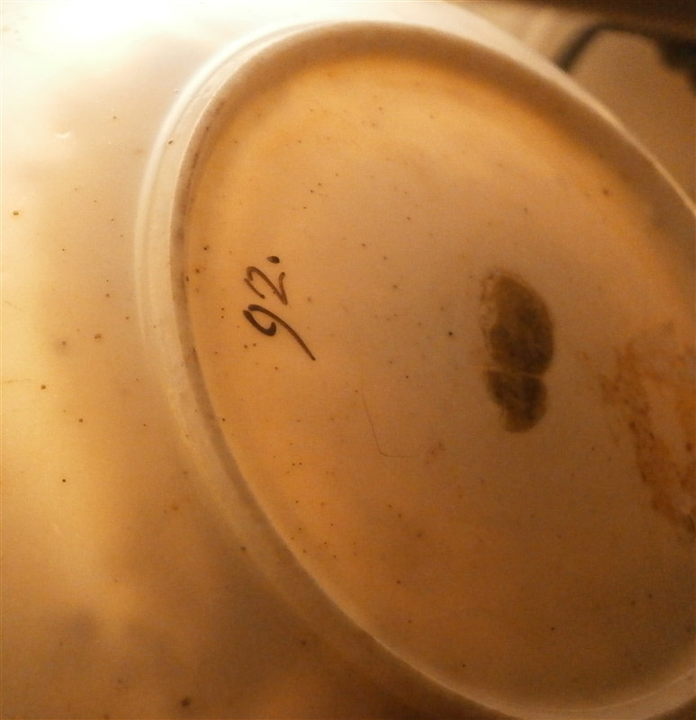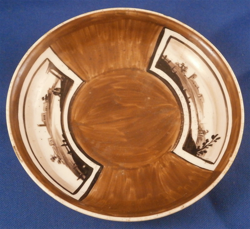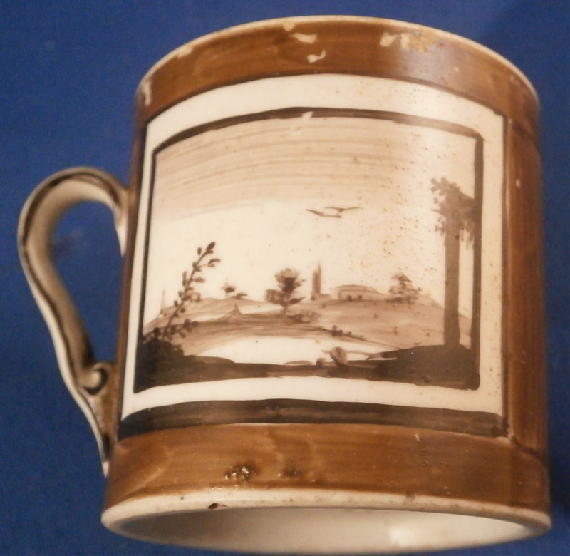 This is an interesting cup and saucer made by an unknown maker in the 18th century. I am fairly sure it is Italian by the paste but I have not seen anything like it. The set is handpainted with a brown ground color that seems to have been meant to imitate the famous woodgrain design also called trompe-l'oeil and it has a similar type of scene design to it as well. Each piece has two black scenes of buidlings in landscapes surrounded by a black frame. The handle shape is unusual and interesting and should lead me to the maker eventually :) The set is in good condition with a little flaking to the bown ground color on the cup and a fine hairline to the saucer edge. Lots of flaws to the paste which can mainly be seen on the saucer udnerside including a large spot in the center where it must have stuck to the kiln. The set displays nicely. The cup is 2.125 inches tall and 2.125 inches in diameter. The saucer is 0.875 inches tall and 4.5 inches in diameter. Both are marked with a number 92 in black. Please email me for more information or other pictures.