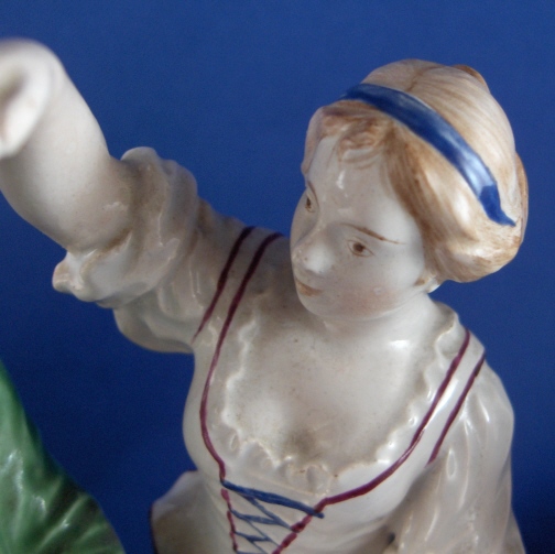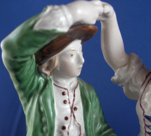 This is a figurine of a man playing the violin while a couple dances made by St. Clement in the 18th century. It is handpainted with good detail and of high quality. The figure is made of faience and rings a bit metallic when hit with your fingernail. The piece is in great condition with the end of the violin missing, the bow missing the end as well and a few small flakes of the color missing but not many and it does not distract from the piece at all! It is unmarked but certainly was made by St. Clement. The figurine is 7.25 inches tall, 6.75 inches wide and 4.125 inches deep. Please email me for more information or other pictures.