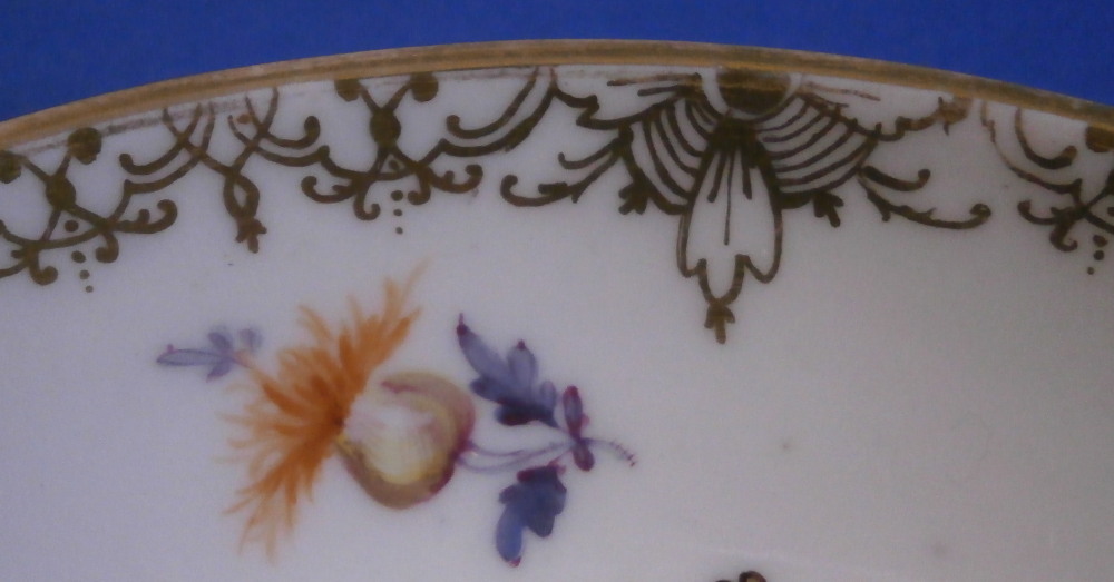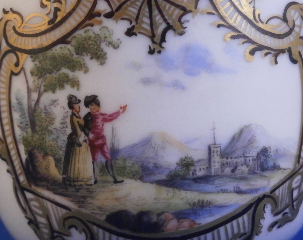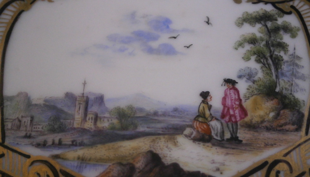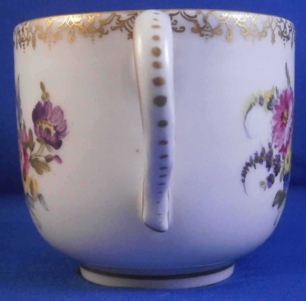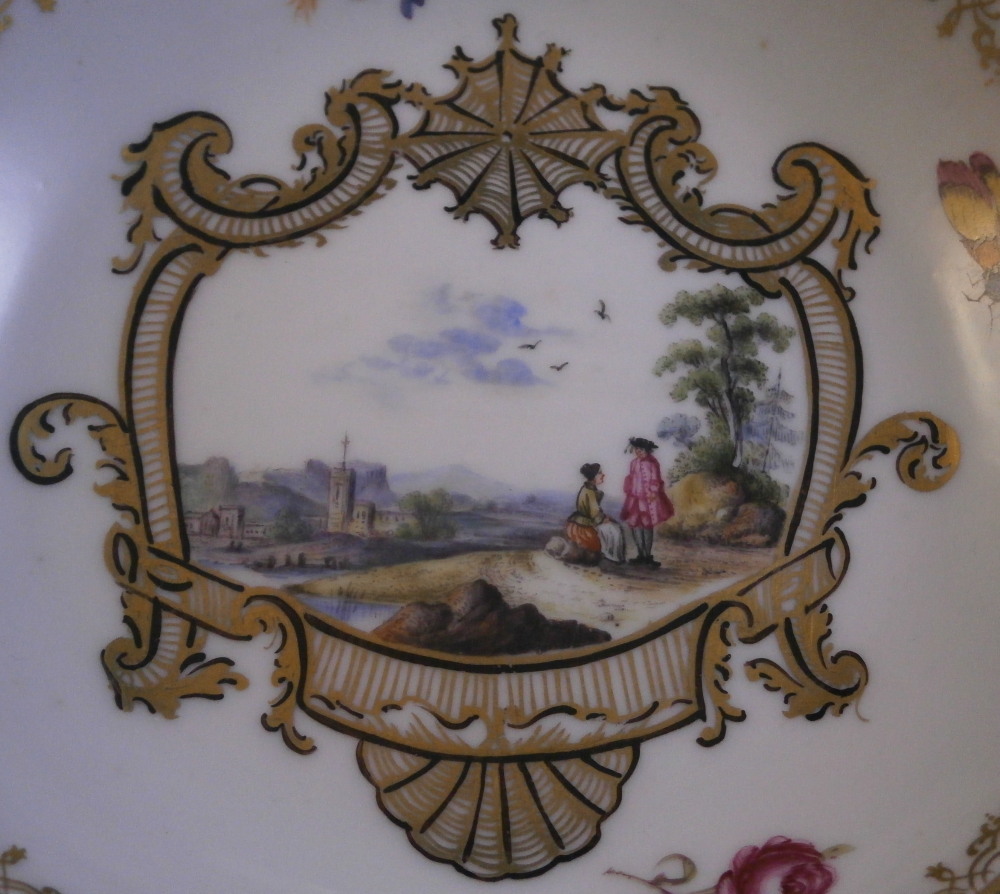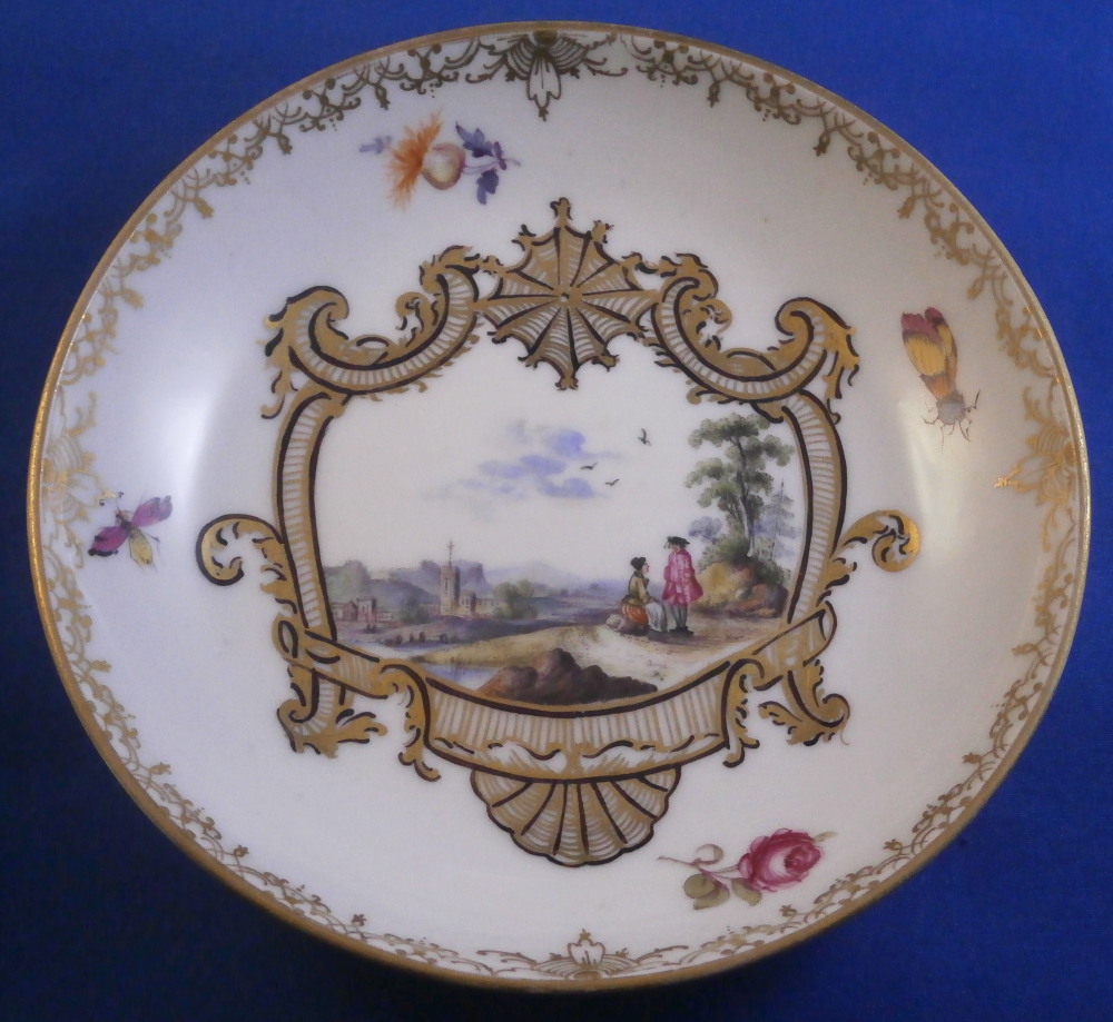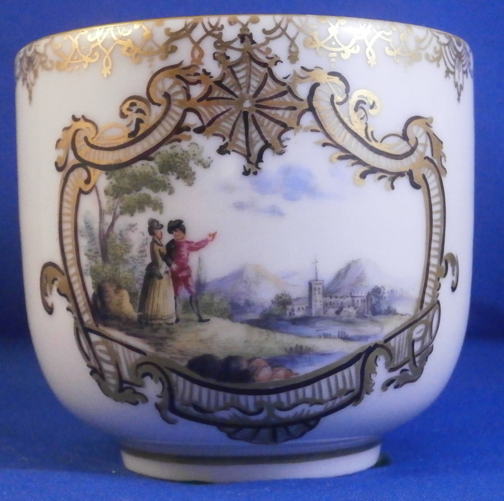 This is a great scenic cup and saucer made in Germany probably in the later 19th century. Not sure as to the maker but it is superbly hand painted with a scene in the center of the saucer as well as front of the cup. Both include people in a landscape surrounding including buildings and lots of greenery. The scenes are surrounded by a fancy gold and black trim design. The rest of the space on the saucer is filled with two smaller single flowers as well as two insects and on the cup with two floral arrangements. Fancy gold trim to the rims and some gold trim to the handle of the cup as well. Both pieces are marked underneath with a crown mark with possible a CC under that though it is a bit faint to make out. The hand painting is of very god quality. The cup is just under 2.625 inches tall and 2.75 inches in diameter. The saucer is just over 1 inch tall and has a diameter of 5.375 inches. Both are in superb condition with some very minor wear to the gilding of the edges. A very nice set meant to look like an 18th century Meissen example which it is not. Please email me for more information or photos.