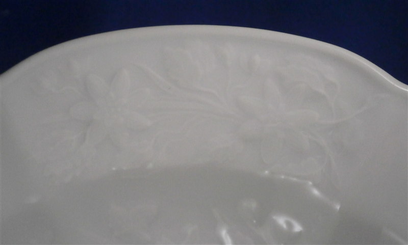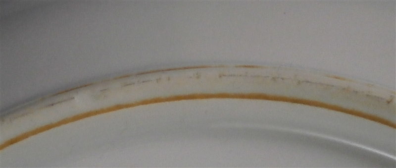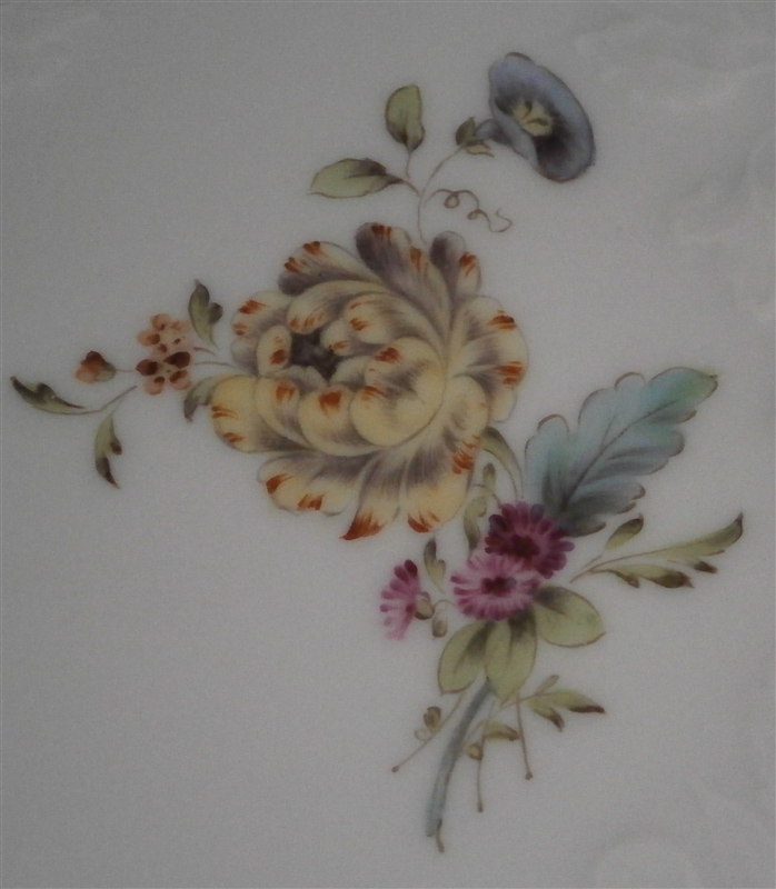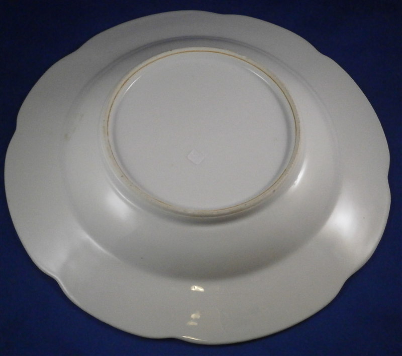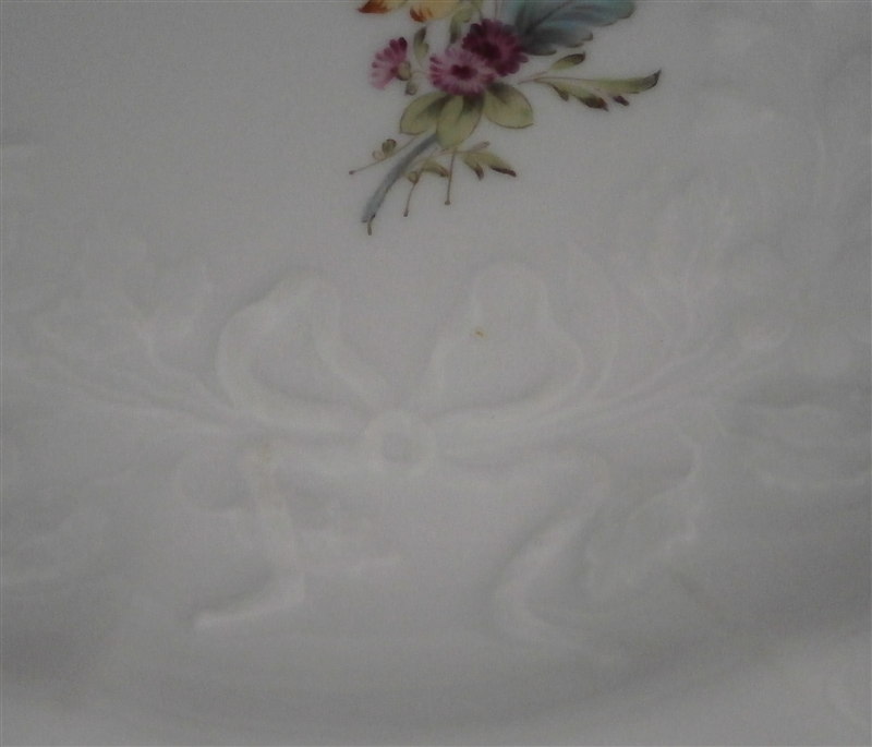 This is an odd plate. It has the shape, relief decoration and painting of an 18th century Hoechst plate but strikes me as a 19th century piece. I cannot quite figure this one out. The plate has lots of relief flower decoration held together with a bow in the well, four small flowers along the rim and a nice central hand painted floral arrangement. All exactly like a Hochst plate but it is not marked in any way and the footring seems to be different as well thought that might just be because it was not ground down. Maybe a piece from the very end of this maker or a redo from a mold they sold after closing in 1796 but I thought only their figurine mold were sold!? Maybe someone else has more insight into this piece but it is a great quality plate and in perfect condition with just a few tiny firing spots. The plate is 1.5 inches tall and 10 inches in diameter. Please email me for more information or other pictures.