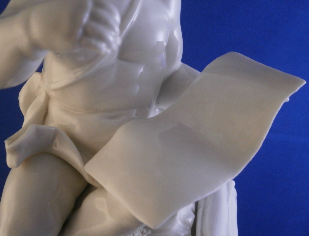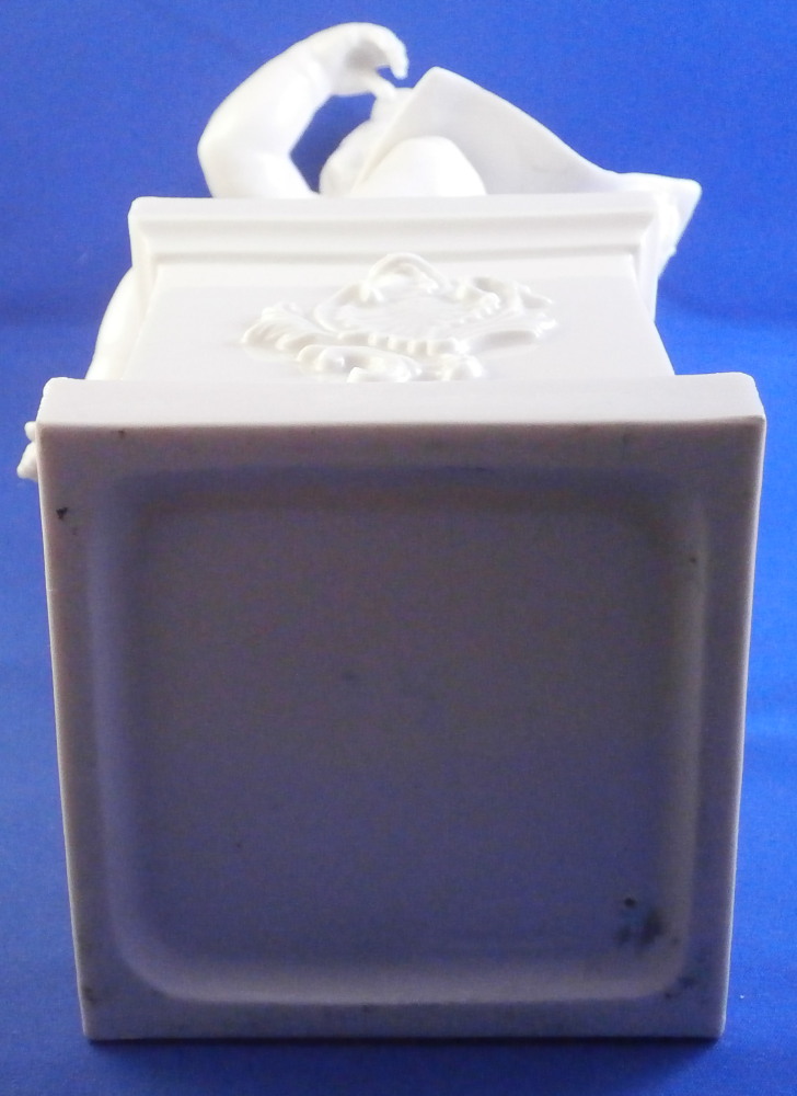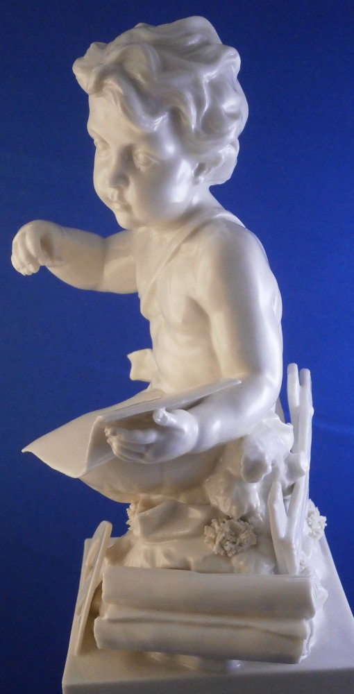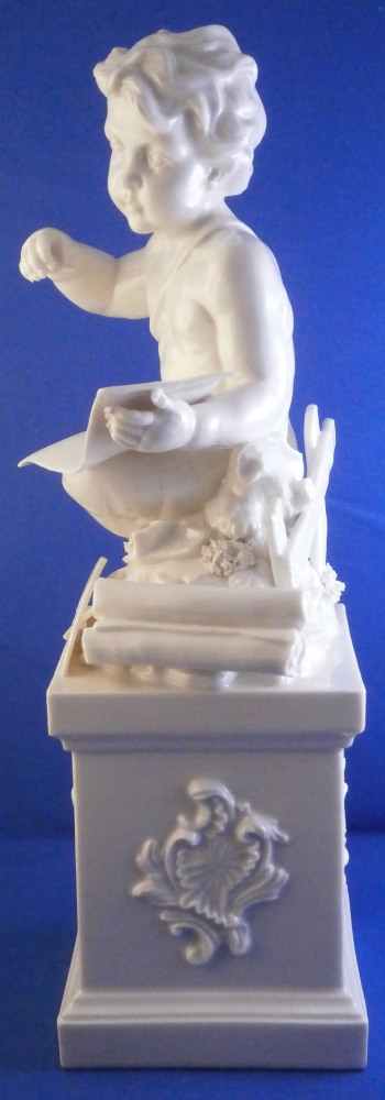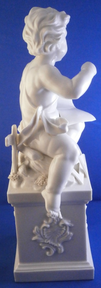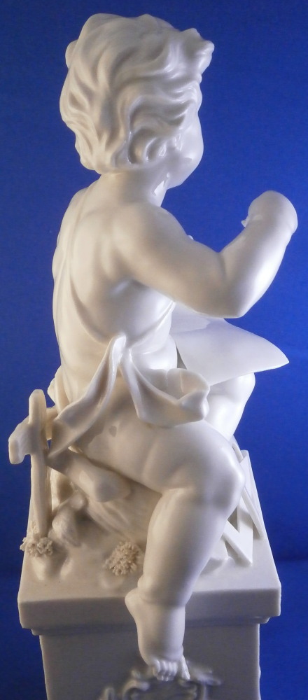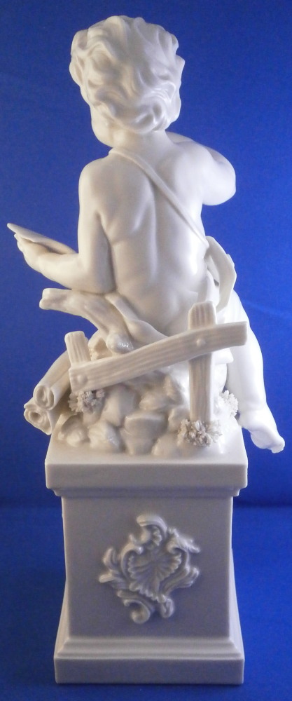 This is a figurine made by an unknown maker. It does really remind me of a Frankenthal model made by Nymphenburg but it is not marked. There is an area near the edge of the underside that is ground down so it seems someone removed some sort of marking. Either way the piece is superbly modeled and left in the white to show off all that detail. The figure is of a figurine sitting on top of a large base that has raised designs to all sides. The figurineis of a putto holding a piece of paper in his left hand, has a cloth covering its mid section, has some drafting tools in the front with rolled up papers to the side and a fence to the back. He is sitting on a rocky base with some applied grasses to it. Definitely a Freemason / Masonic link with the tools. The entire piece is 12.5 inches tall, 4.5 inches wide and 3.75 inches deep. It is in perfect condition! A really nice looking figure I have not come across before! Please email me for more information or other pictures.