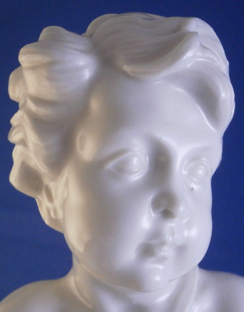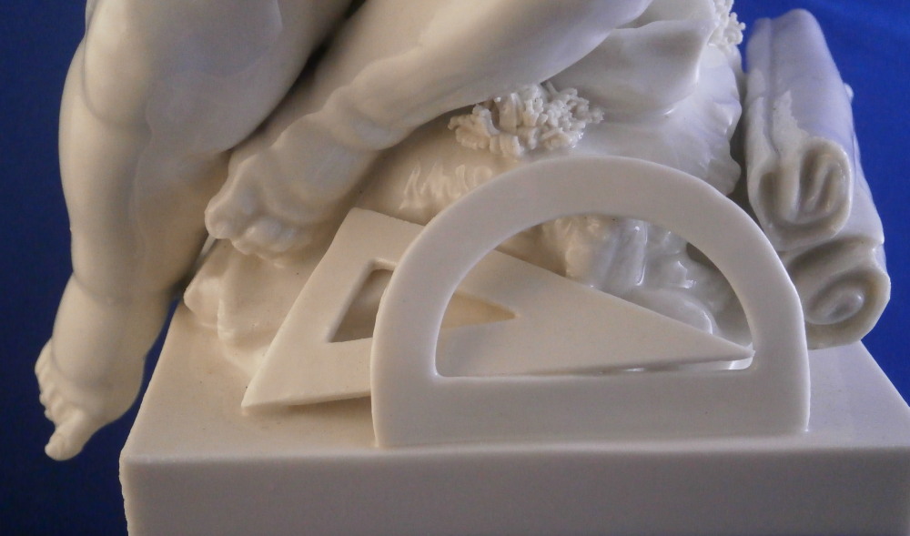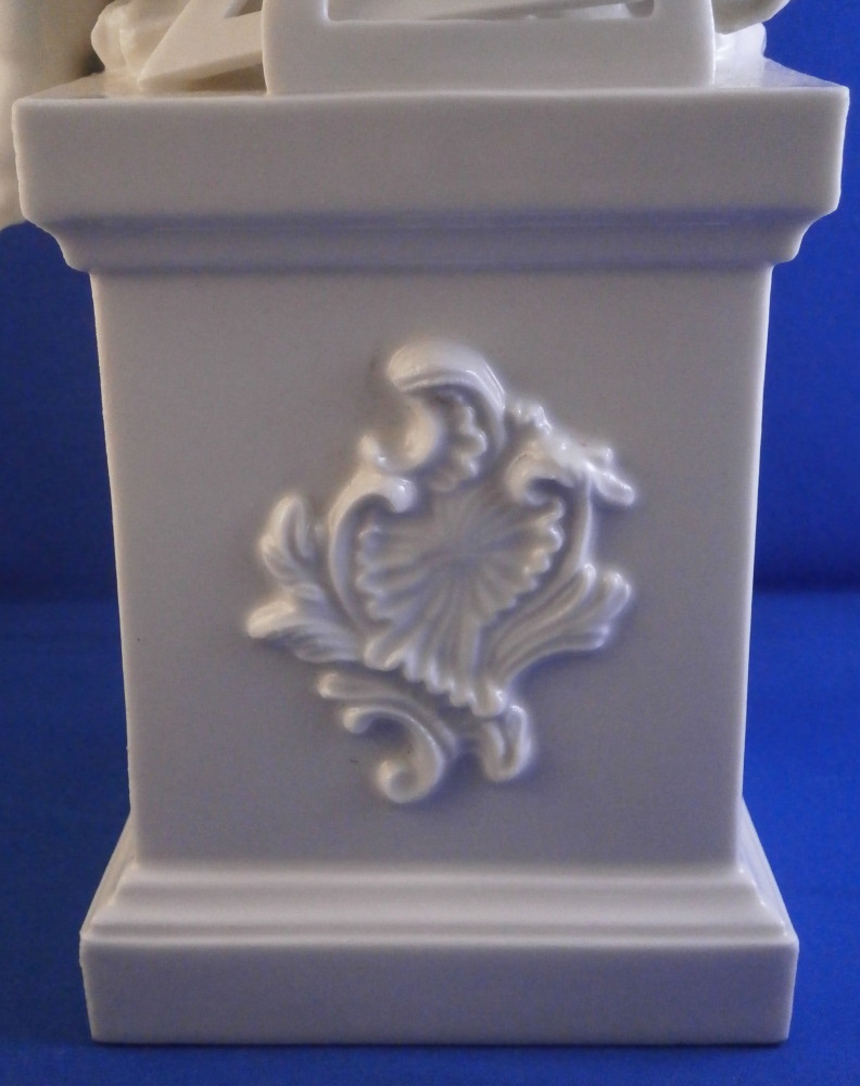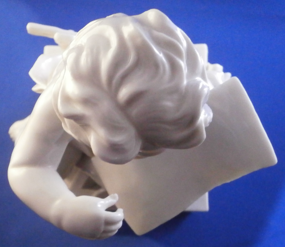 This is a figurine made by an unknown maker. It does really remind me of a Frankenthal model made by Nymphenburg but it is not marked. There is an area near the edge of the underside that is ground down so it seems someone removed some sort of marking. Either way the piece is superbly modeled and left in the white to show off all that detail. The figure is of a figurine sitting on top of a large base that has raised designs to all sides. The figurineis of a putto holding a piece of paper in his left hand, has a cloth covering its mid section, has some drafting tools in the front with rolled up papers to the side and a fence to the back. He is sitting on a rocky base with some applied grasses to it. Definitely a Freemason / Masonic link with the tools. The entire piece is 12.5 inches tall, 4.5 inches wide and 3.75 inches deep. It is in perfect condition! A really nice looking figure I have not come across before! Please email me for more information or other pictures.