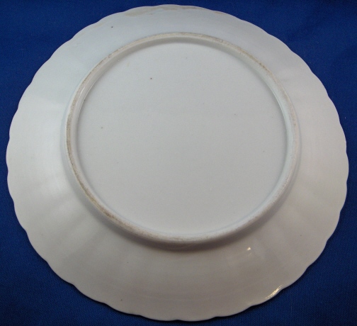 This is a plate made by an unknown maker in the late 18th or early 19th century. I am fairly sure it is German but I could not come up with the maker as of yet. It is nicely painted with a large floral arrangement in the center and four small flowers on the fluted rim. The plate is very thinly potted and has good translucency. The surface has the look of orange skin and is not totally smooth. The piece is in great condition without chips, etc. but it has some manufacturing flaws shown in the pics on the underside. The plate is 0.875 inches tall and 8 inches in diameter. It is unmarked. Please email me for more information or other pictures.