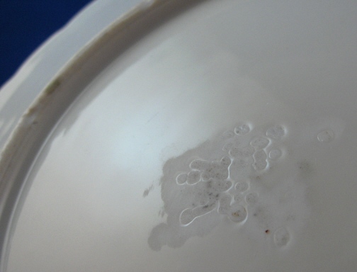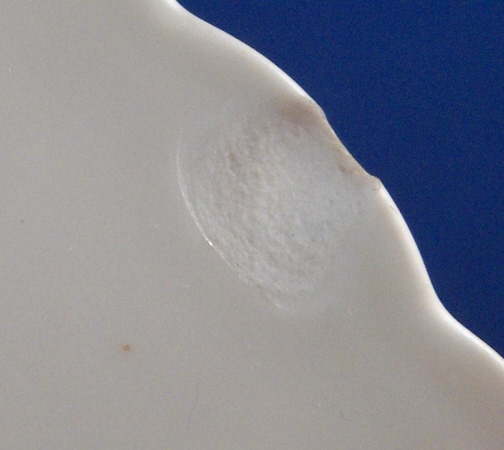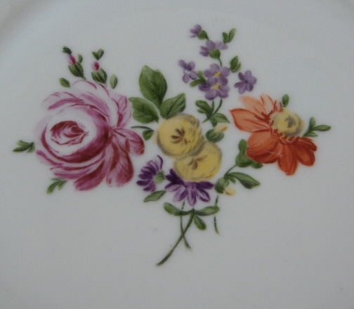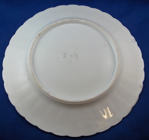 This is a second plate made by an unknown maker in the late 18th or early 19th century. I am fairly sure it is German but I could not come up with the maker as of yet. It is nicely painted with a large floral arrangement in the center and five small flowers on the fluted rim. The plate is very thinly potted and has good translucency. The surface has some pitting. The piece is in great condition with a mostly underside chip to the rim and the center has sagged during firing so it doesn't sit perfectly flat on the surface and wiggles a bit. Some wear to the underside center because of this! The plate is 0.75 inches tall and 8.125 inches in diameter. It is unmarked. Please email me for more information or other pictures.