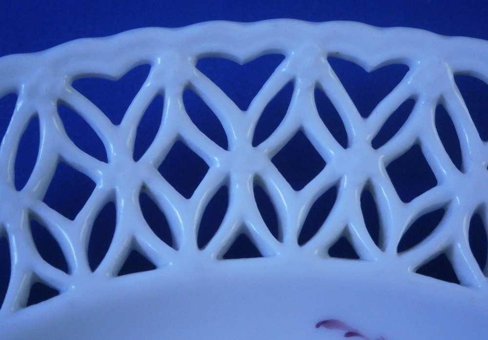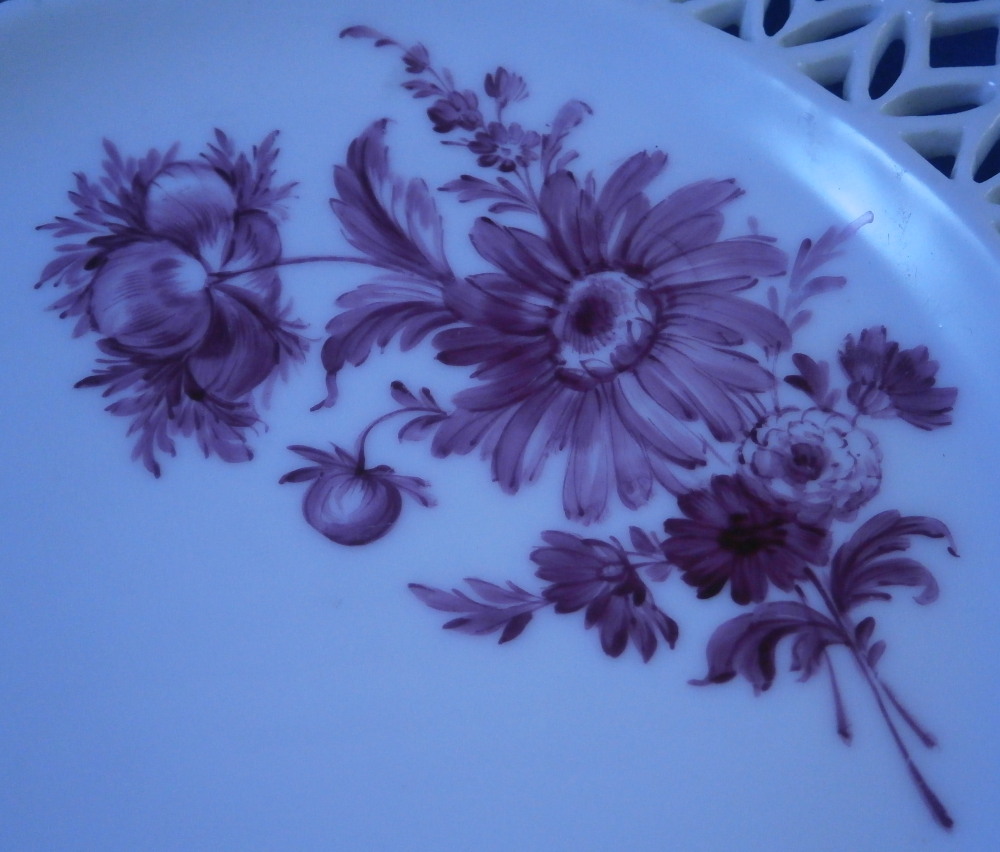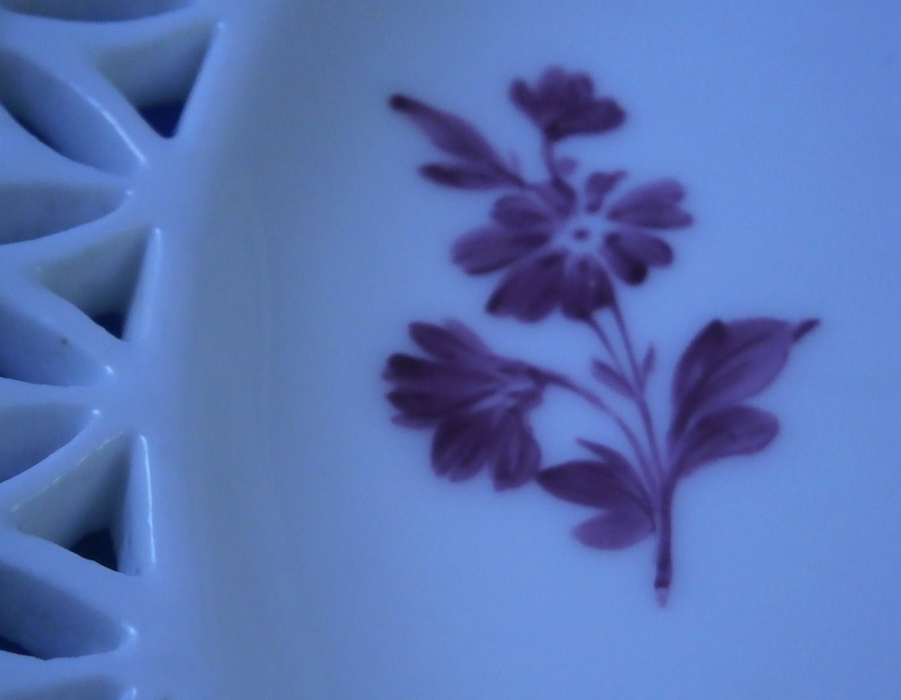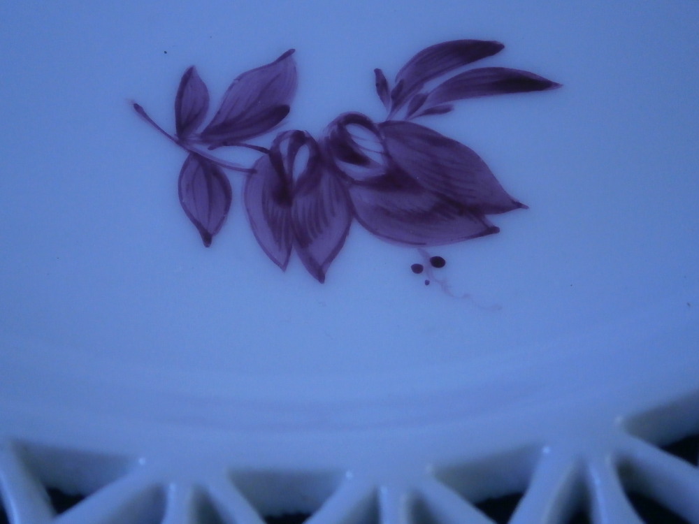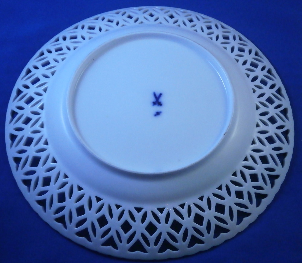 This is a good mystery piece. A relaly nice plate with a superb reticulated rim and a large as well as two small floral design hand painted in pouce in the well of the plate. I am pretty certain is was made in Germany in the 19th century. I ahve never seen this style reticulated rim with the heart cut outs and the underside has three ground away stilt marks to it which is also not something one sees often at all especially during this time period. The flowers are well done and could be by one of the smaller factories but not sure. The footring is rounded and smooth not ground down. The plate is marked with an under glaze blue crossed swords type mark as well as the letter N under it and an 11 by the foot ring. Only way this could be Meissen if this was a blue painted plate but since it is not these marks are by someone else. A real mystery. Nice plate for sure. The plate is 1.25 inches tall and 8.5 inches in diameter. It displays nicely but does have a small rim chip with a short hairline from it and another short hairline as well. Small spot of stacking wear to the white area. None are visible when on display. Please email me for more information or other pictures.