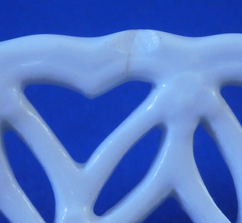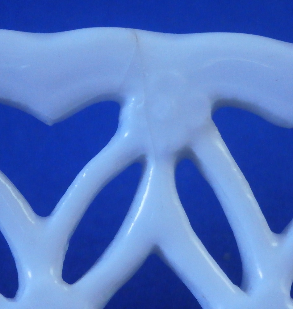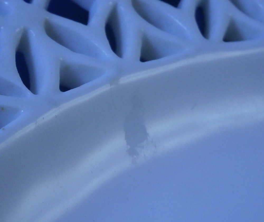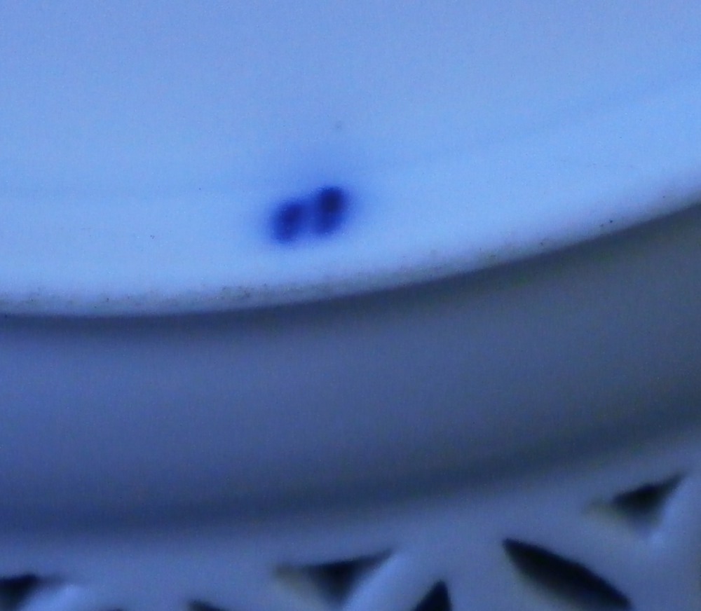 This is a good mystery piece. A relaly nice plate with a superb reticulated rim and a large as well as two small floral design hand painted in pouce in the well of the plate. I am pretty certain is was made in Germany in the 19th century. I ahve never seen this style reticulated rim with the heart cut outs and the underside has three ground away stilt marks to it which is also not something one sees often at all especially during this time period. The flowers are well done and could be by one of the smaller factories but not sure. The footring is rounded and smooth not ground down. The plate is marked with an under glaze blue crossed swords type mark as well as the letter N under it and an 11 by the foot ring. Only way this could be Meissen if this was a blue painted plate but since it is not these marks are by someone else. A real mystery. Nice plate for sure. The plate is 1.25 inches tall and 8.5 inches in diameter. It displays nicely but does have a small rim chip with a short hairline from it and another short hairline as well. Small spot of stacking wear to the white area. None are visible when on display. Please email me for more information or other pictures.