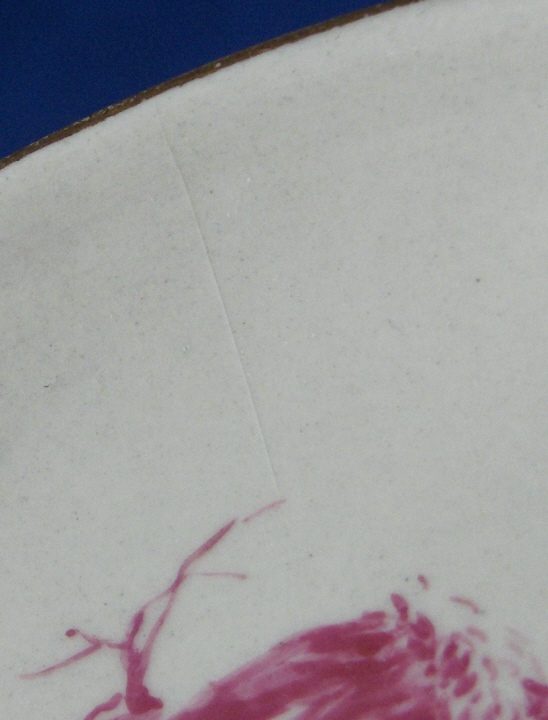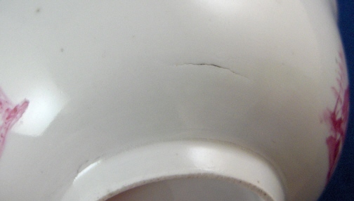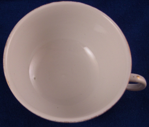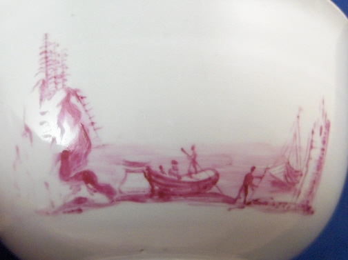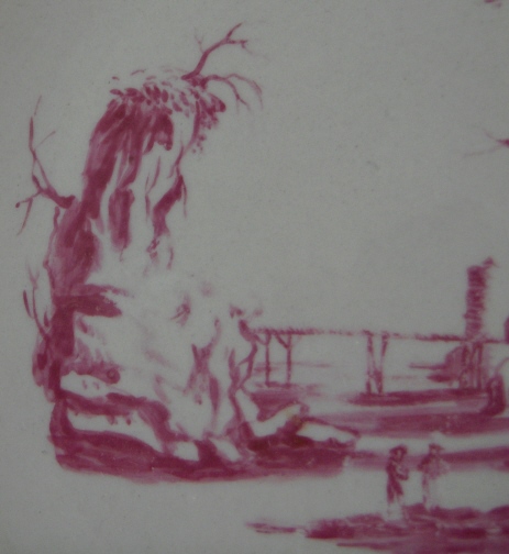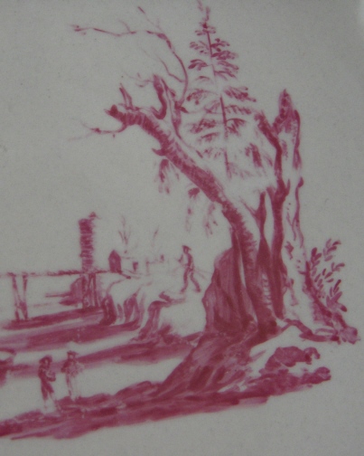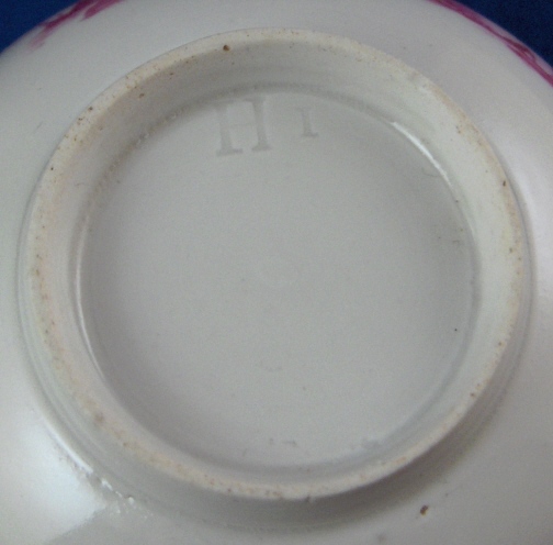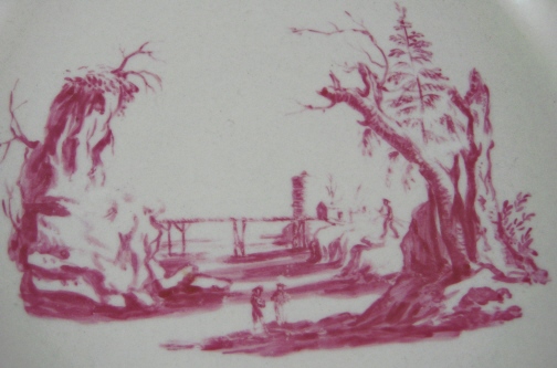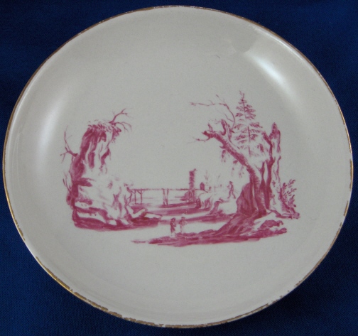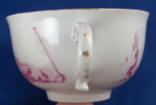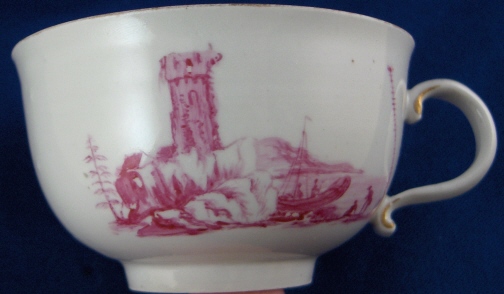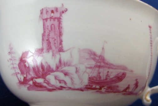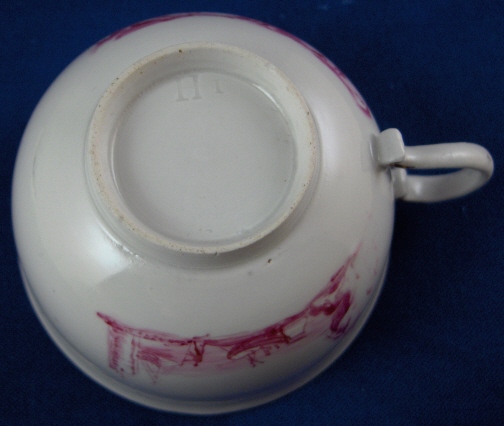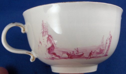 This is a cup and saucer made by a Hoechst around 1790. Apparently this exact letter and number mark is a known mark used by them during this period. Both pieces are handpainted with a superb puce scene of very high quality with trees, a bridge, a few people, etc. The cup has two scenes on it with boats. Gold trim to the edges and handle. The set is in good condition with very tight hairline to the saucer that can only be seen at the right angle with the right light and some wear to the gold trim and a bit on the saucer scene. Both pieces are marked with impressed marks - the cup has H1 under it and the saucer 2M. The cup is 1.875 inches tall and 3.25 inches in diameter. The saucer is 1.125 inches tall and 5.5 inches in diameter. Please email me for more information or other pictures.