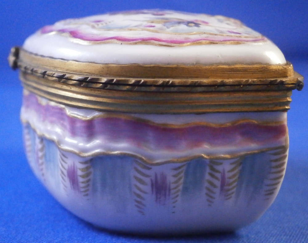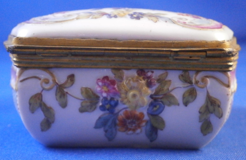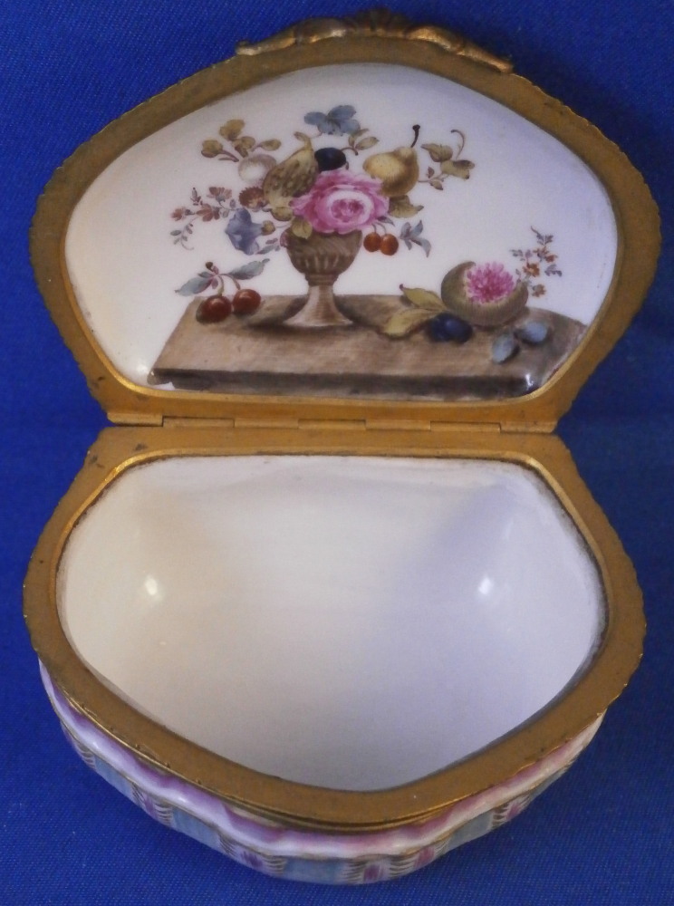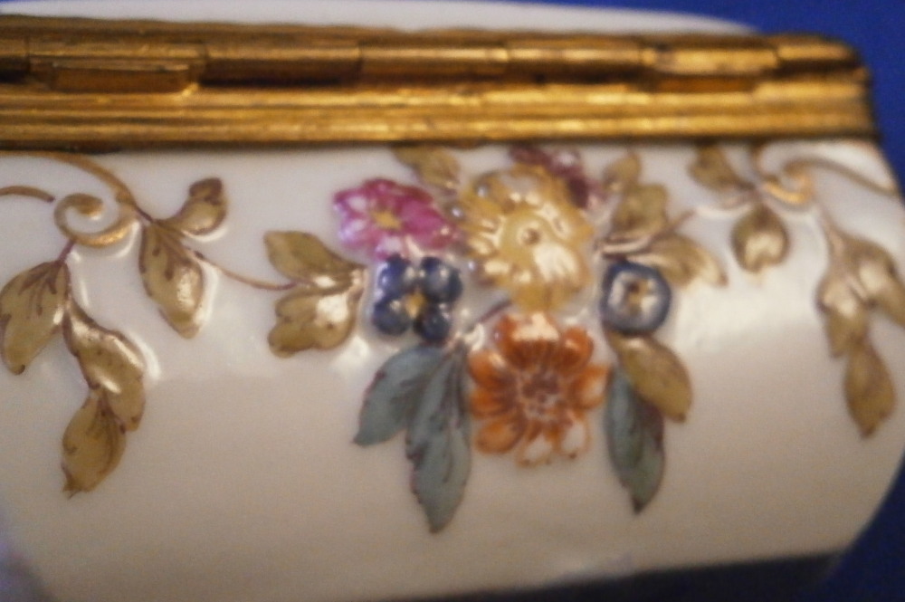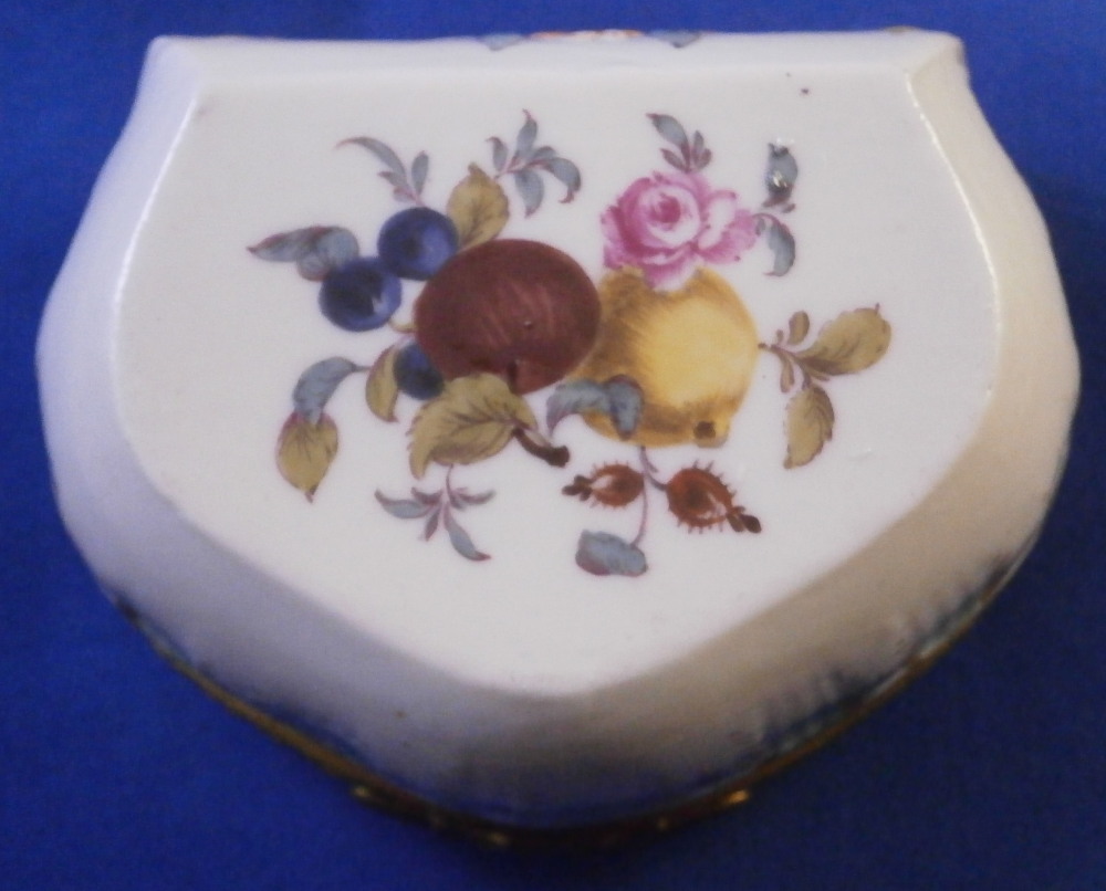 This is a really nice snuff / patch / pill / trinket box made in Germany in the early 19th century I believe. I have not been able to pinpoint an exact maker but the piece is of a really nice quality. The box has a nice shape to it with a relief "shell" design to the top and sides, a relief floral design to the back of the top as well as the back side and a hand painted floral and fruit arrangement to the top and bottom. The inside lid has a really nice flower vase sitting on a table with some fruit strew across the table hand painted on it. The quality could very well be by the top German maker but I could not find this exact shape anywhere so for now it is unknown. The mounts seem to be brass and are in great shape plus it closes perfectly and stays shut. Unmarked which is normal and of no help. The snuff box is about 1.375 inches tall, 2.625 inches wide and 2.125 inches deep. A really nice looking piece! Please email me for more information or photos.