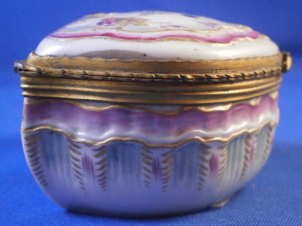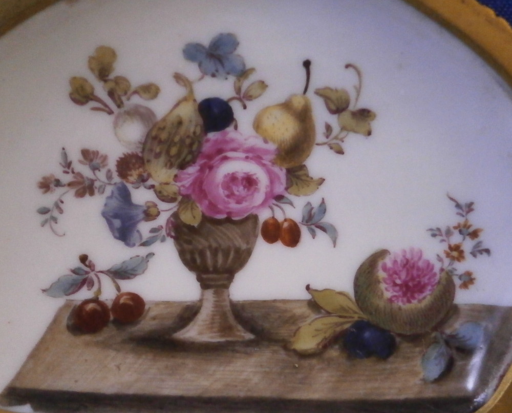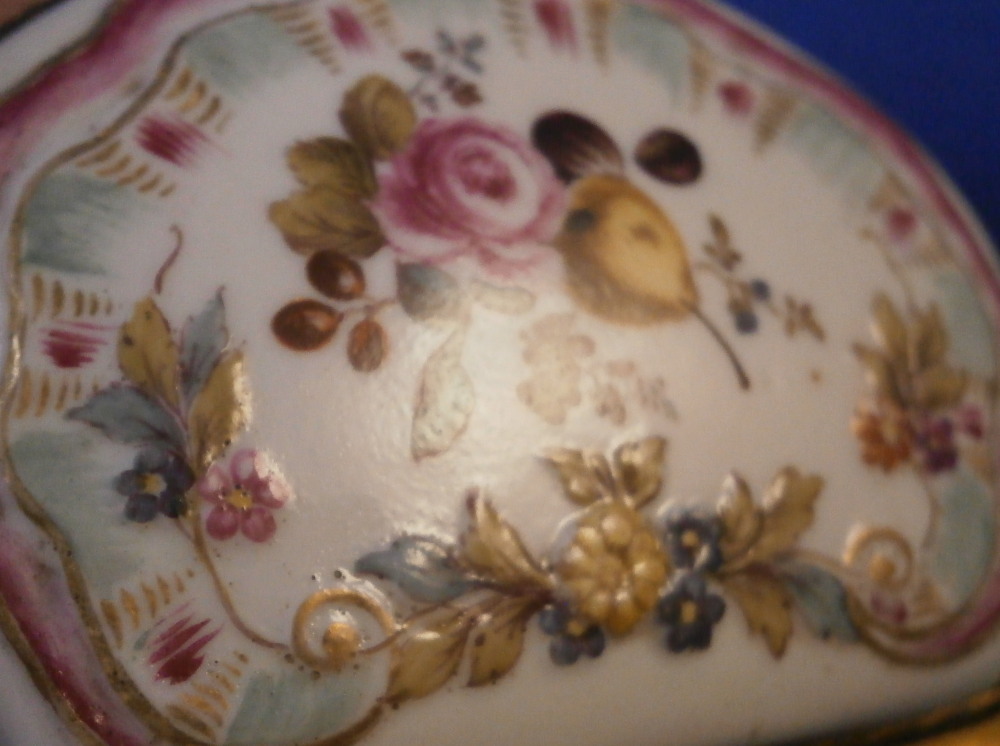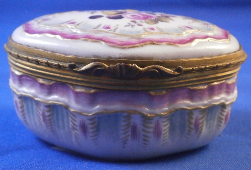 This is a really nice snuff / patch / pill / trinket box made in Germany in the early 19th century I believe. I have not been able to pinpoint an exact maker but the piece is of a really nice quality. The box has a nice shape to it with a relief "shell" design to the top and sides, a relief floral design to the back of the top as well as the back side and a hand painted floral and fruit arrangement to the top and bottom. The inside lid has a really nice flower vase sitting on a table with some fruit strew across the table hand painted on it. The quality could very well be by the top German maker but I could not find this exact shape anywhere so for now it is unknown. The mounts seem to be brass and are in great shape plus it closes perfectly and stays shut. Unmarked which is normal and of no help. The snuff box is about 1.375 inches tall, 2.625 inches wide and 2.125 inches deep. A really nice looking piece! Please email me for more information or photos.