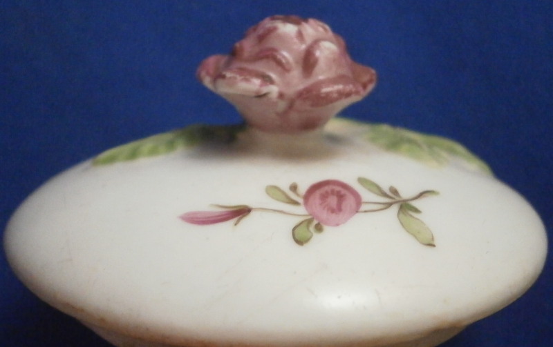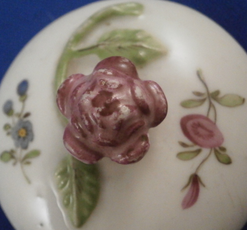 This is a tea pot lid made by an unknown maker but most likely in Germany in the 18th century. The color of the porcelain fits best with my 18th century Nymphenburg teapots but I am not sure if they did this sort of finial. The piece is painted with two small flowers and has a pink floral finial with a short green stalk and two leaves. The piece is not marked at all which is normal. It is in great condition with some very minor wear. The lid is 0.875 inches tall and it has a diameter of 2 inches. The o.d. of the ring udnerneath that would sit in your teapot is 1.625 inches. Please email me for more information or other pictures.