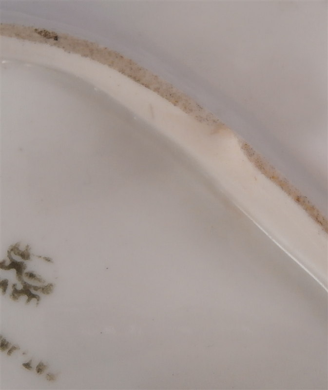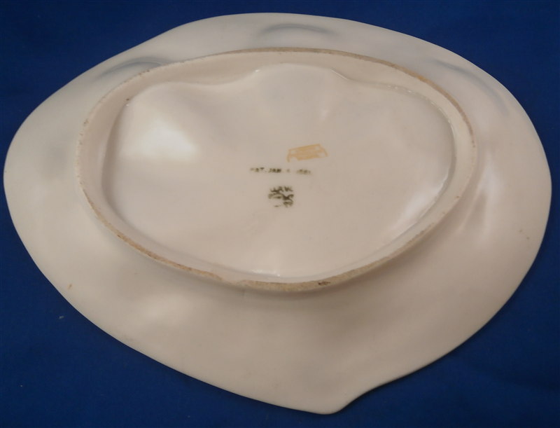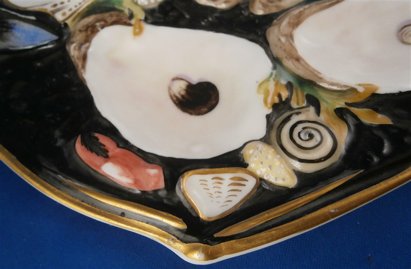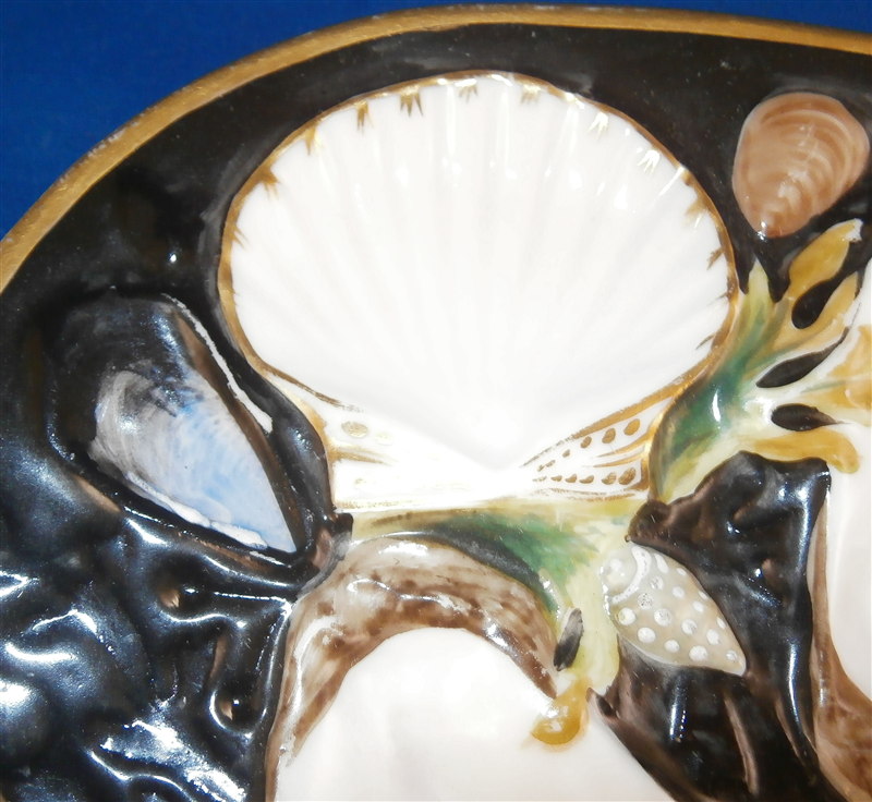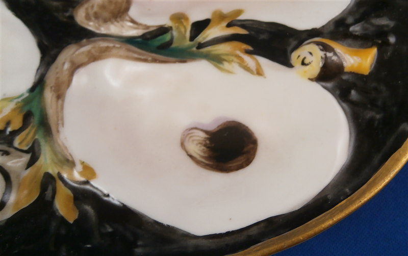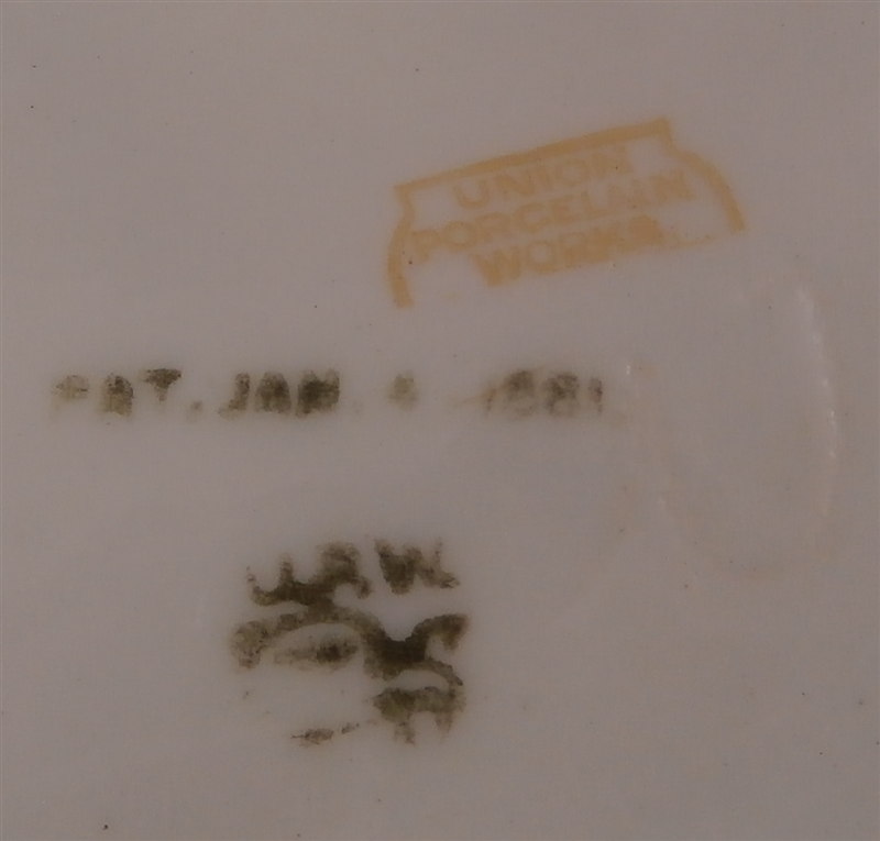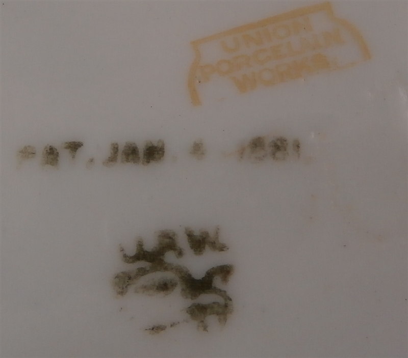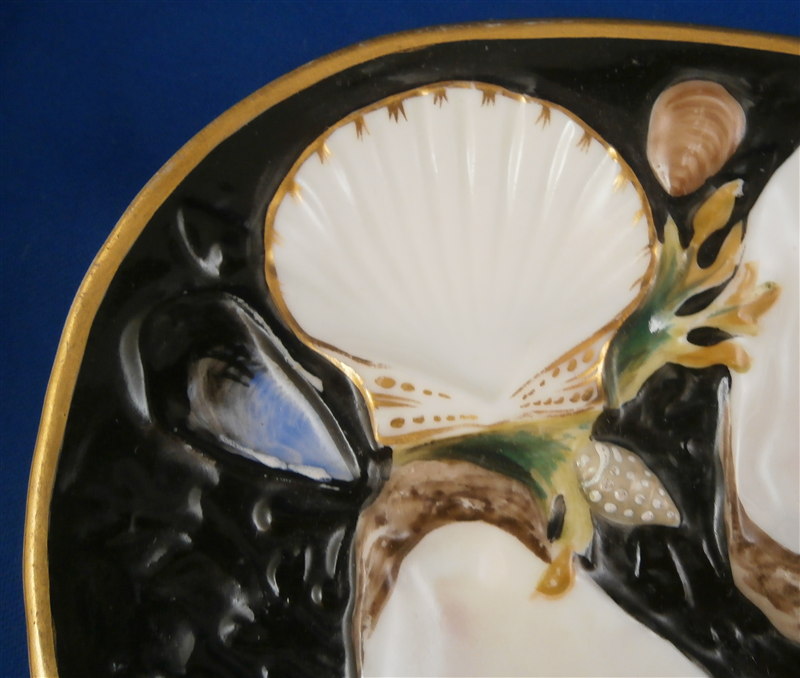 This is a rare and fun oyster plate made by the Union Porcelain Works around 1881. It is nicely shaped and molded with seaweed and shells in relief as well as a gold trim and what makes this one extra rare is the black ground color which one rarely if ever sees. These are highly collectible and really quite nice. American porcelain after all is much less common than its European counterparts. The plate has four wells for oysters as well as one shell for the sauce. The dish is in great condition with two chips to the sides of the footring which don't take away from the piece. It is about 1 inch tall, 8.5 inches wide and 6.5 inches deep. It is marked as shown on the underside with the U.P.W. over the eagle's head in green as well as PAT. JAN. 4-1881 over it. There is also a yellow Union Porcelain Works mark which is cut of as it ususally has Greenpoint NY under it I believe :) Please email me for more information or other pictures.
