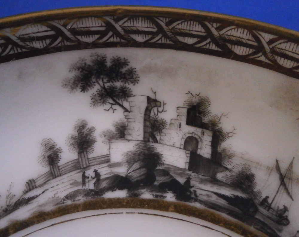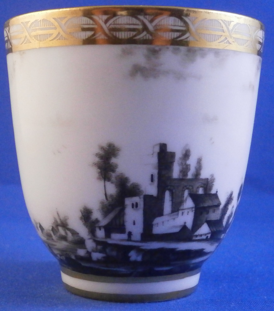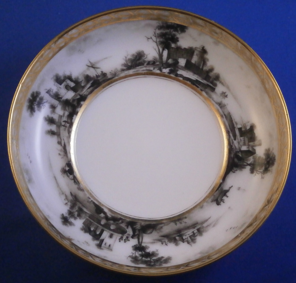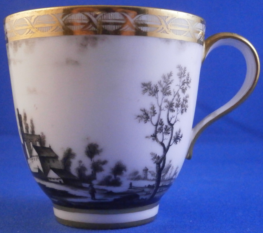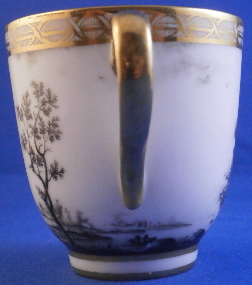 This is a really nice cup and saucer possible made by Valenciennes in the 18th century. Definitely French but could be from another Paris area factory like Locre thouch the style really leads me to believe it was made by Valenciennes. The factory was founded in 1785 by Fauquez and Lamoniary but it was short lived until about 1795 and then again from 1800 until 1810. For a short time Vanier was the director. The set is hand painted with a nice scene in different shades of black around the edge of the saucer and around the body of the cup. They are quite nice and include buildings, boats, people and trees in a landscape surrounding. Superb gold trim to the edges and some gilding to the handle. The cup and saucer are in great condition with just some minor wear to the gilding around the well of the saucer and the edge of the cup. The cup is just under 2.625 inches tall and 2.5 inches in diameter. The saucer is 1.25 inches tall with a diameter of 5.5 inches. The set is unmarked but I have had unmarked pieces by them before where one piece had a mark and the other did not so it's not unheard of. Please email me for more information or other pictures.