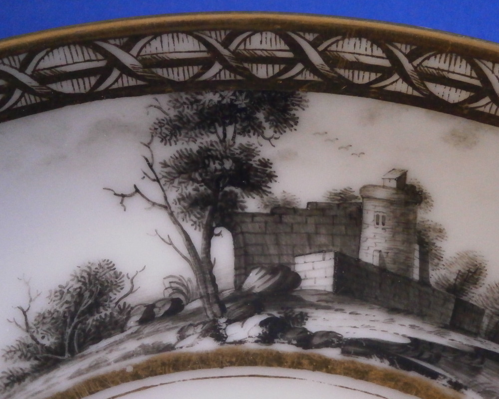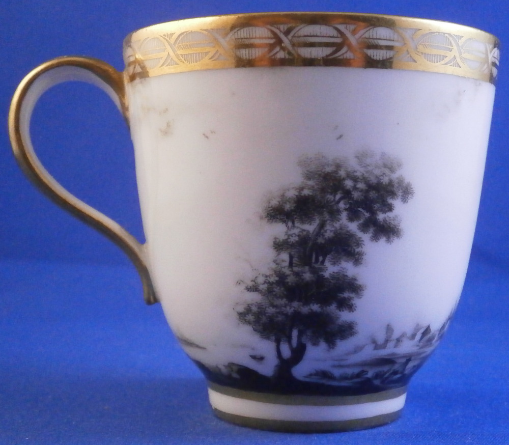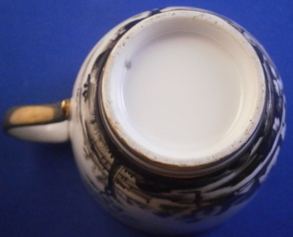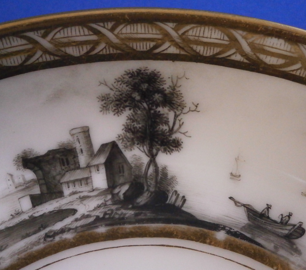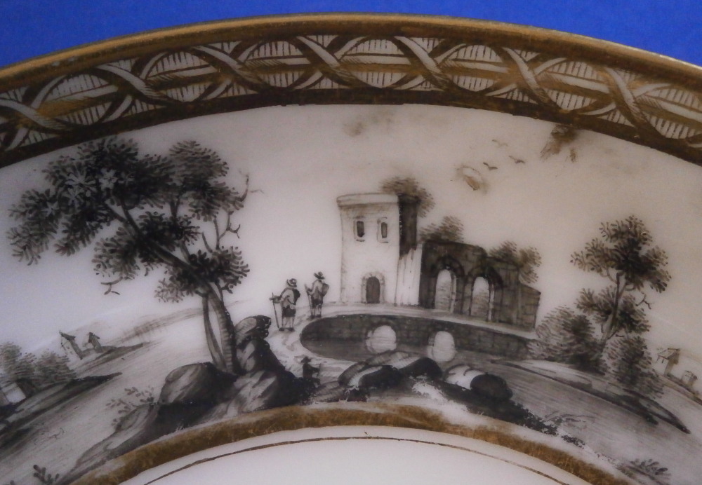 This is a really nice cup and saucer possible made by Valenciennes in the 18th century. Definitely French but could be from another Paris area factory like Locre thouch the style really leads me to believe it was made by Valenciennes. The factory was founded in 1785 by Fauquez and Lamoniary but it was short lived until about 1795 and then again from 1800 until 1810. For a short time Vanier was the director. The set is hand painted with a nice scene in different shades of black around the edge of the saucer and around the body of the cup. They are quite nice and include buildings, boats, people and trees in a landscape surrounding. Superb gold trim to the edges and some gilding to the handle. The cup and saucer are in great condition with just some minor wear to the gilding around the well of the saucer and the edge of the cup. The cup is just under 2.625 inches tall and 2.5 inches in diameter. The saucer is 1.25 inches tall with a diameter of 5.5 inches. The set is unmarked but I have had unmarked pieces by them before where one piece had a mark and the other did not so it's not unheard of. Please email me for more information or other pictures.