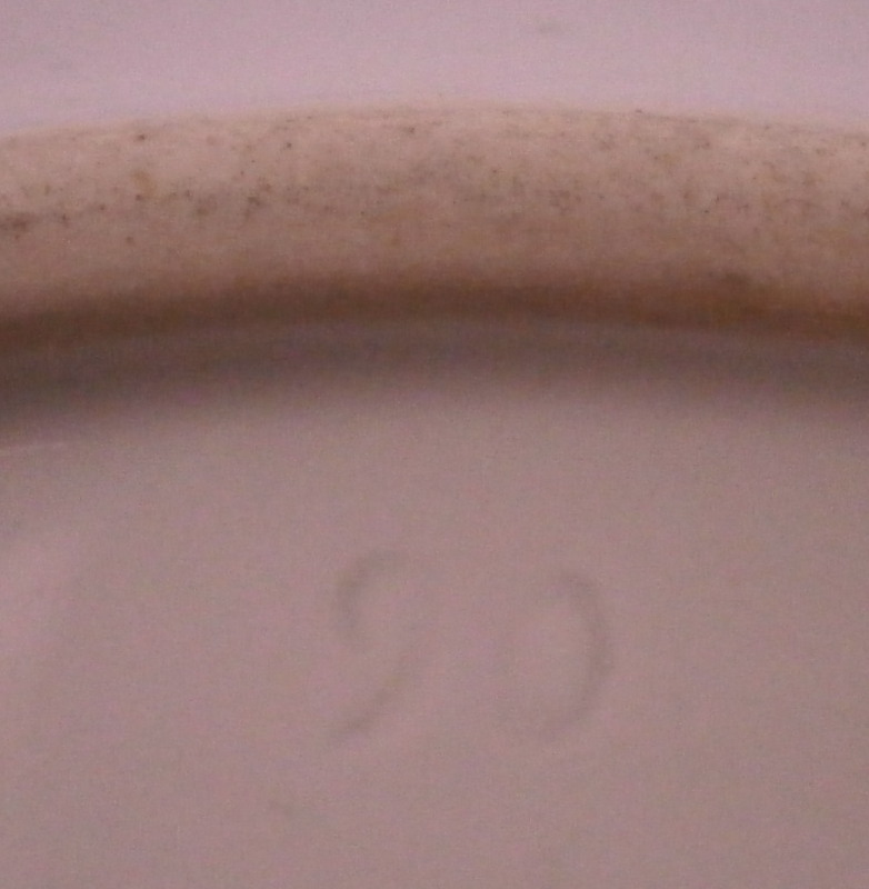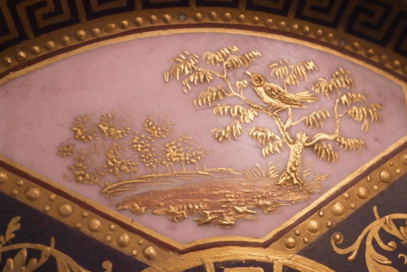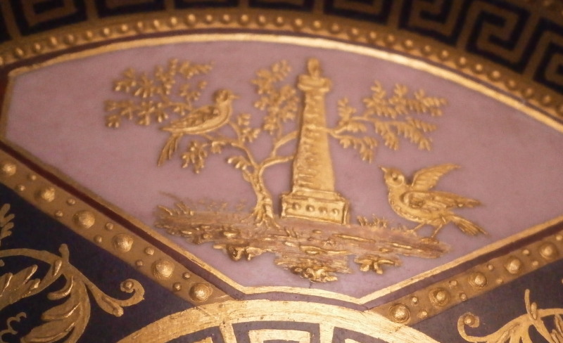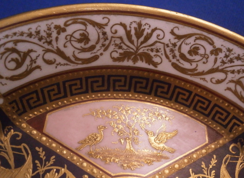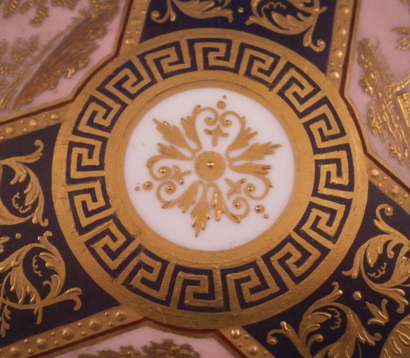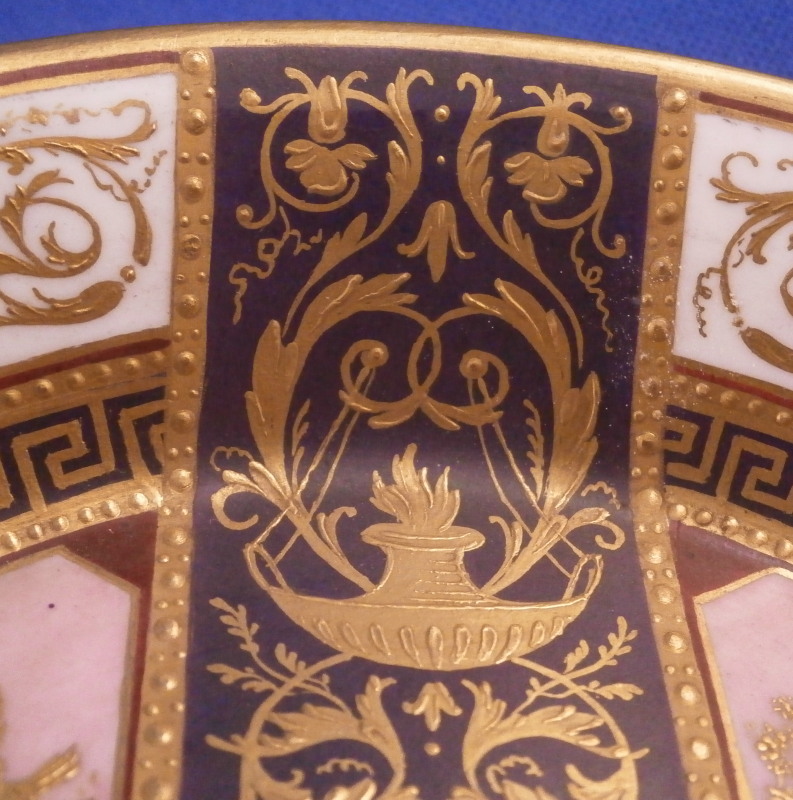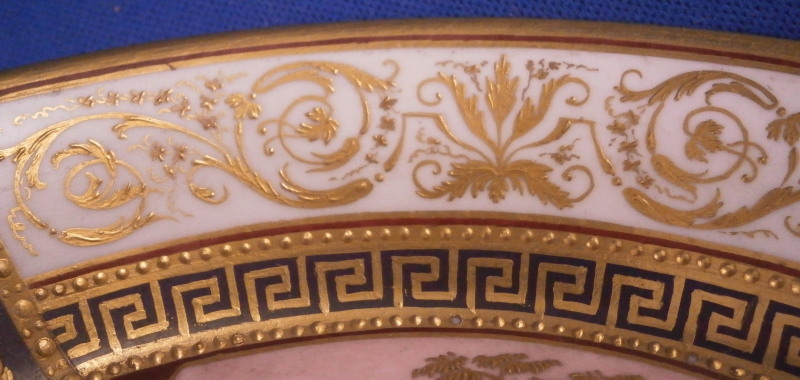 This is a really nice saucer made by Royal Vienna in 1790 during the famous Sorgenthal period which was the best time for this maker. It is hand painted with lots of fancy gilding much of it with lots of raised details! There are three panels of gold scrolls on white ground, three gold scenes on pink ground with a thin maroon band around them with the corners having a larger maroon area and three panels going into the saucer of gold designs on a dark blue ground. Greek key trim separating them white and pink panels and around the central design as well. Gold trim to the edge with a thin maroon stripe below it. Really a very fancy but still elegant design! Wish I had a matching cup but maybe someone out there does. Typical shape to the saucer for this period! The saucer is in great condition with just one of the tiny gold dots missing which is an easy cover up and a really thin small flake to the outside edge as shown. It displays perfectly! The saucer is 1 inch tall and 5 inches in diameter. It is marked with the underglaze blue shield mark as well as the typical impressed year mark (90 in this case) as well as another impressed number (39 maybe)and a puce 84. as the painter's mark for Franz Kastner . Please email me for more information or photos.