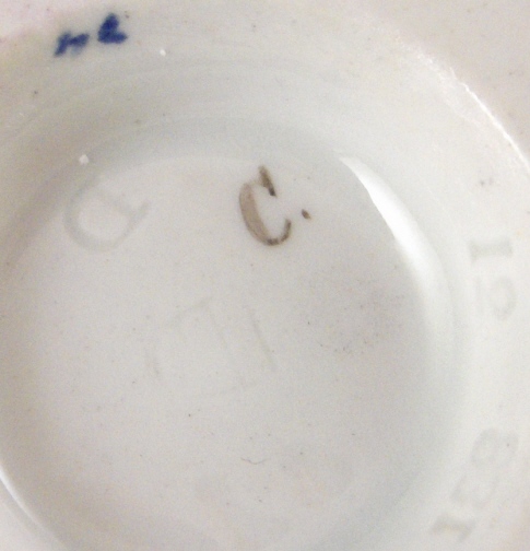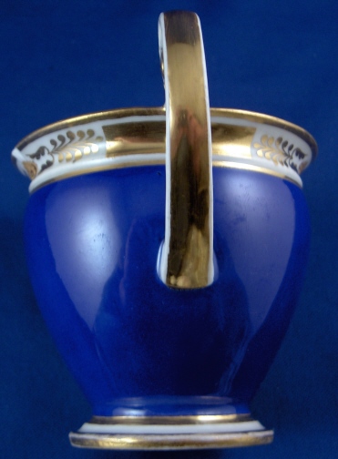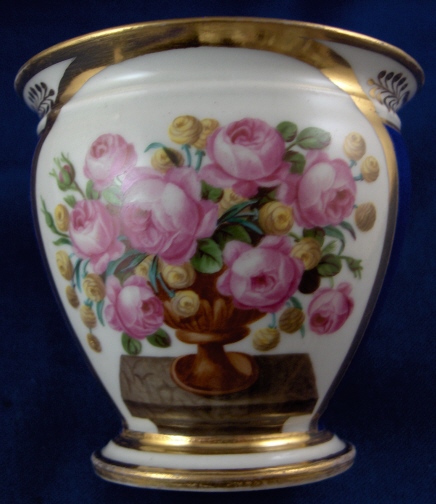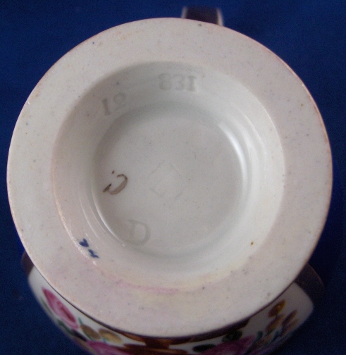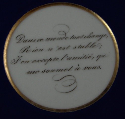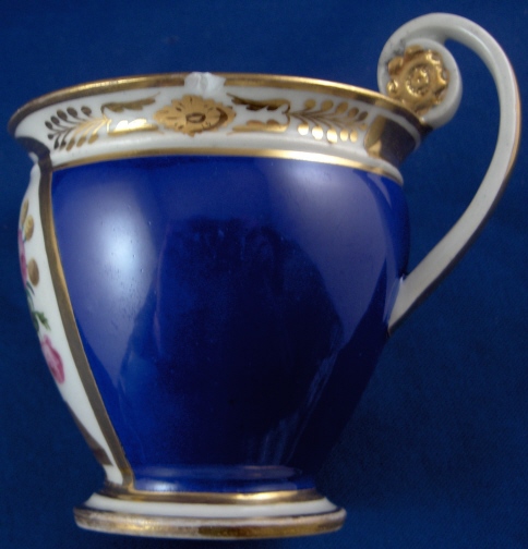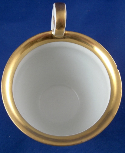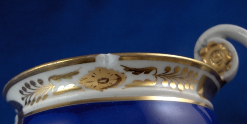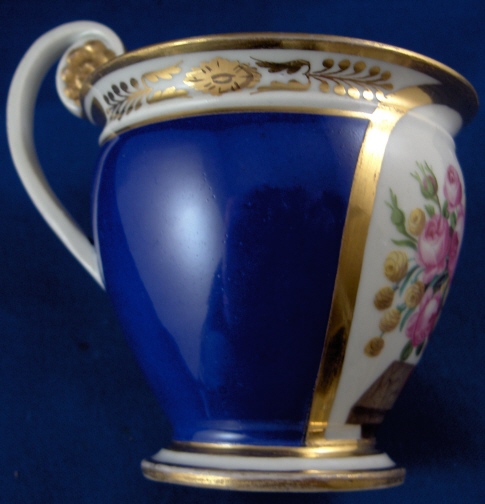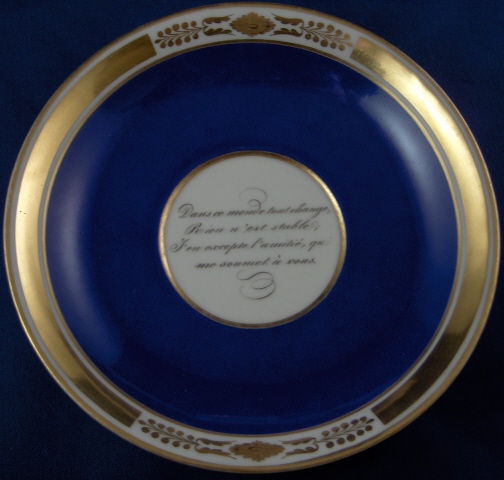 This is a great cup and saucer made by Royal Vienna in 1832. The saucer is handpainted with a superb blue ground color and has a gold design to the rim and a saying in French in the center - Dans ce monde tout change,rien n'est stable, Jen excepte l'amitie, qui me soumet a vous. My French stinks a bit but it says something like The whole world changes, nothing is stable except the love I feel for you. Rough translation but you get the idea :) The cup has the same blue ground and gold trim with a superb floral scene on the front and a nice handle. The set is extremely well marked much better than any other piece I have seen - the saucer has a faint impressed beehive (shield) mark in the center, a black letter C. a blue 74 for the painter Martin Fromhold and a gold number 18 for the gilder Josef Megerle. The cup has the faint impressed shield mark, a black letter C., a blue 74, an impressed 12, an impressed D and an impressed 831 for the date code for 1831. The displays perfectly but the cup rim has a chip to it as shown. An easy fix! The very bottom goldring of the cup has a bit of wear. The cup is just over 3 inches tall (not including the handle) and 2.375 inches in diameter. The saucer is 1.125 inches tall and 5.875 inches in diameter. Please email me for more information or other pictures.