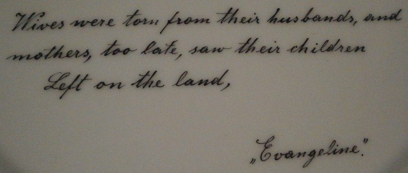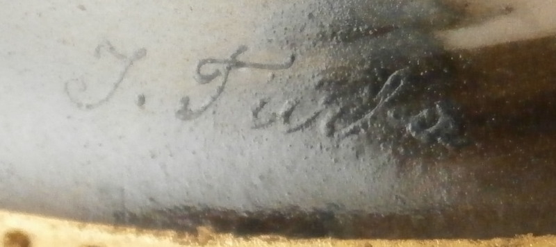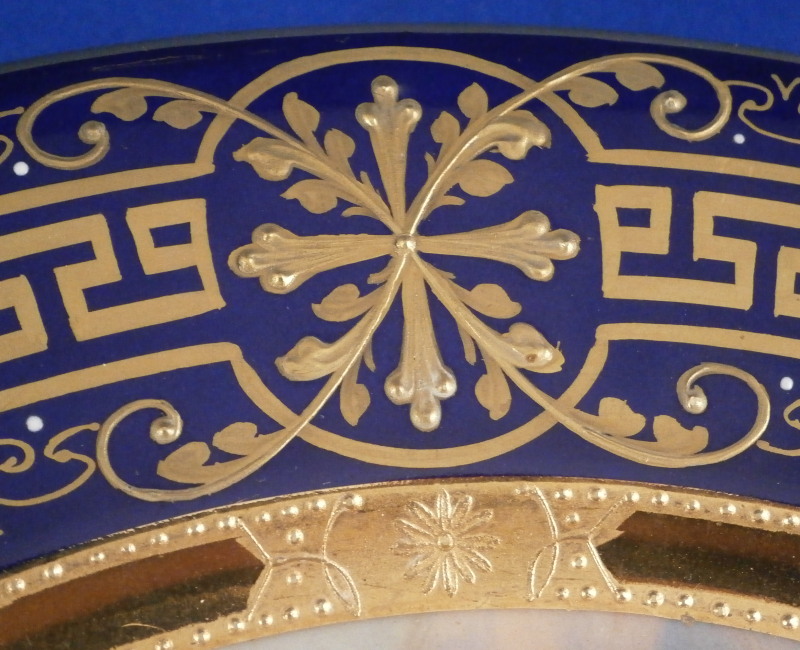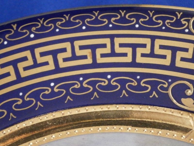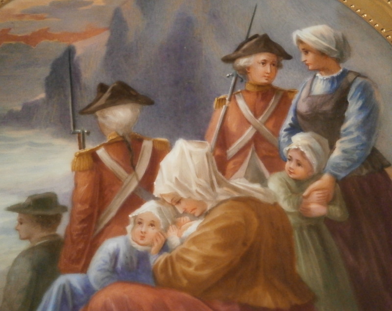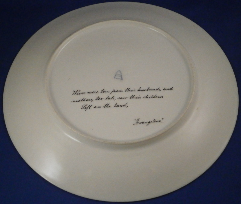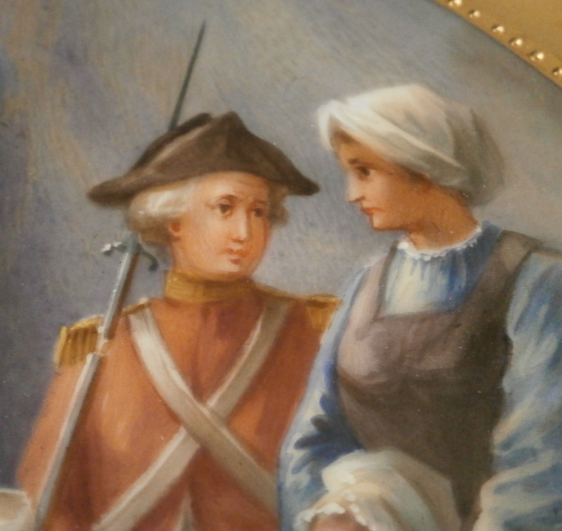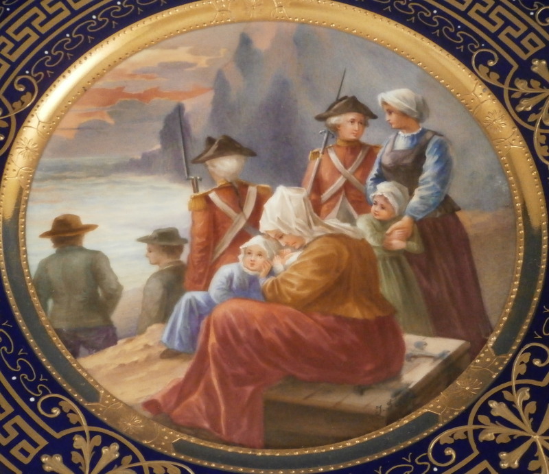 This is an interesting plate made by one of the many factories copying the Royal Vienna beehive / shield mark in the 19th or early 20th century. It seems to have been made for the American market which I have not seen before. The center is hand painted with a signed scene of a two British soldiers in red coat uniforms with two ladies and their young children by them as well as two younger gentleman down below. They are standing on what looks to be a beach with some mountains to the sides, the ocean in front and a nice reddish sky. A very nice quality scene with the typical fancy gilding some of which is raised and some tiny white enamel beads or " jewels " on a cobalt blue rim. The painting is signed J. Turba or something along those lines. These types of plates are very elegant and decorative which is why they are so popular and having a scene that relates to the US is just superb and definitely not something one comes across often. The plate is in superb condition with some very very minor wear - as nice as one could hope for! The piece is 9.625 inches in diameter and 0.875 inches tall so a very nice size. It is marked with the blue shield / beehive mark underneath as well as some impressed marks as shown and the words: " Wives were torn from their husbands, and mothers, too late, saw their children left on the land, "Evangeline". Not sure who the person quoted is - probably from a book or something like that. A very nice and interesting plate! Please email me for more information or photos.