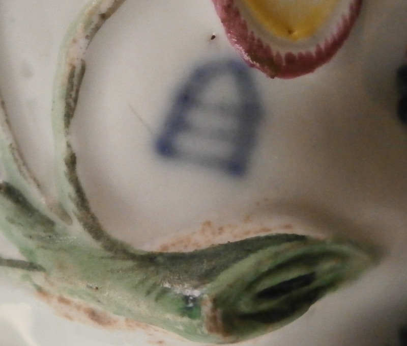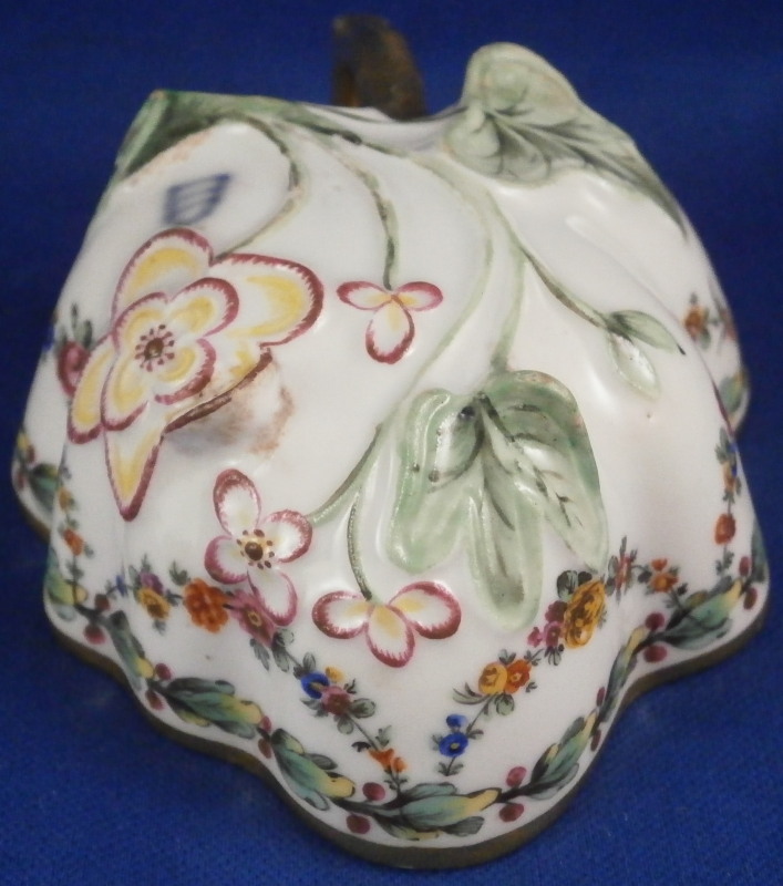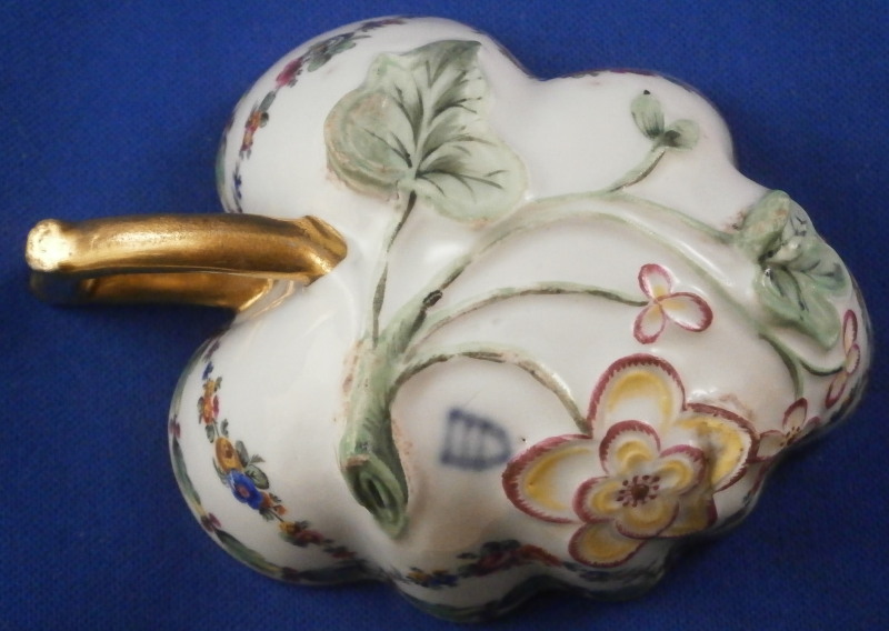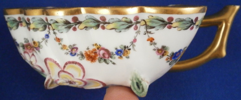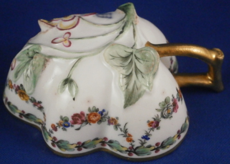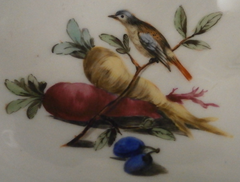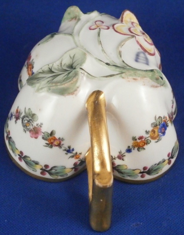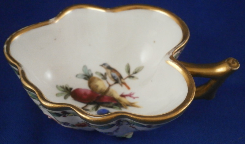 This is a fun little dish made by Royal Vienna in the 18th century. It is either a pickle dish or for gelato ice cream. The piece has a superb leaf shape to it with a gilded handle to one side and flowers and leaves to the underside as feet. The inside has a hand painted scene in it fo a bird sitting on a branch with some root vegetables and plums. The sides have a flower and a leaf garland all around and there is a gold trim to the edge. A trul stunning piece! The dish is in superb condition with some very minimal wear to the gilding. It displays perfectly! It is 1.375 inches tall, 3.875 inches long and just over 2.625 inches wide. It is marked with the blue beehive / shield mark on the underside as shown. Please email me for more information or photos.