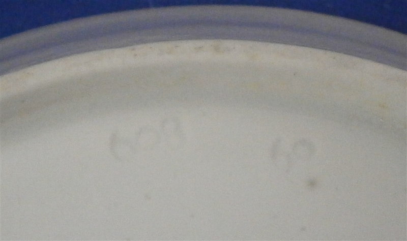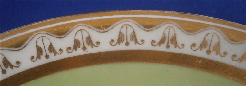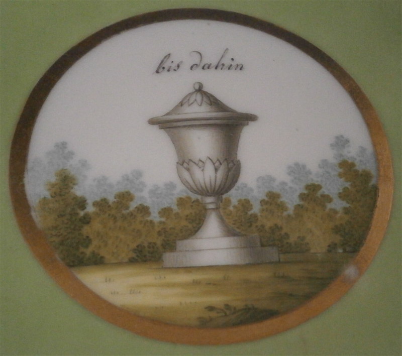 This is a saucer made by Royal Vienna in 1809. It is handpainted with a circular scene in the center with an urn in a landscape surrounding with the words bis dahin (until then) above that. Nice gold trim to the edge as well. Nice shape to the saucer and one should be able to find a nice match in terms of a cup at some point :) The saucer is in great condition with a tiny restoration to the very edge which was really well done! It is 1 inch tall and 5.375 inches in diameter. It is marked with the underglaze blue shield mark, an impressed 809 as the year code and a 60. Please email me for more information or photos.