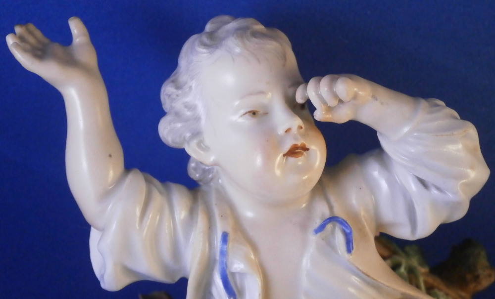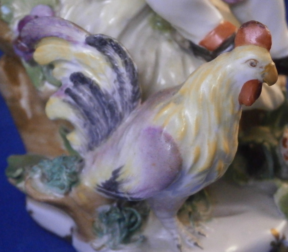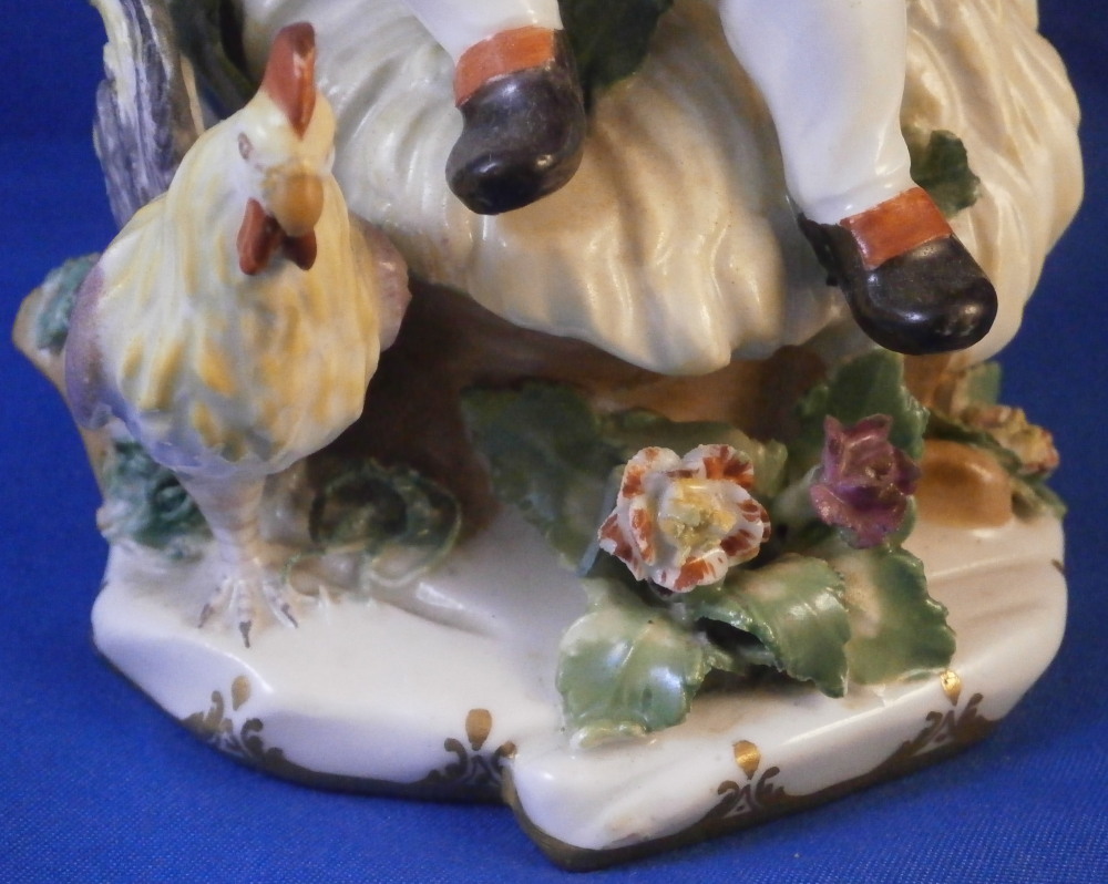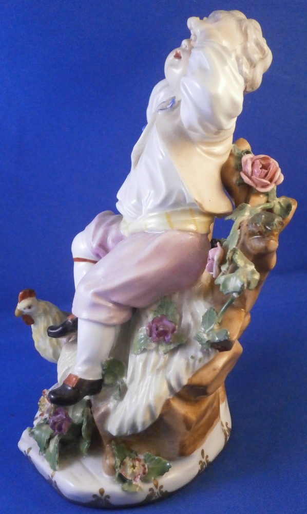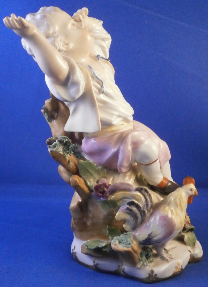 This is a really nice figurine of a boy or young man with a rooster by his side made by Royal Vienna in the mid 18th century. The young man is sitting on a rocky outcrop with some dead grasses or hey on top, a fence behind him that has a rose growing up it, the rooster on his right side standing on a typical base with their typical gold trim from this era. Some flowers and their leaves scattered about. The boy is nicely dressed and appears to be rubbing his eye with one hand while the other arm is stretched out. It is a really nice figure that is in great condition. One fence post top has a restoration to it, the beak of the rooster has had work done to it and there is an odd leaf behind the rooster where I suspect a flower might be missing or it could have been made that way. A couple of leaves of the rose are damaged but it's not obvious at all. The piece displays superbly! The figurine is 5.625 inches tall, 4.25 inches wide and 4 inches deep. Marked underneath with the impressed Q mark, Z4 in red and a 6 with a line below it in red. A rare early figurine of this superb maker. Please email me for more information or photos.
