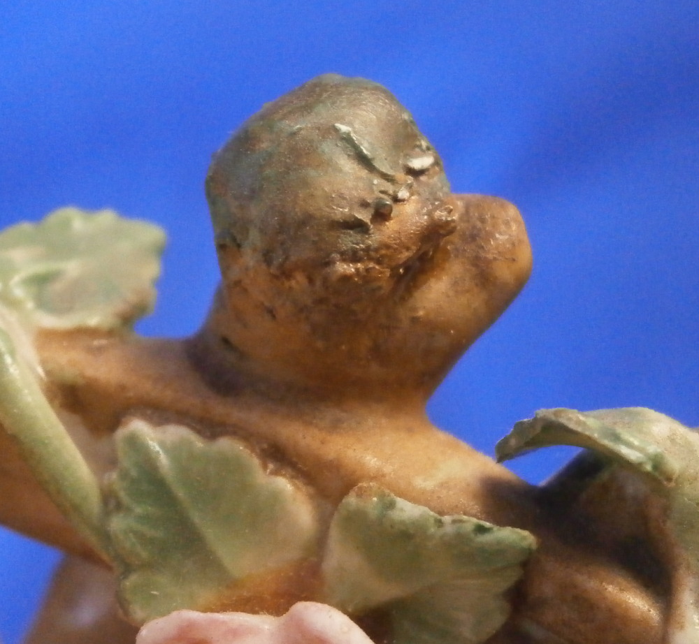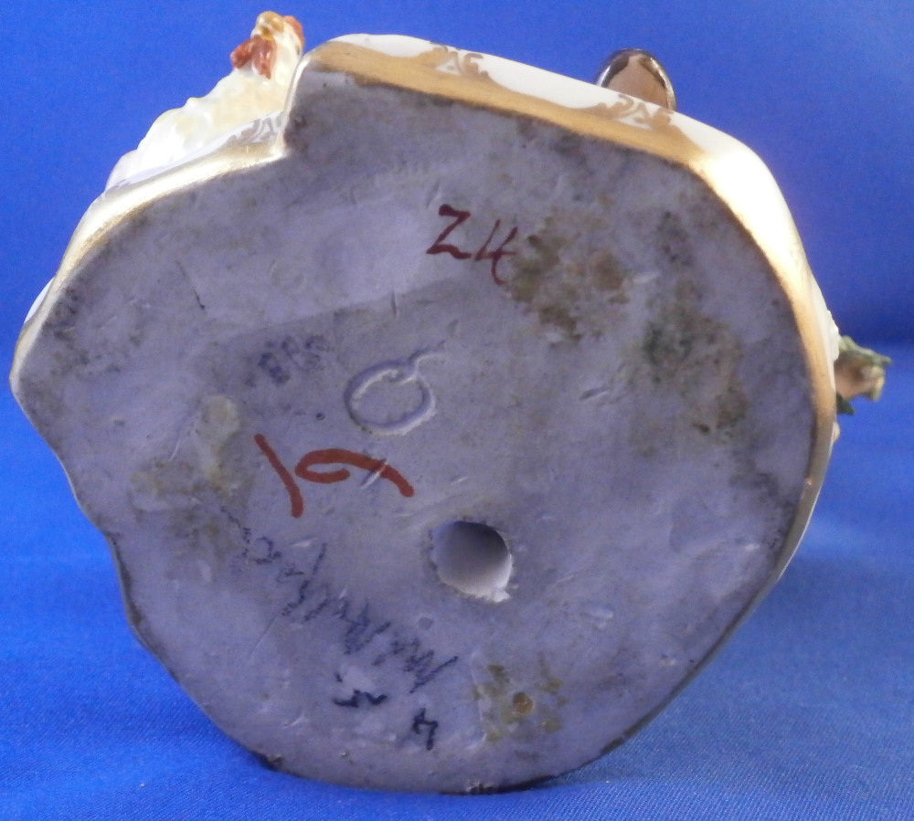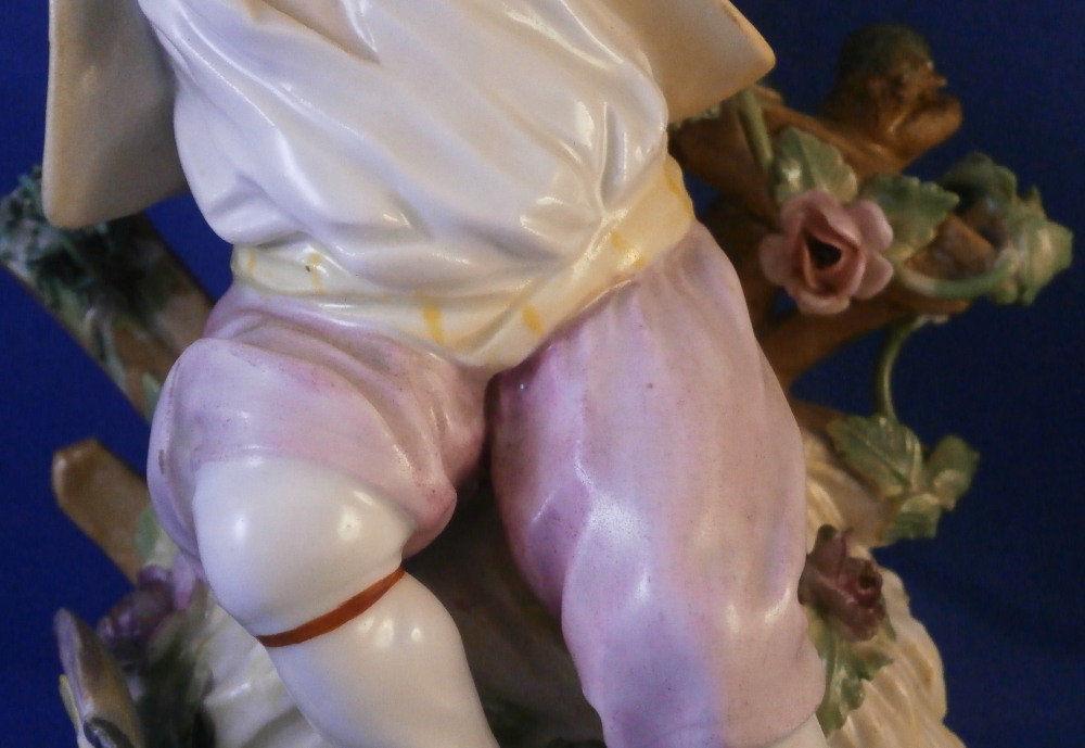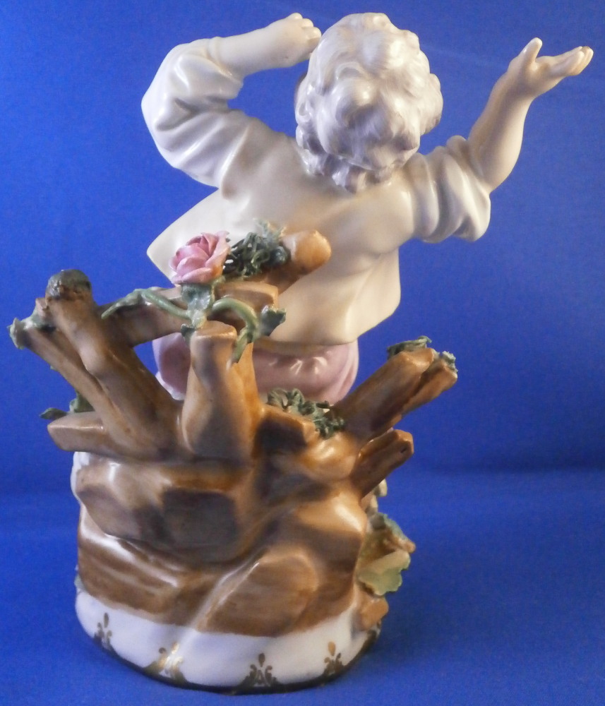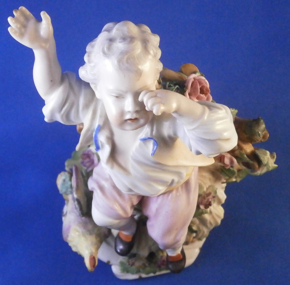 This is a really nice figurine of a boy or young man with a rooster by his side made by Royal Vienna in the mid 18th century. The young man is sitting on a rocky outcrop with some dead grasses or hey on top, a fence behind him that has a rose growing up it, the rooster on his right side standing on a typical base with their typical gold trim from this era. Some flowers and their leaves scattered about. The boy is nicely dressed and appears to be rubbing his eye with one hand while the other arm is stretched out. It is a really nice figure that is in great condition. One fence post top has a restoration to it, the beak of the rooster has had work done to it and there is an odd leaf behind the rooster where I suspect a flower might be missing or it could have been made that way. A couple of leaves of the rose are damaged but it's not obvious at all. The piece displays superbly! The figurine is 5.625 inches tall, 4.25 inches wide and 4 inches deep. Marked underneath with the impressed Q mark, Z4 in red and a 6 with a line below it in red. A rare early figurine of this superb maker. Please email me for more information or photos.