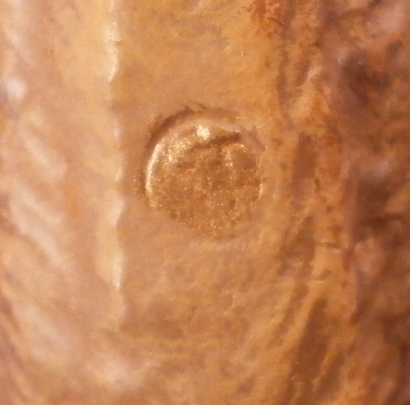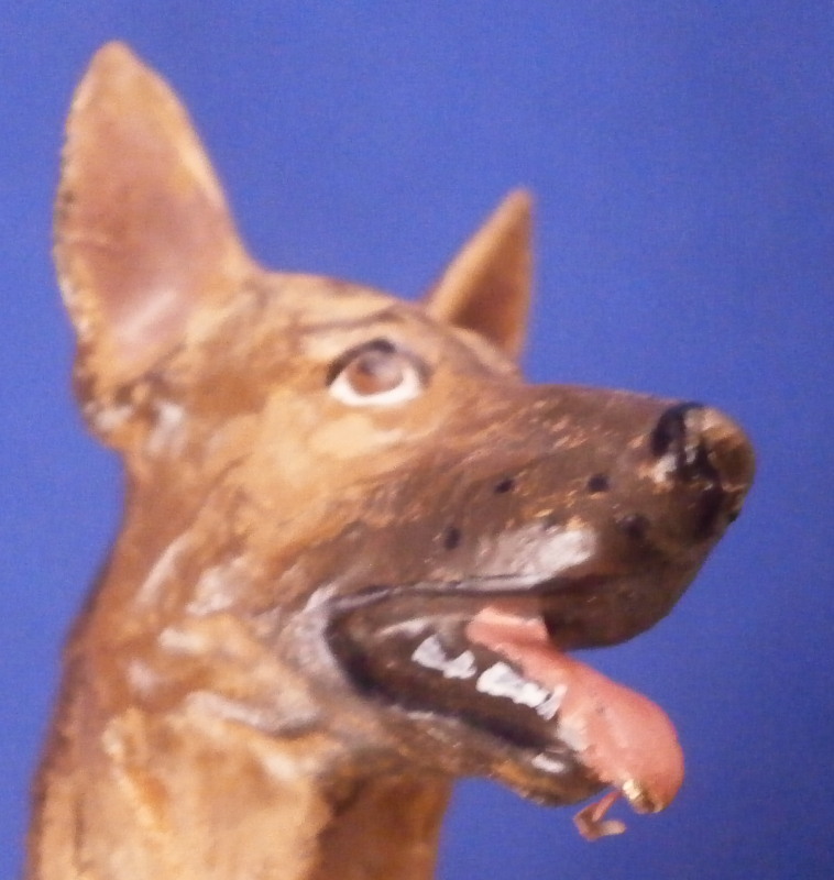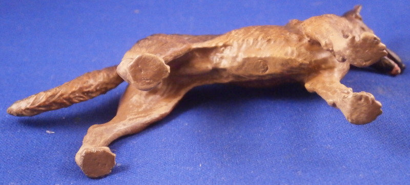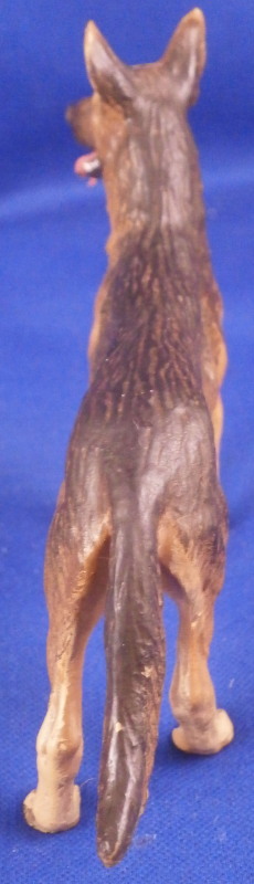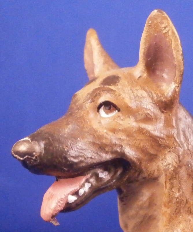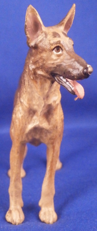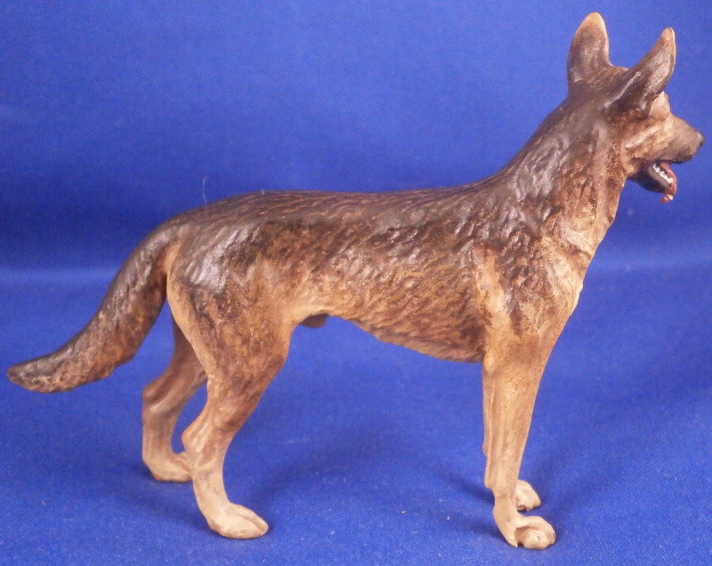 This is a superb bronze of a German shepherd made in the Vienna area in the 20th century. It came with a bunch of very nice antique Vienna cold painted Bronze animals including some signed Fritz Bergmann which this is one of. I think they are still making these today so I am not sure how old the piece is. Looks newer than most of the other pieces in this bunch so I think it is fairly modern. The figure is very well modeled and hand painted with lots of detail It looks to be in great condition with the tip of the nose missing the paint, tiny spots on the tip of each ear, two small spots on the tail, the underside of the tongue and a bit of paint missing of the left back paw. It displays nicely and is not very obvious when on display. The piece is marked underneath the belly with the gold circular Fritz Bergmann company mark as shown. Maybe someone out there knows more about them in terms of age, etc. and could give me a hand. It certainly would be appreciated. The piece is 3.125 inches tall, 1 inch wide and 4.125 inches long. Please email me for more information or other pictures.