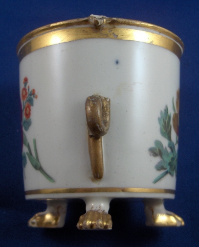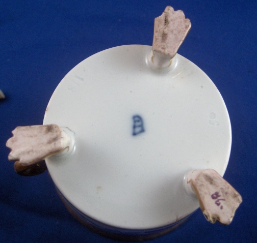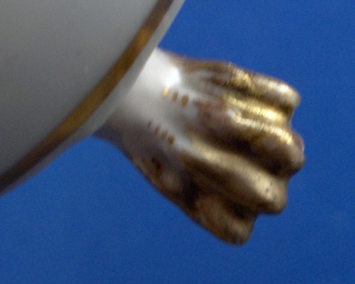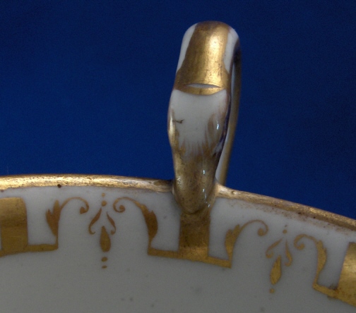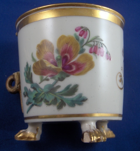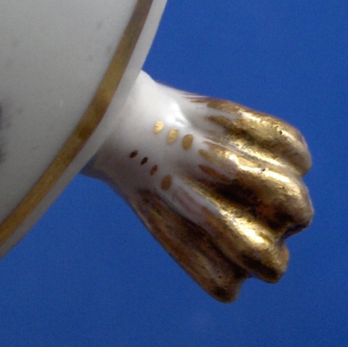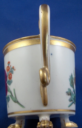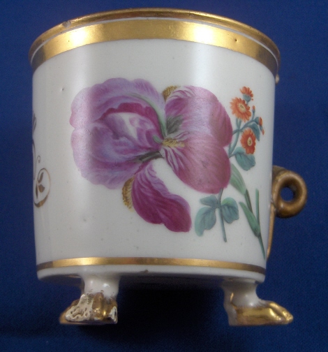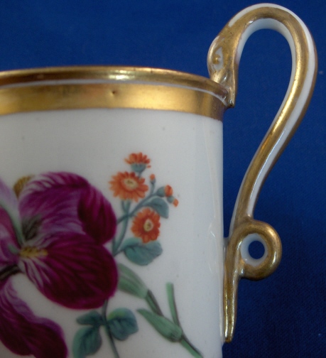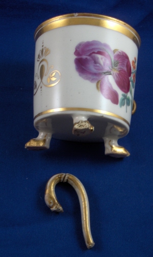 This is a cup and saucer made by Royal Vienna in 1811. Both are handpainted with large very detailed flowers - one on the saucer and two on the cup as well as a fancy gold trim. The cup handle is in the shape of a swans neck and head and the cup rests on three lion feet. The saucer is in super condition but sadly the cup handle has broken off but I had it restored and it looks nice again. Also two of the feet have a small chip each which I had also fixed. The cup is 3 inches tall and 2.875 inches in diameter. The saucer is 0.875 inches tall and 6 inches in diameter. Both are marked with the underglaze blue shield mark. The saucer also has an impressed number 811 (year mark), 60 and 25 as well as a puce 86. The cup has an impressed number 50 and 811 (year mark again) as well as a puce 86. The 86 is a painters mark and stands for Joseph Hinterberger. Please email me for more information or photos.
