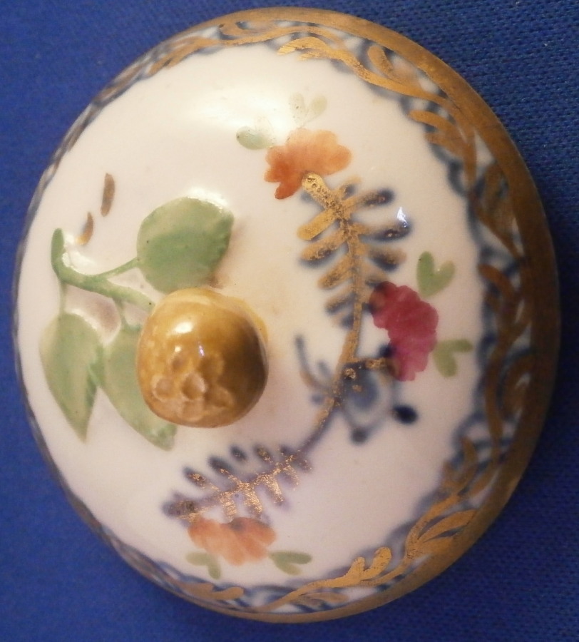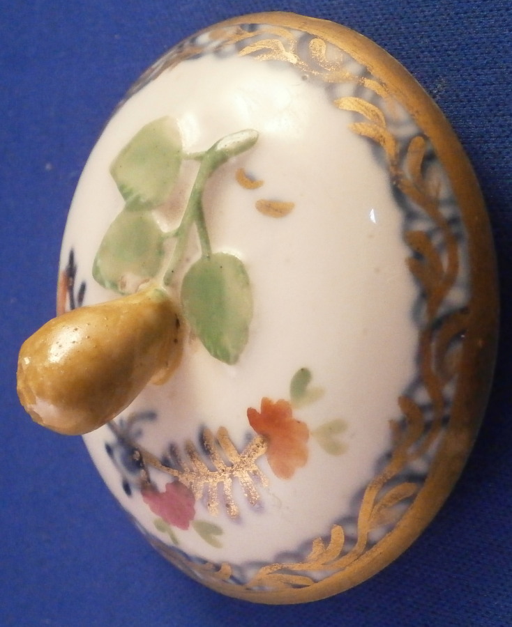 This is a lid made by Royal Vienna in the later 18th century. It is hand painted with a typical under glaze blue design and was then painted with polychrome flowers and gilding outside the factory. A very common thing to find on this style which it is called Clobbered. The lid also has a nice pear shaped finial with its leaves. The piece good condition with a small chip to mainly the udnerside edge as shown. The lid is about 1 inch tall and 2.625 inches in diameter. The OD of the foot that would fit into the opening of the main body has a diameter of 2 inches. Not marked since lids never were but definitely by this maker from this period. Please email me for more information or photos.