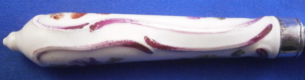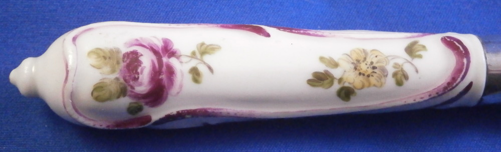 This is a rare knife handle made by Royal Viennaa in the 18th century. The handle is made of porcelain and has a relief design to it highlighted in puce plus two hand painted flowers to the top and two more on the bottom. A really nice looking handle! It comes with a blade and ferrule that are probably Silver though the markings are a bit off - looks like the blade is makred four times with the same mark. So I am not 100% on it being silver. Have a look for yourself! A great looking combo though with that superb porcelain handle and the silver blade! The porcelain and silver are in superb condition with a minor touch of wear to the porcelain. It displays perfectly! Not sure if the blade is contemporary to the porcelain or a later replacement but given the condition I assume it is a later replacement! The entire knife and handle are 9 inches long with the porcelain handle being 3.125 inches long, 0.75 inches wide and tall. Please email me for more information or other pictures.