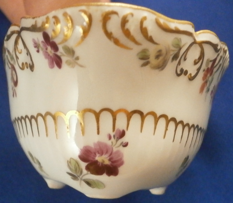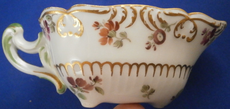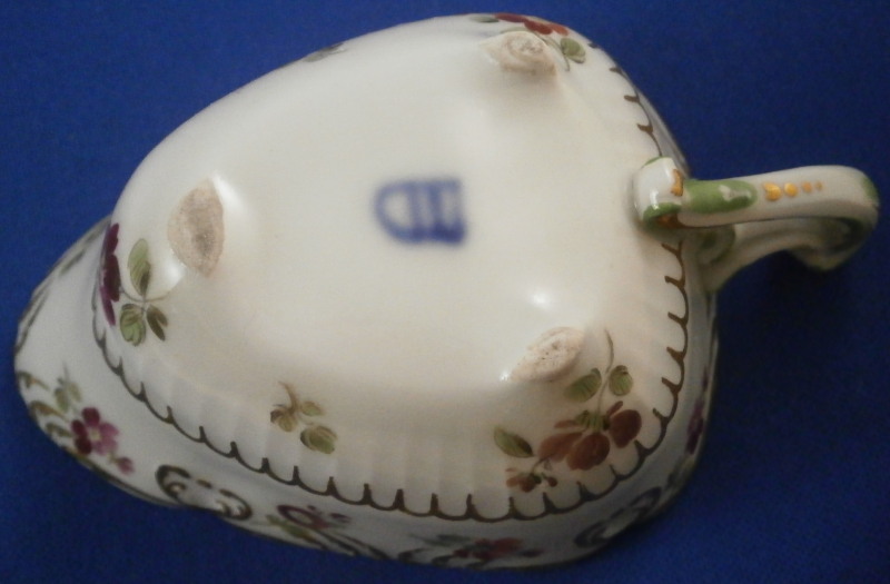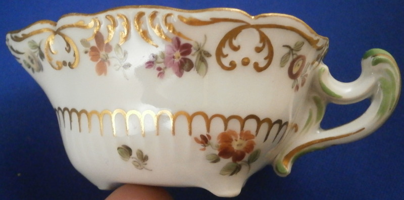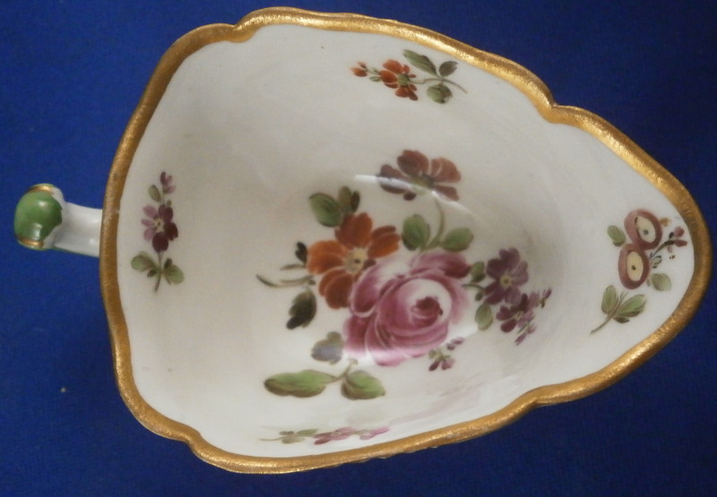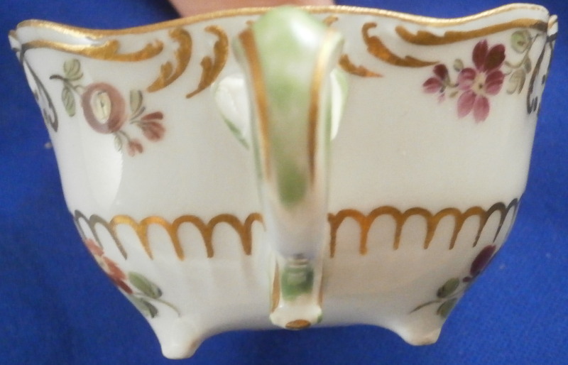 This is a fun little piece made by Royal Vienna in the 18th century. It is an individual sauce boat or cream dish hand painted with a nice floral arrangement on the inside as well as single flowers scattered throughout, some nice gold trim some of which highlights molded designs and a superb handle with green trim to it. Really nice shape and it is in perfect condition. The creamer / sauceboat is 1.625 inches tall, 4 inches long and just over 2.5 inches wide. It is marked with the blue beehive / shield mark on the underside as shown. Please email me for more information or photos.