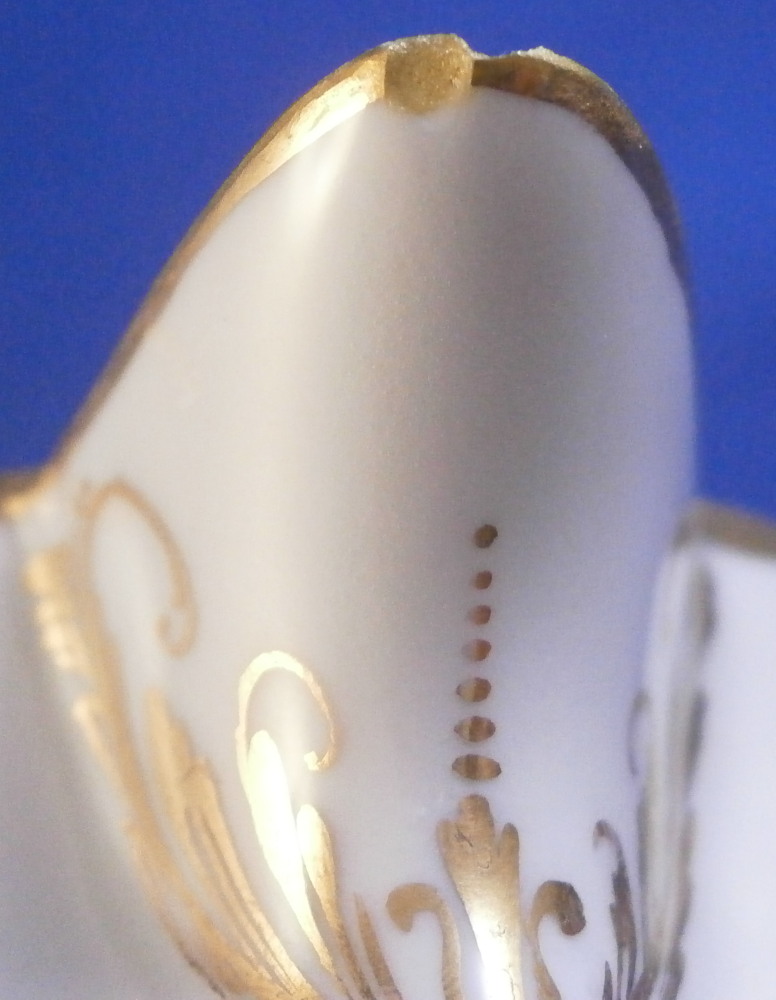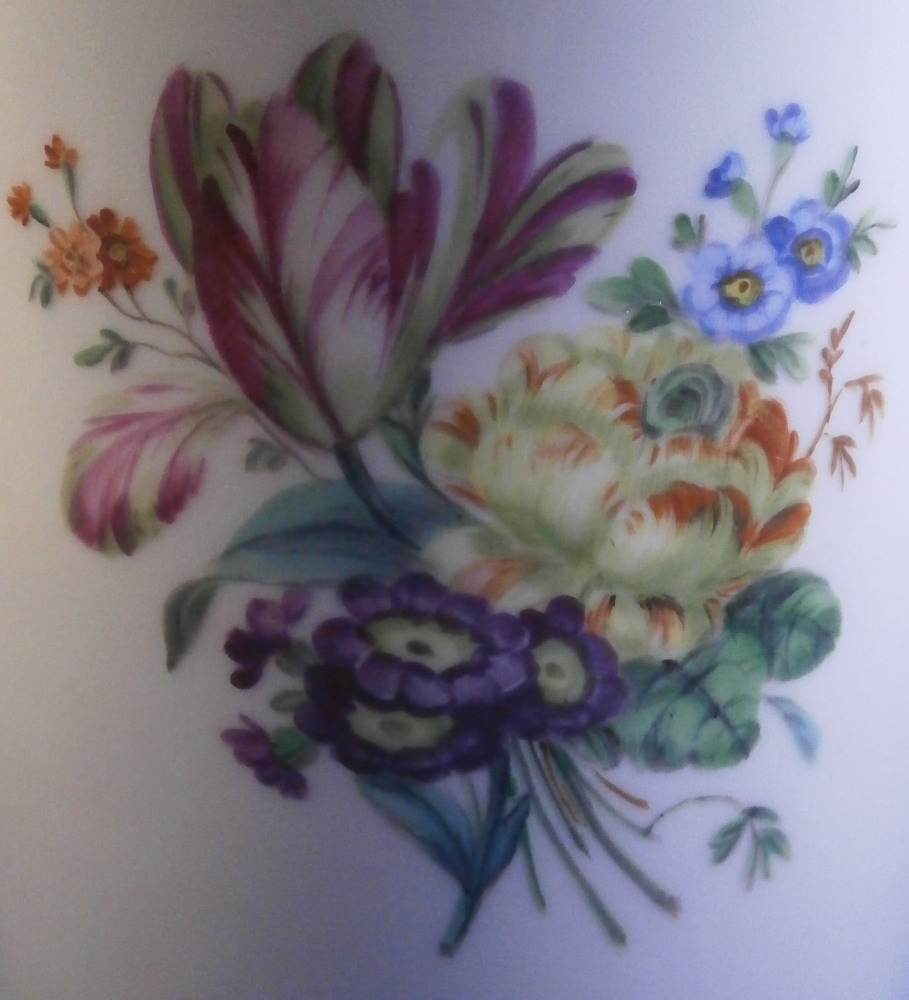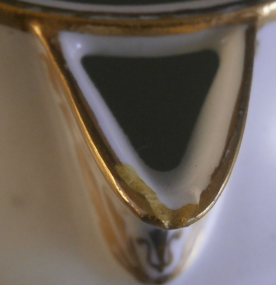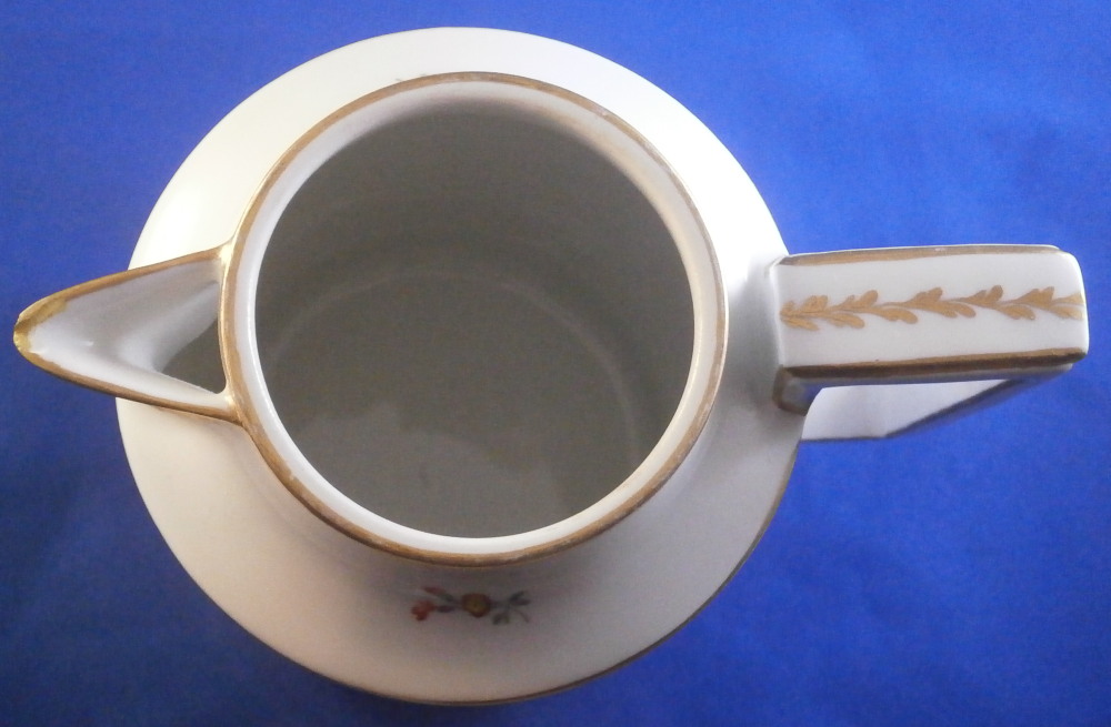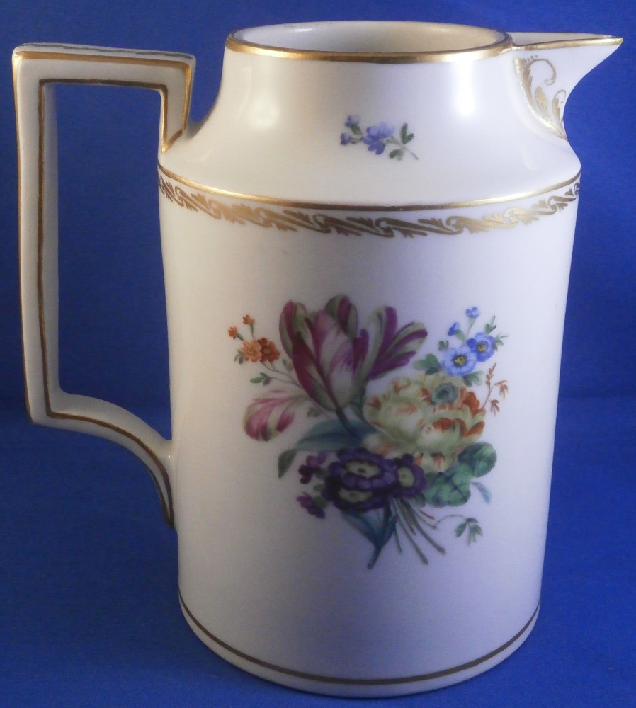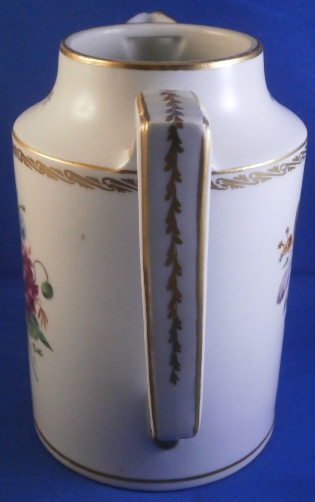 This is a great coffee pot made by Royal Vienna in the 18th century before they used their date code system - so before 1783. The pot is hand painted with a nice floral arrangement to each side as well as a single small flower near the handle and spout. The rim of the main body also has a single flower to either side and the lid has three. A nice gold trim to the top edge of the main body, lid edge as well as the spout and handle plus a nice design to the finial of the lid. The pot is in great condition with just some minor chipping to the spout tip as shown gilded over to hide them better. Two black firing spots on the white ground. The gilding is in superb condition! The pot is 7.125 inches tall including the lid, 5.75 inches from handle to spout end and about 4 inches in diameter. The bottom is marked with the under glaze beehive / shield mark as well as an incised number 2 and a painter's number 36 which is for Michael Schulz I believe. Please email me for more information or photos.