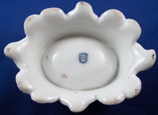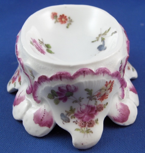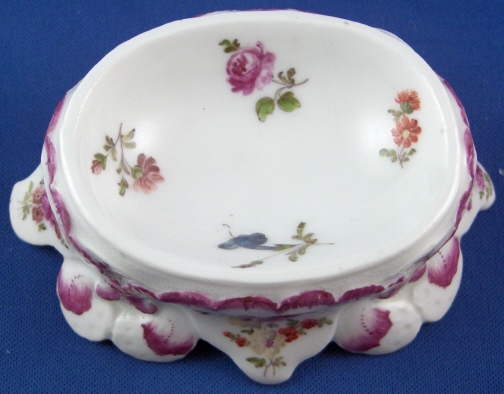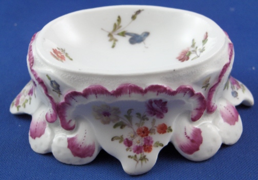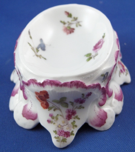 This is an open salt dish made by Royal Vienna in about 1770. It is handpainted with four flowers on the inside, four floral arrangements on the outside and has lots of nice rococo scrolls all around highlighted with a puce trim. The piece is in perfect condition. The salt dish is 1.375 inches tall, 4 inches wide and 3 inches deep. It is marked underneath with the underglaze blue shield or beehive mark as well as a red number 36 likely a painters mark. Please email me for more information or photos.