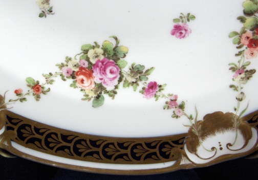 This is a porcelain plate made by Royal Vienna in 1808. It is handpainted with great attention to detail with flowers and flower garlands as well as a superb gold trim with dark blue and a shell design. It is a soup plate and it is in great condition. Tiniest of gold wear to the outermost rim. The plate is almost 10 inches in diameter and 1.75 inches tall. It is marked with the underglaze blue shield mark as well as a scratched in 808 which might have been added later when they realized they forgot the impressed mark. The flowers and the shell design rim seem to be a design from an earlier period to me. Please email me for more information or photos.
