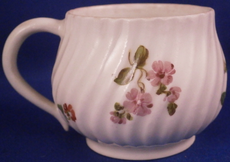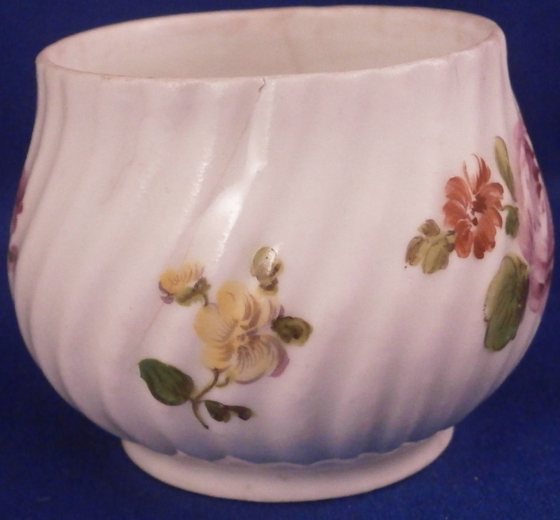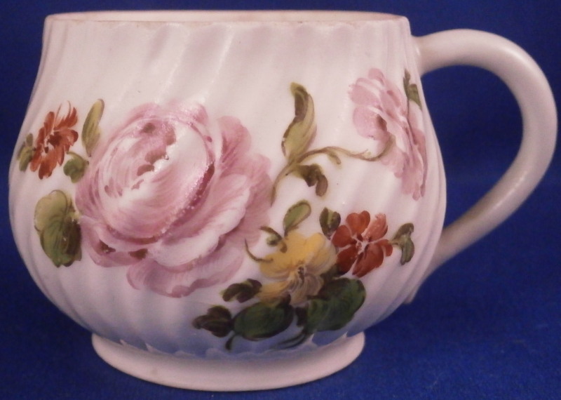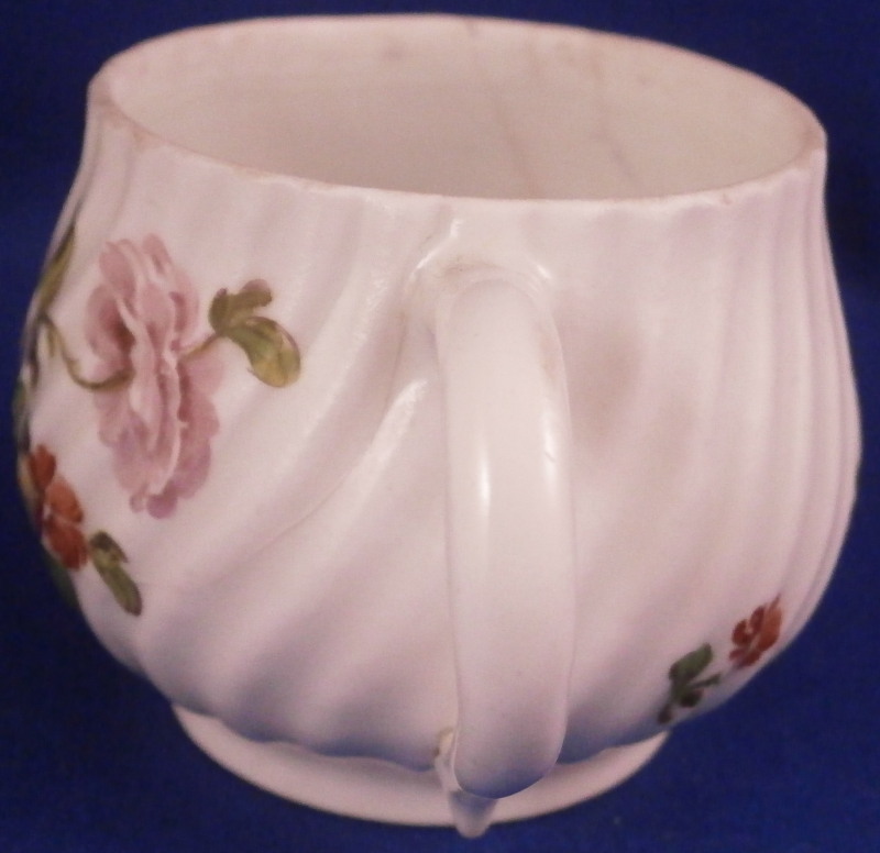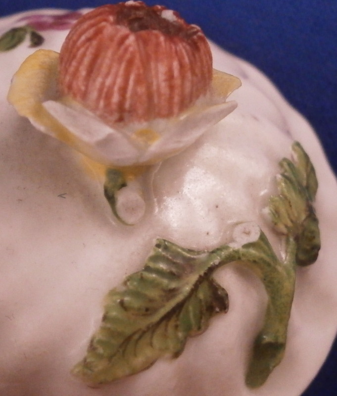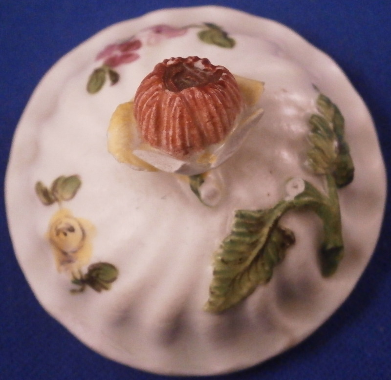 This is a nice pot de creme or pot au jus made by Royal Vienna in the 18th century before (but not much) 1783. The little lidded cup would have been used either for hot chocolate or a meat broth . Both the main cup and lid have a nice relief design to the paste and are hand painted with some nice flowers - two large arrangements to the cup as well as a single smaller flower and two smaller flowers to the lid. Nice floral finial to the lid with its stem and two leaves. The set is in OK condition with two petals of the finial having chipped off and the stem of the finial is missing as well. The main cup has a hairline across the bottom terminal of the handle likely because it had separated a bit from the body during the firing process and created a fining crack at that point and two long hairlines to the cup going from the top edge into the cup with one going sideways after that as shown. The set still displays nicely and is quite cute. The cup with the lid in place is 2.75 inches tall and 2.25 inches in diameter. The underside of the cup is marked with the under glaze blue beehive / shield mark as well as a red 27 as the painter's mark , an impressed i and an incised line near the painter's mark. Please email me for more information or photos.