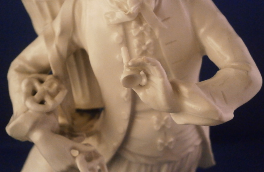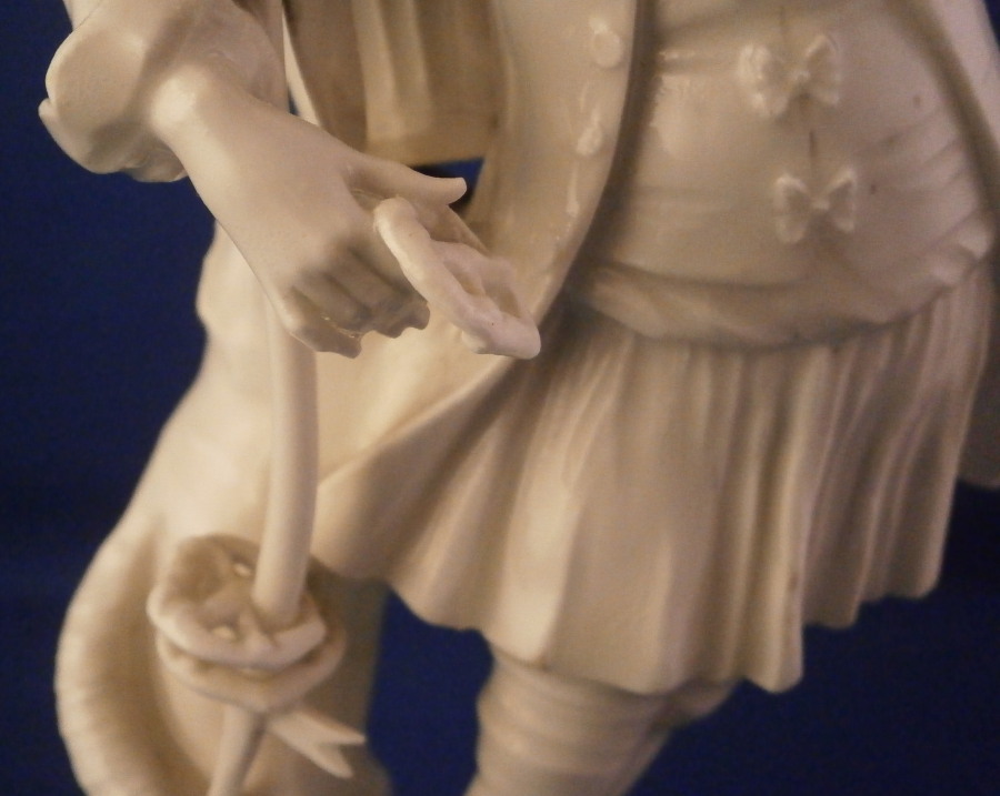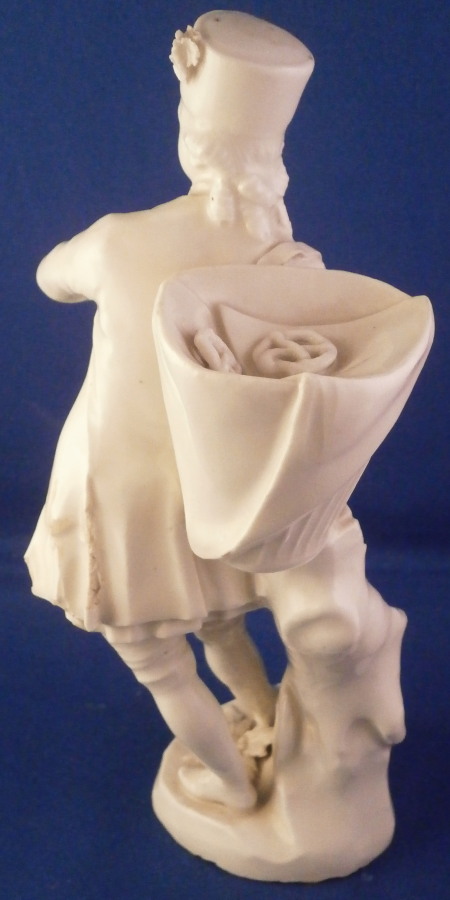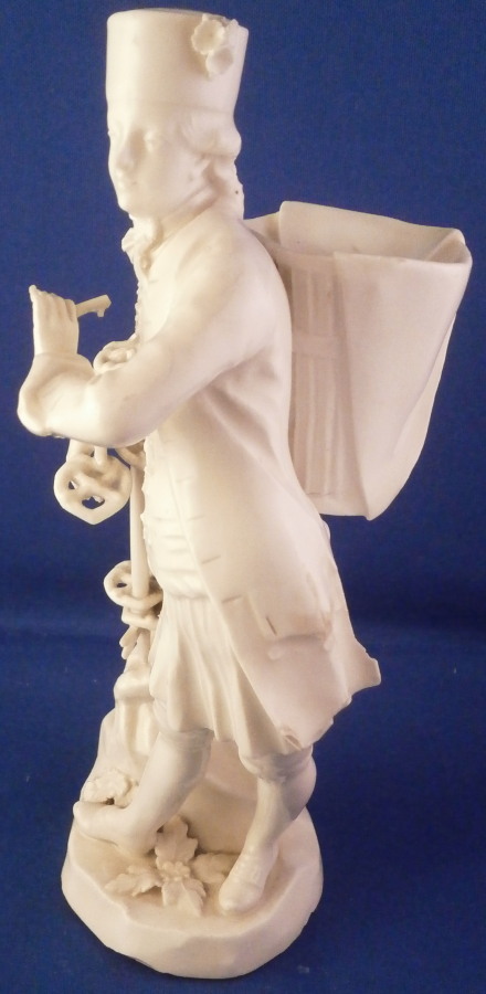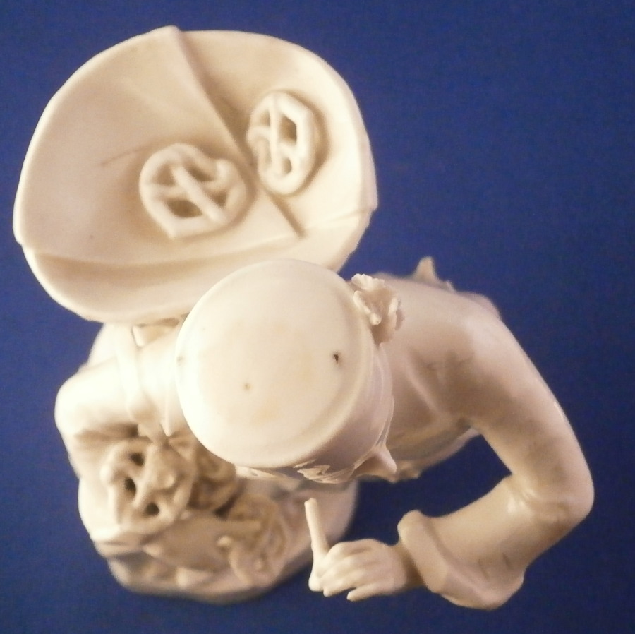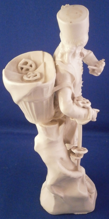 This is one of the Vienna versions of the Cris de Paris type street vendors in Wien Austria instead of Paris. Here we have the pretzel seller made by Royal Vienna in the mid 18th century around 1760. He is part of an entire series but they are really hard to find and I ahve never seen this figure in white. Modelled superbly and quite typical of early Vienna figurines. He has a little trumpet in his left hand to attract the attention of the people, has a basket with a cloth on top and a couple of pretzels in it on his back and a stick holding a few pretzels on his right with a pretzel in his right hand. A couple of flowers on the base. It is really a superb figurine! The figure was left in the white to show off the nice details of this figurine and it is in good condition for the age. The tip of the pretzel stick is missing and there is some damage to the back left coat are as shown and possible a bit of damage to the top of the flowers on his hat but that is ahrd to tell plus some staining to the top of his hat. That all being said he really is in remarkable condition for the age and all those tiny fragile details! Fingers and pretzels are fine as is the trumpet, etc. The figure is 7.625 inches tall, 3.5 inches wide and 3.5 inches deep. Marked underneath with the blue beehive / shield mark as shown. Please email me for more information or photos.