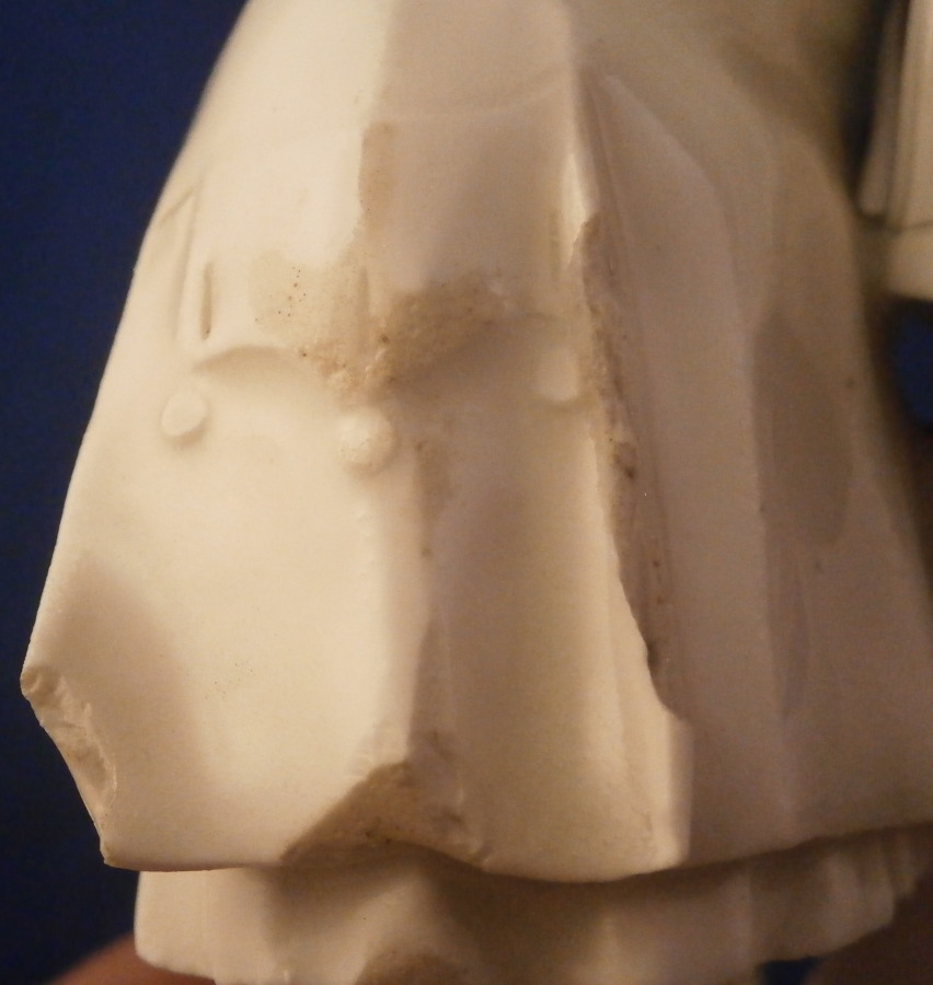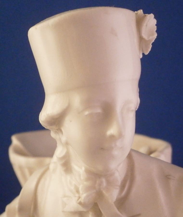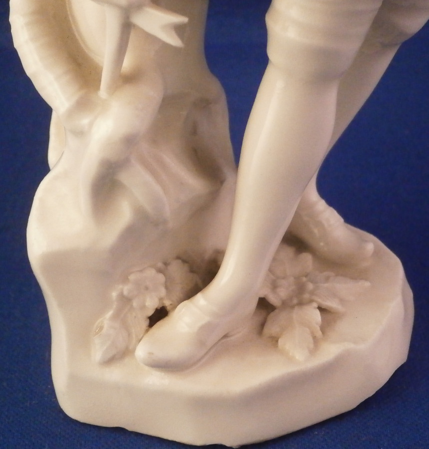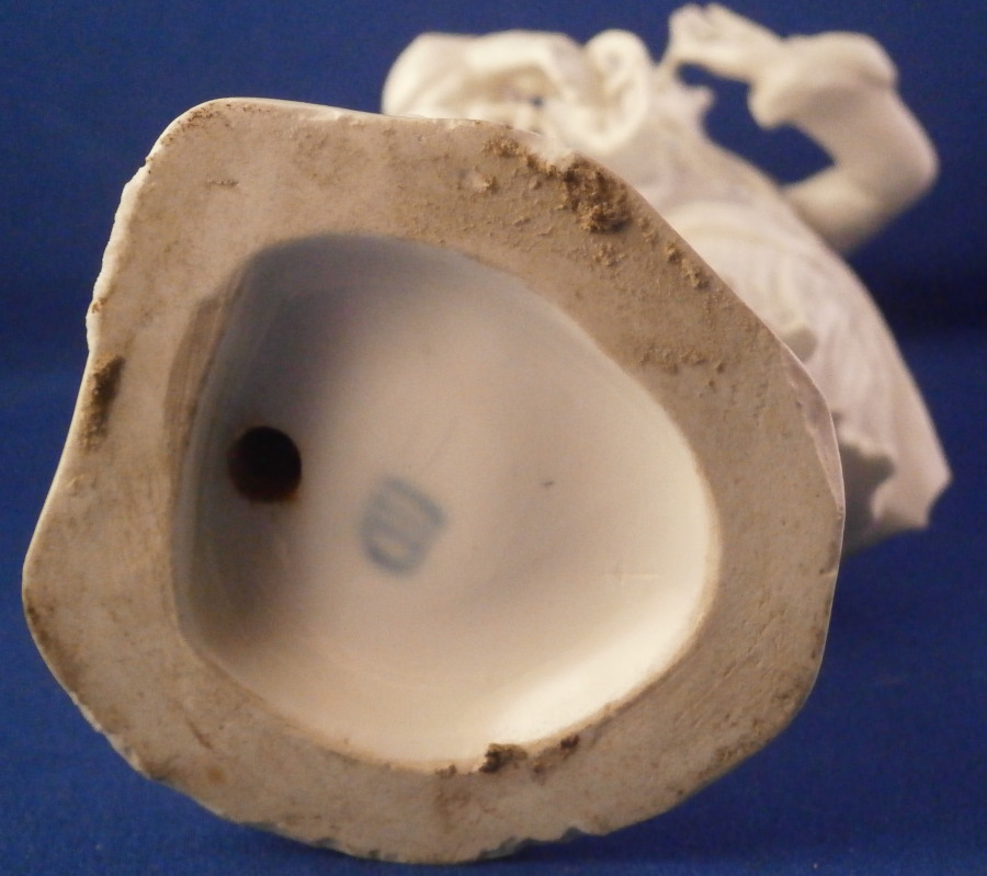 This is one of the Vienna versions of the Cris de Paris type street vendors in Wien Austria instead of Paris. Here we have the pretzel seller made by Royal Vienna in the mid 18th century around 1760. He is part of an entire series but they are really hard to find and I ahve never seen this figure in white. Modelled superbly and quite typical of early Vienna figurines. He has a little trumpet in his left hand to attract the attention of the people, has a basket with a cloth on top and a couple of pretzels in it on his back and a stick holding a few pretzels on his right with a pretzel in his right hand. A couple of flowers on the base. It is really a superb figurine! The figure was left in the white to show off the nice details of this figurine and it is in good condition for the age. The tip of the pretzel stick is missing and there is some damage to the back left coat are as shown and possible a bit of damage to the top of the flowers on his hat but that is ahrd to tell plus some staining to the top of his hat. That all being said he really is in remarkable condition for the age and all those tiny fragile details! Fingers and pretzels are fine as is the trumpet, etc. The figure is 7.625 inches tall, 3.5 inches wide and 3.5 inches deep. Marked underneath with the blue beehive / shield mark as shown. Please email me for more information or photos.