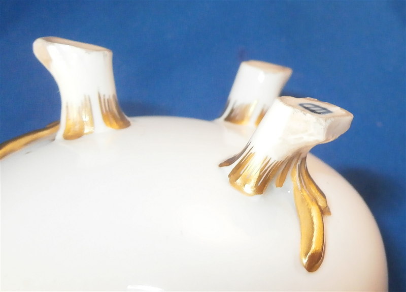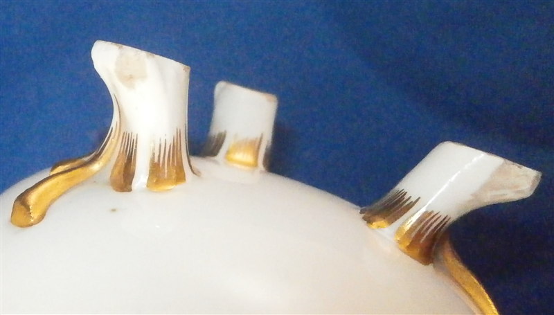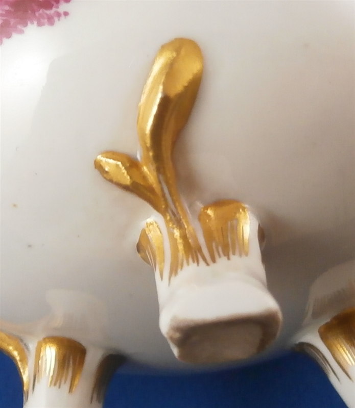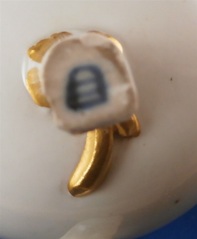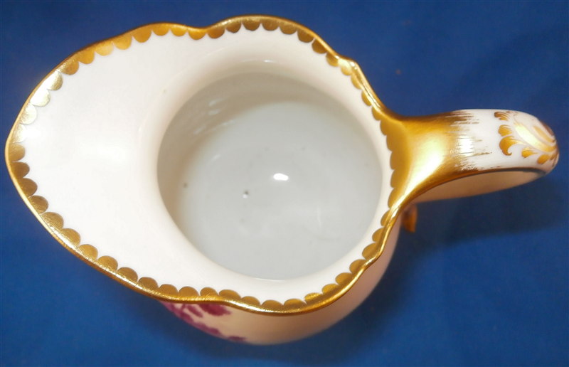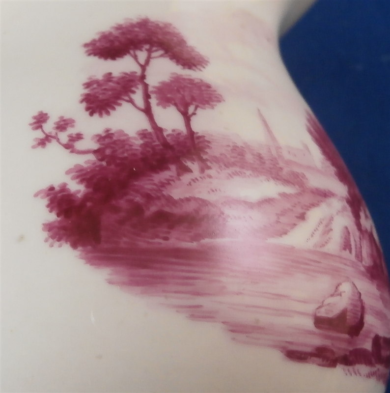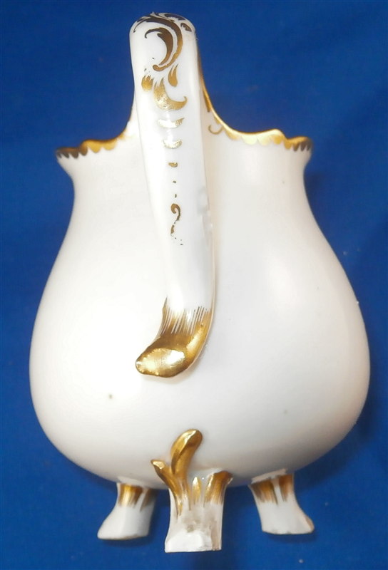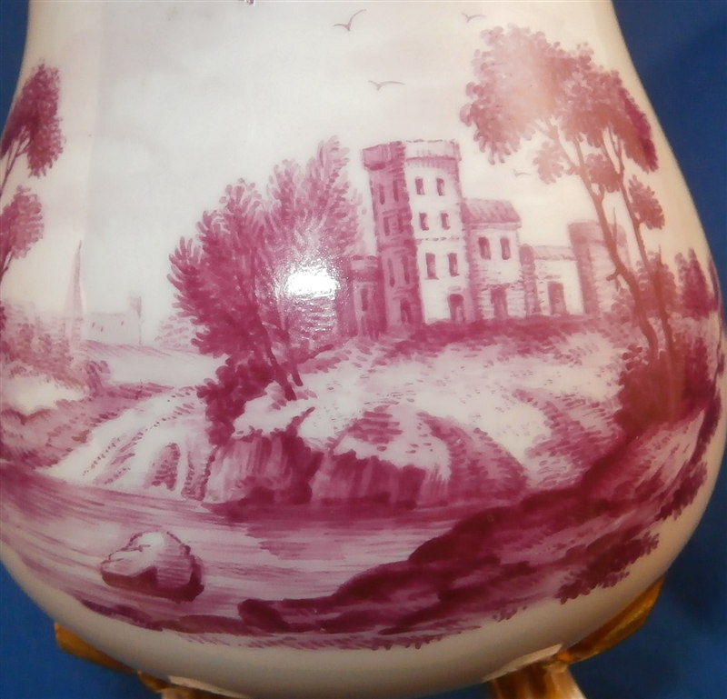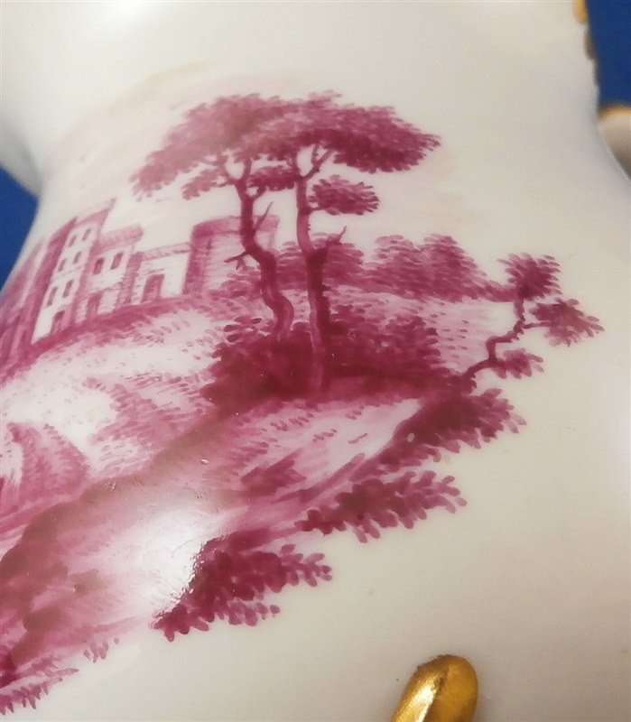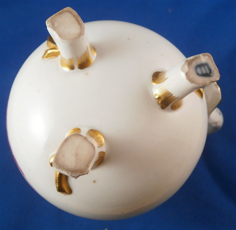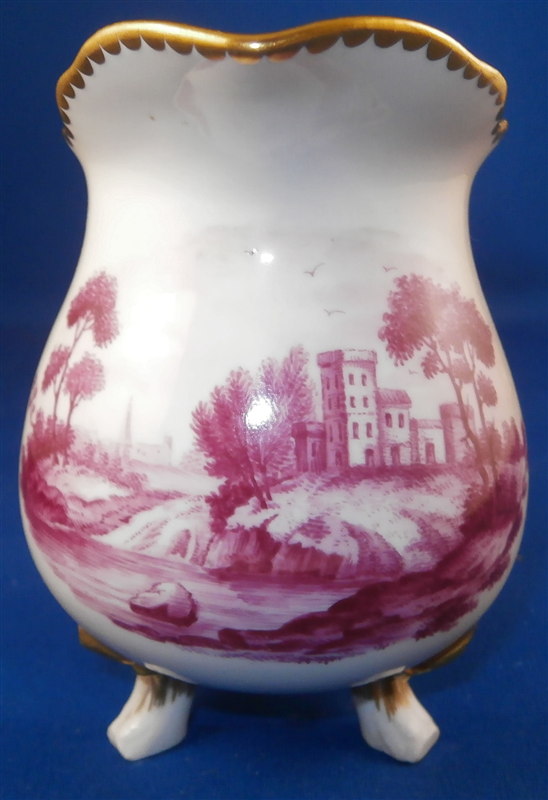 This is a rare creamer / milk jug / pot à lait à trois pieds made by Vienna around 1770. A rare piece handpainted with a very nice landscape scene in puce in the front including buildings, trees and some water. Nice gold trim to the edge, feet and handle. They creamer is marked underneath one of the feet with their blue beehive / shield mark as shown. This piece is in great condition with some small chips to the edges of the feet as shown - nothing that takes away from this fun piece! The creamer is 3.875 inches tall, about 4.125 inches including the handle and spout and has a diameter of about 2.75 inches. Please email me for more information or other pictures.