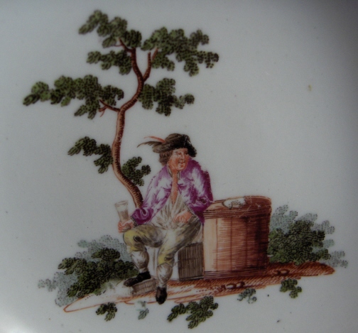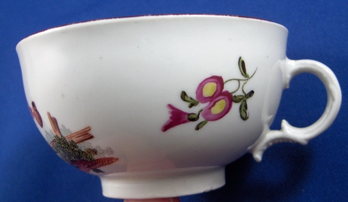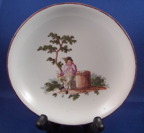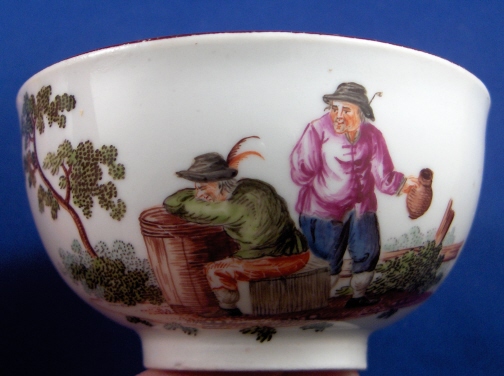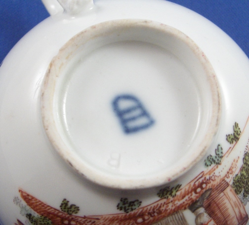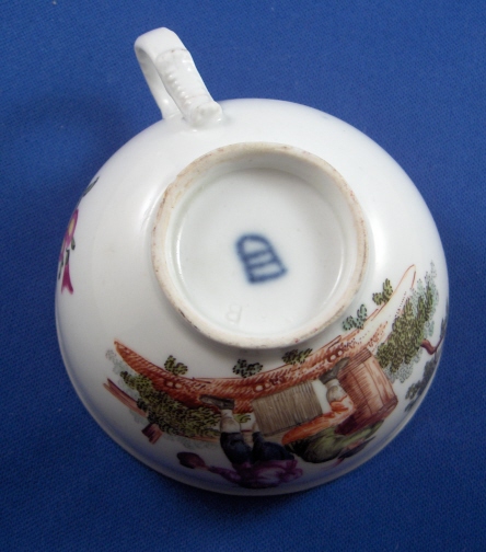 This is a superb cup and saucer made by Royal Vienna in about 1760. It is handpainted with two superb scenes one on the cup and one on the saucer. Also two small flowers on the outside of the cup and one on the inside bottom. Nice brown trim to the rims. The handle is also nice. Both the cup and saucer are in great condition - the cup just has minimal wear to the brown trim as does the saucer. The saucer also has a little wear to the scene and a small outside rim chip. The cup is 1.75 inches tall and 3.25 inches in diameter. The saucer is 1.125 inches tall and 5.5 inches in diameter. Both are marked with the underglaze blue shield mark as well as an incised letter B (I think) on the cup and an impressed 8 on the saucer with the letter I next to it. Please email me for more information or photos.