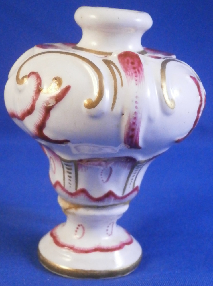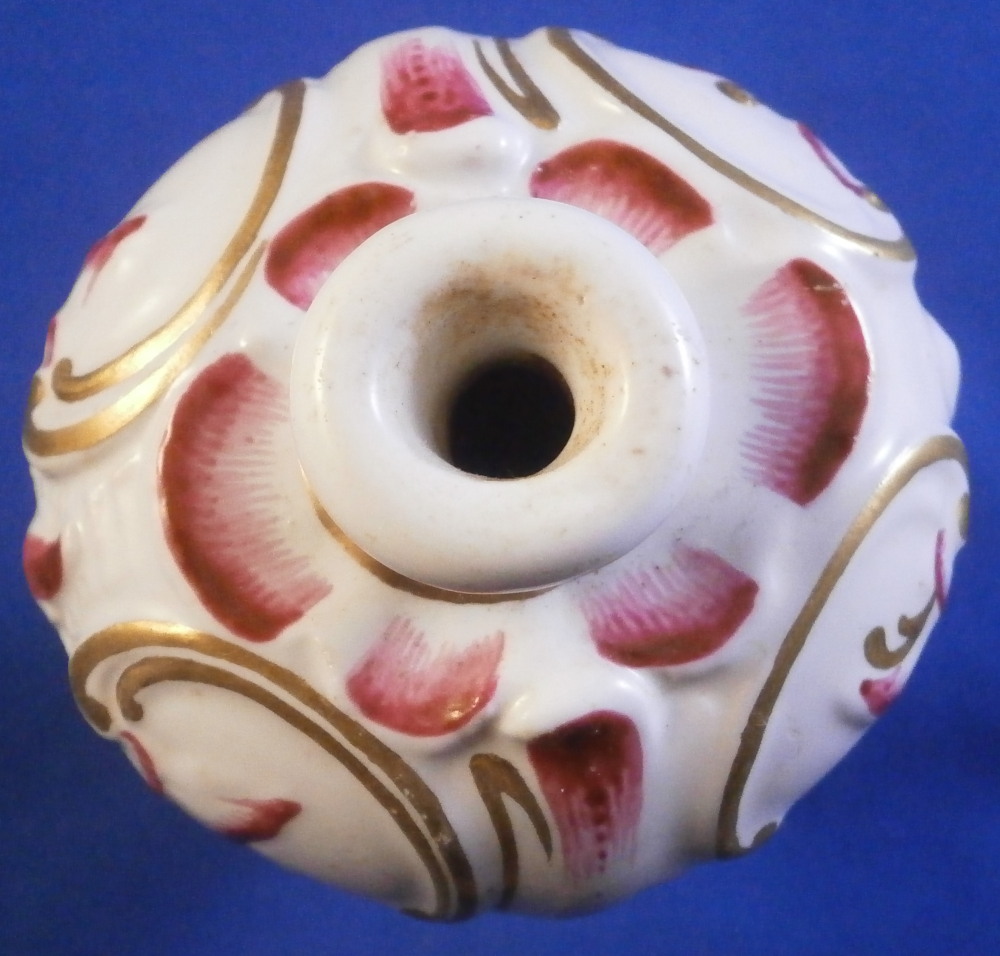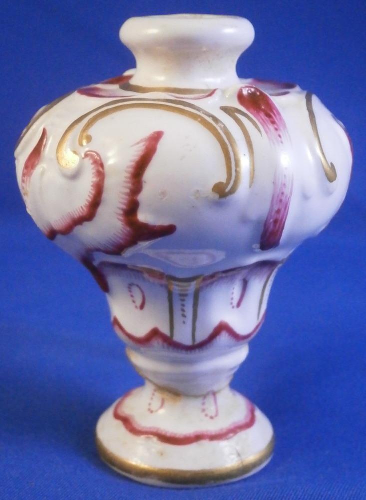 This is a small vase or maybe a scent bottle made by Royal Vienna in about 1770. The Vienna examples I found has a square base attached to the bottom which this one here does not. Does not mean much but it could also be by another maker during this period. It has a nice shape to it with lots of relief details highlighted with gilding and puce trim. The piece is in OK condition but was broken through the thin part of the bottom and reglued with some nasty old glue. Could easily be imrpoved or made to look perfect again by a decent restorer! The vase is 2.75 inches tall and 1.875 inches in diameter. It is not marked underneath. It could also be Italian possibly Cozzi by the look of the paste and colors. Please email me for more information or photos.