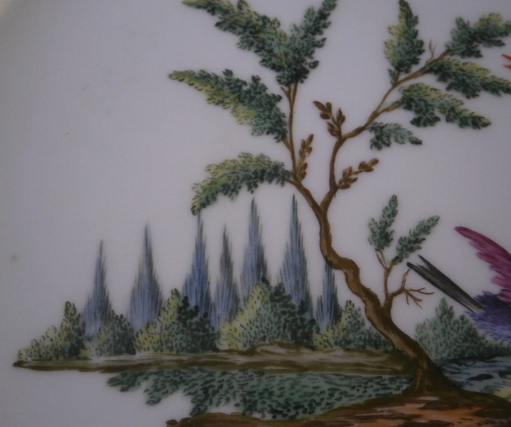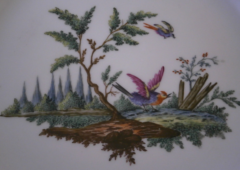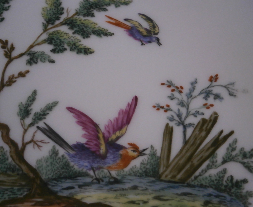 This is a superb plate made by Royal Vienna in the 18th century before they used date codes. It is hand painted with a really nice bird scene in the center including two colorful birds - one on the ground and one flying above. Nice landscape all around that is of especially nice quality. The style definitely reminds me of the famous Fidelle Duvivier but he never worked at the Vienna factory. The rim of the plate has four polychrome flowers as well as four gold flowers to it and a gold band along the edge. It's a stunning looking plate! The plate is in great condition with a minor touch of stacking wear and a minor touch of wear to the gilding. Displays perfectly! It is 1.25 inches tall and 9 inches in diameter. It is marked with the under glaze blue beehive / shield mark as well as an impressed 34 or 37 as shown and an incised Z or N. Please email me for more information or photos.