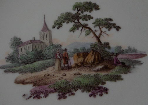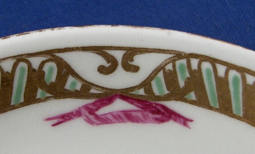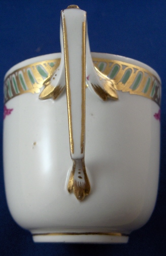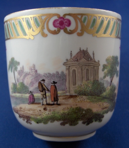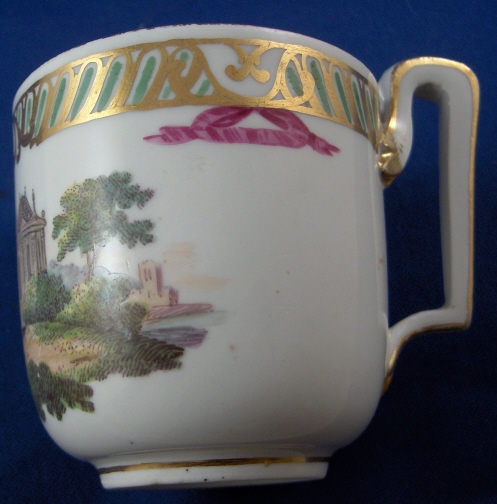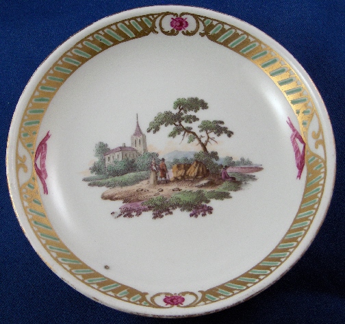 This is probably the nicest cup I have seen made by Vienna in quite some time. It dates to around 1784 though the date codes are hard to read. Both the cup and the saucer are handpainted with a superb polychrome scene as well as a fancy gold and green trim to the rims with puce flowers and bows. Nice handle shape to the cup. Both pieces are marked with the underglaze blue shield mark, an impressed 3 underneath the cup and a double digit date code of which the last digit is clearly visible on the cup - a 4 and the first digit on the saucer - an 8. There is also a gilder's mark on the saucer 41. The set is in perfect condition with wear to the gold trim on the top edge of the cup and saucer. A tiny bit of wear to the people in the scene of the saucer. A black firing spot on the saucer and one tiny flake in the green of the scene on the cup. All in all as perfect as they come! The cup is just under 2.5 inches tall (not including the handle) and 2.375 inches in diameter. The saucer is 1.125 inches tall and 5.375 inches in diameter. Please email me for more information or other pictures.