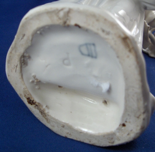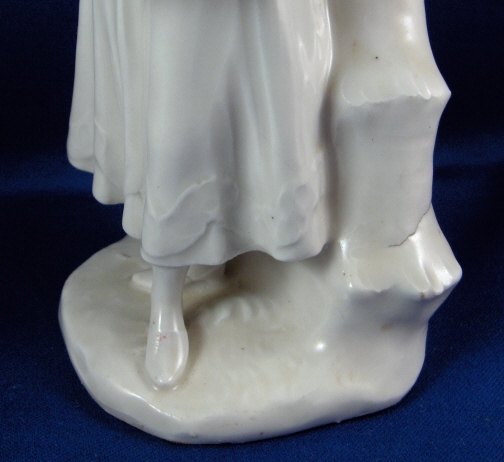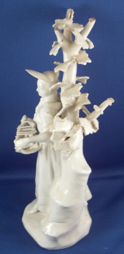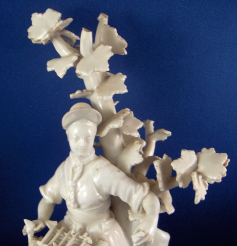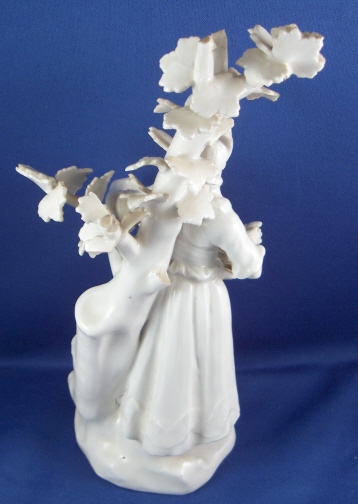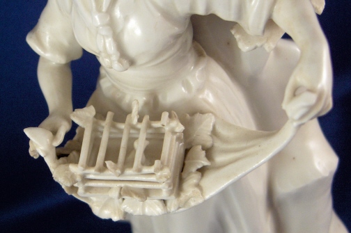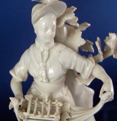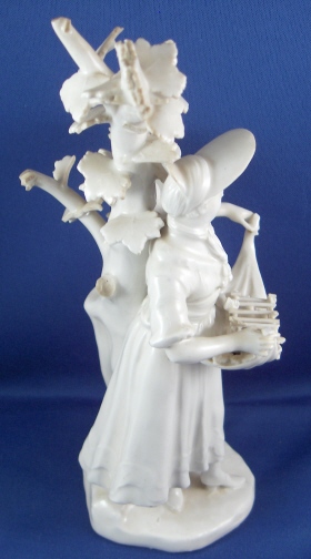 This is a superb figurine of a lady with birdcage made by Royal Vienna around 1760. The figurine is nicely modeled and left in the white to show of all the detail and the quality of the porcelain itself. These white pieces were more valuable than the colored ones back then! The lady is wearing a hat and has a bird in the birdcage in her apron. A tree behind her. The piece is in superb condition with one piece of the birdcage broken and the leaves in that area all have a bit of damage. Amazingly the lady is perfect! The tree is in good shape as well but I think there is an entire branch missing in the back and three of the five ends are damaged. Most of the leaves one sees from the front are perfect still which always amazes me! There are two firing cracks - one in the tree trunk towards the bottom and one where the trunk and the back of her skirt meet. The figure is 8.5 inches tall, 3.5 inches wide and 2.875 inches deep. Marked underneath with the underglaze blue shield mark and an impressed P. Please email me for more information or photos.