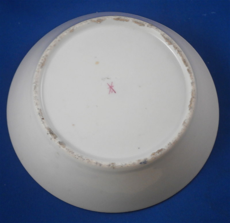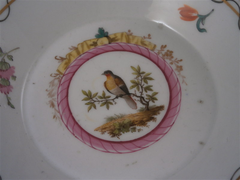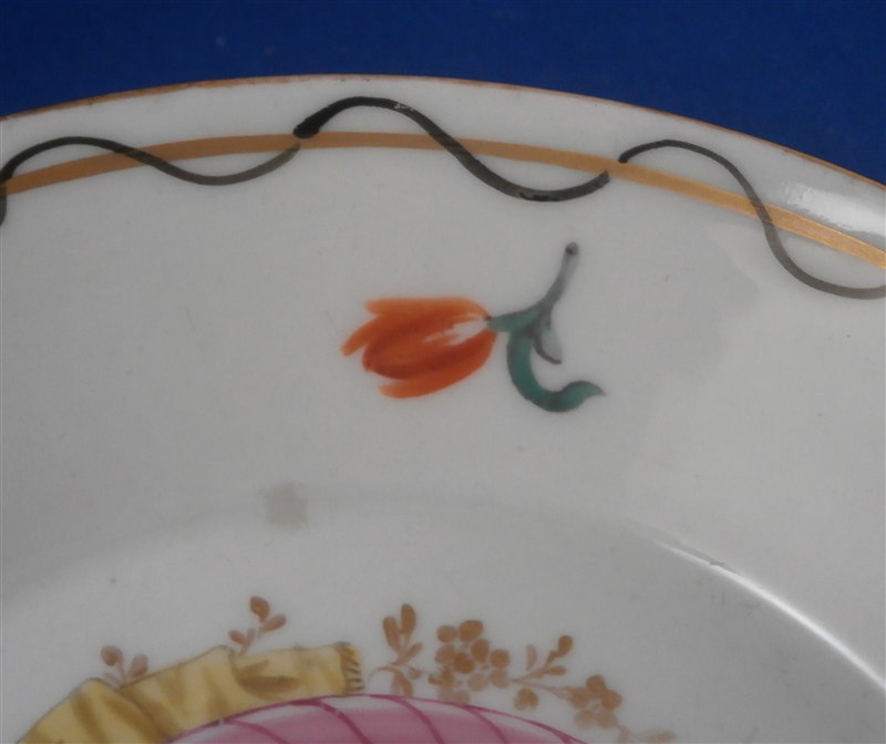 This is a saucer made by Volkstedt in the 18th century. This saucer is handpainted with a scene of a bird sitting on a branch in a landscape surrounding in the center with a puce ring around the scene with a nice design to the top, three flowers along the rim and a nice black and gold design to the rim. The saucer is in good condition with some wear to the gilding. The saucer is marked underneath with the puce crossed hayforks mark as shown. It is 1.25 inch tall and 5 inches in diameter. Please e-mail me for more information or photos.