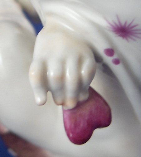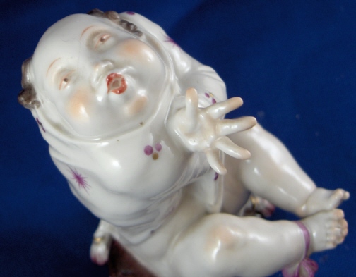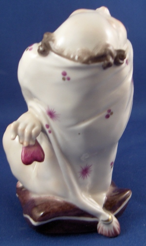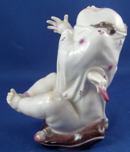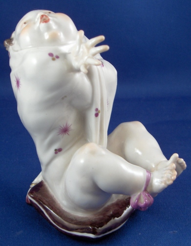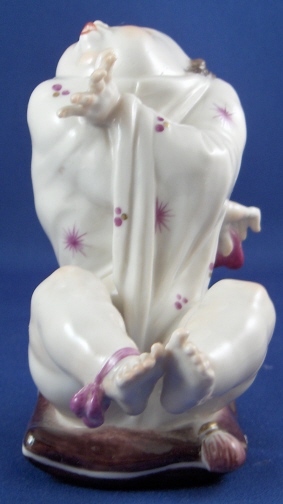 This is a rare figurine made by Volkstedt around 1925. Volkstedt was founded in 1762 and is one of the few makers of the Thuringia region that are still around today. This figurine is special because it was made by the famous Emil Paul Börner who later worked at Meissen and became one of the most famous modellers of this time period going mostly under just Paul Boerner. Some of my favorite modern pieces are by him! I cannot actually find another one of this model but have owned the naked lady from the same series which is also on my website! This figure is of a half bald man waering a funky shirt, sitting on a pillow with a bow around his right ankle and holding a heart behind it as if to hide it and pretend he knows nothing about it. The piece is in the typical style of Borner! No detail was spared at all! Very much in the Art Nouveau / Jugendstil taste. I usually prefer the 18th century stuff but this one was a must have :) This figurine is in perfect condition and definitely rare. It is marked with the underglaze blue mark for Volkstedt Rudolstadt used from 1915 to about 1936. Also impressed EB (for Emil Borner) 117. The figure is 4 inches tall, 2 inches wide and 3.5 inches deep. Please e-mail me for more information or photos.