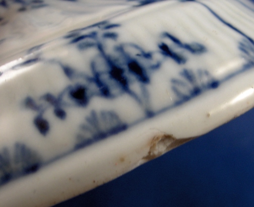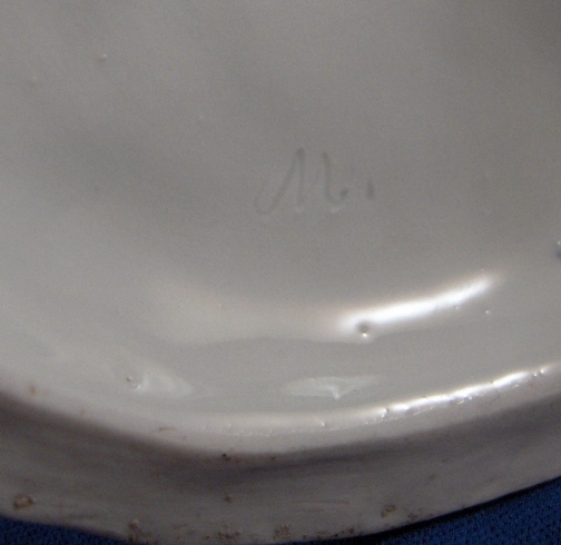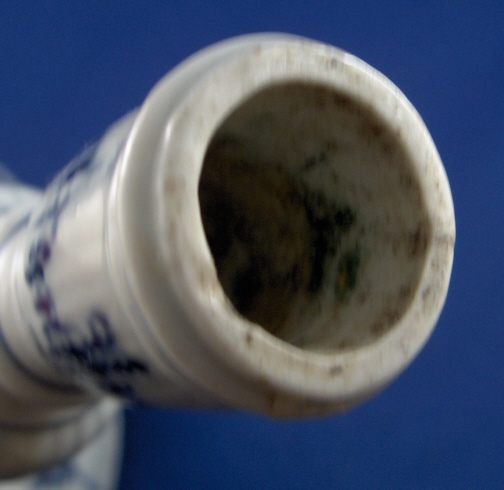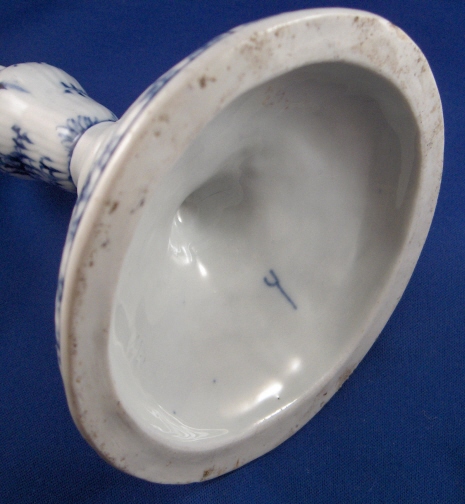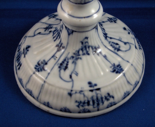This is a candle stick made by Volkstedt around 1760. It is handpainted with the straw flower design in underglaze blue all around on a ribbed relief paste used often by Thuringia makers in the 18th century. It is marked underneath with the underglaze blue crossed pitchforks as well as a script M. The candleholder is in great condition with a few manufacturing flaws normal back then like firing cracks. There is a tiny chip to the top inside and one to the bottom rim which looks like it started from a manufacturing flaw. The piece is 8 inches tall and 5.25 inches in diameter. The top part for the candle is 0.875 inches in diameter and 1.5 inches deep. Please email me for more information or photos.